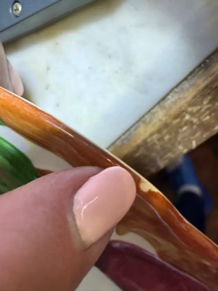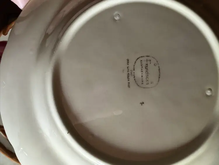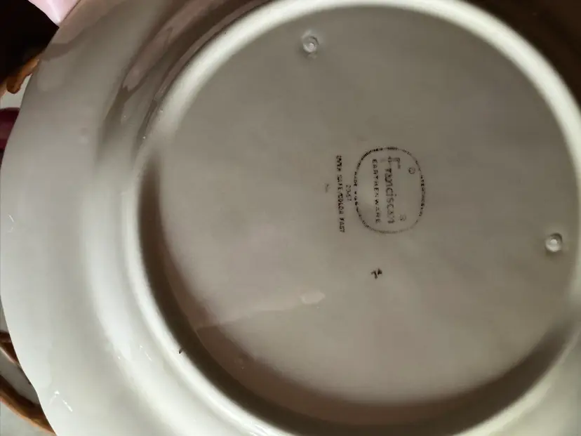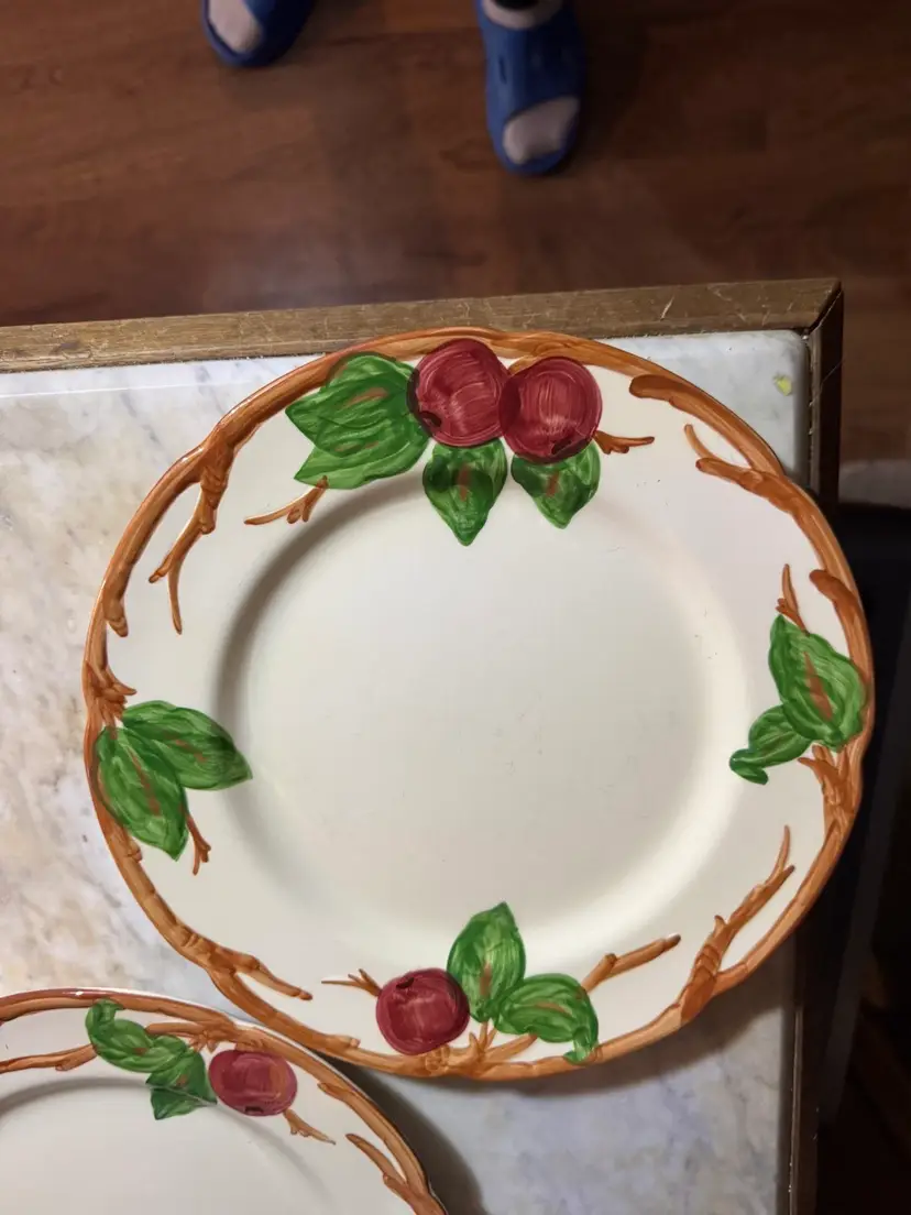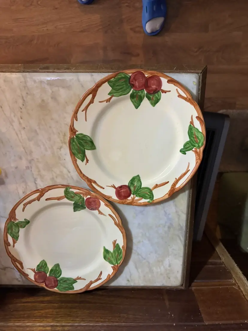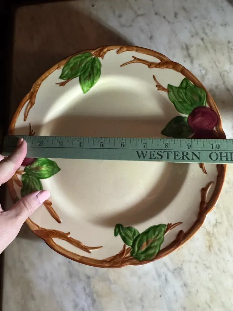 These dinner plates measure 10 5/8" in diameter and are in very good condition with one exception. There is a small flea bite chip or missing paint that may have happened during manufacturing. I have pictured all condition issues.
