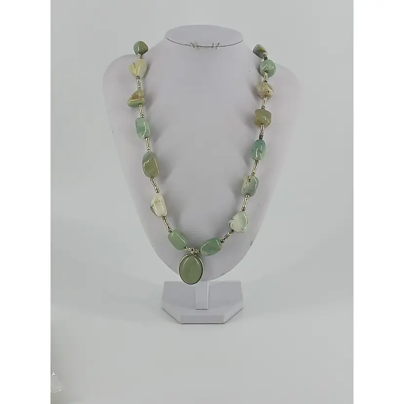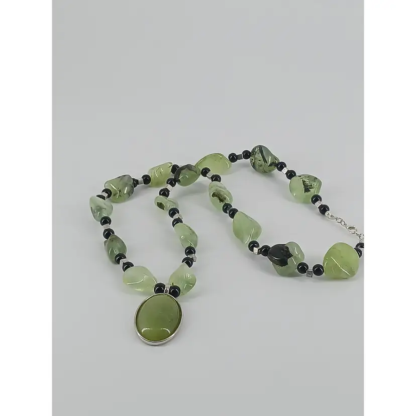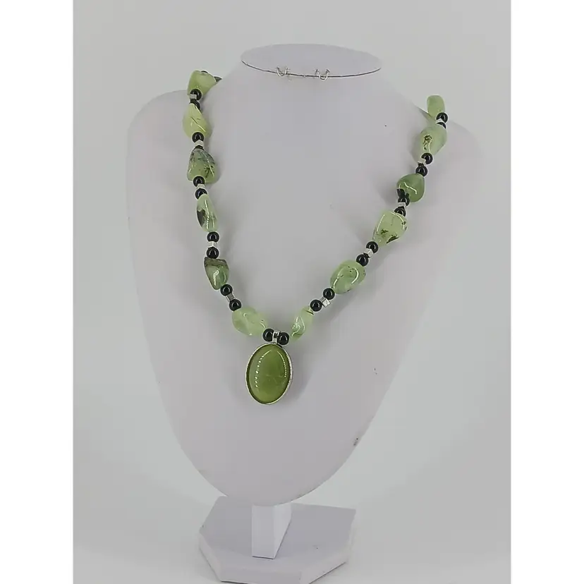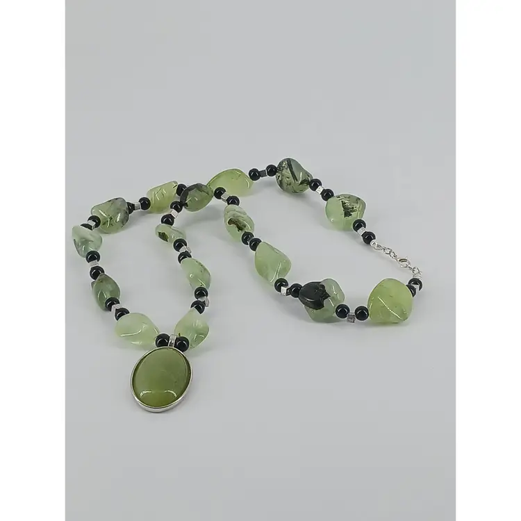 NMLot47 - 2 Gemstone Necklaces NM813 - Jade gem stone that measures 1 1/8 x3/4 inches has been mounted in a 15/16 x 7/8 inch silver plated opened back cabochon setting which is strung on a 24 inch necklace of Natural Jade large polished nuggets that are separated by black 3/16 inch glass beads and 1/8 inch silver plated square beads to make this necklace.