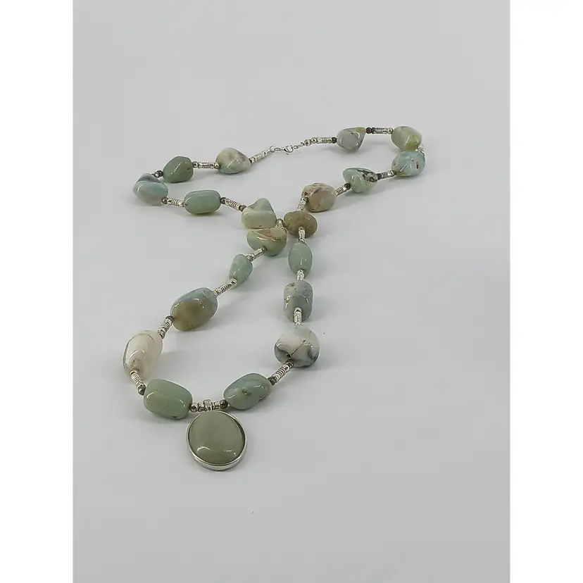 NM814 – Ching Hai Jade gem stone that measures 1 1/8 x3/4 inches has been mounted in a 15/16 x 7/8 inch silver plated opened back cabochon setting which is strung on a 30 inch necklace of Aqua Terra Jasper large polished nuggets that are approximately 13/16 x 5/8 x 9/16 inches and are separated by 3/8 x 1/8 inch and two 1/8 inch silver beads to make this necklace.