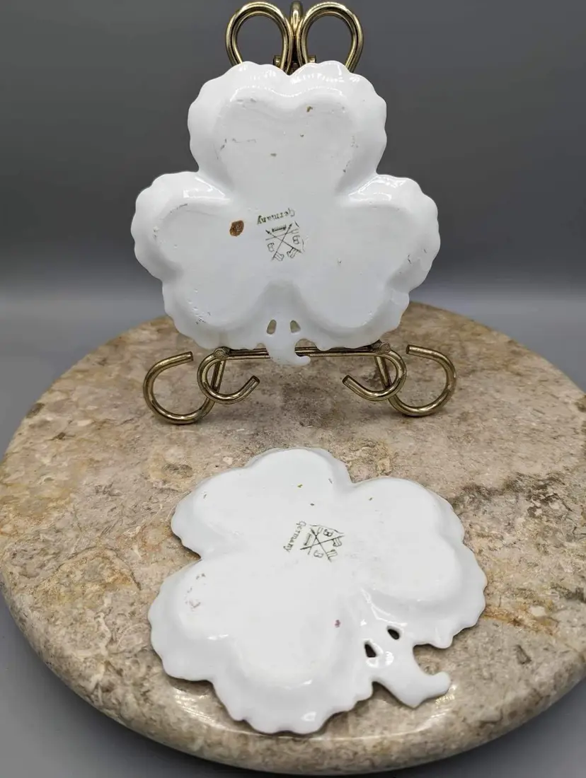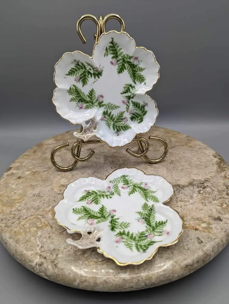 Add a touch of elegance to your collection with these two German porcelain clover-shaped trinket dishes. The delicate rosebud and fern pattern on the pink background gives these dishes a charming and timeless appeal. The dishes are perfect for storing small items like jewelry or as decorative pieces to add a pop of color to any room. 5” X 5” X 1/2” Beautiful condition No chips or cracks.