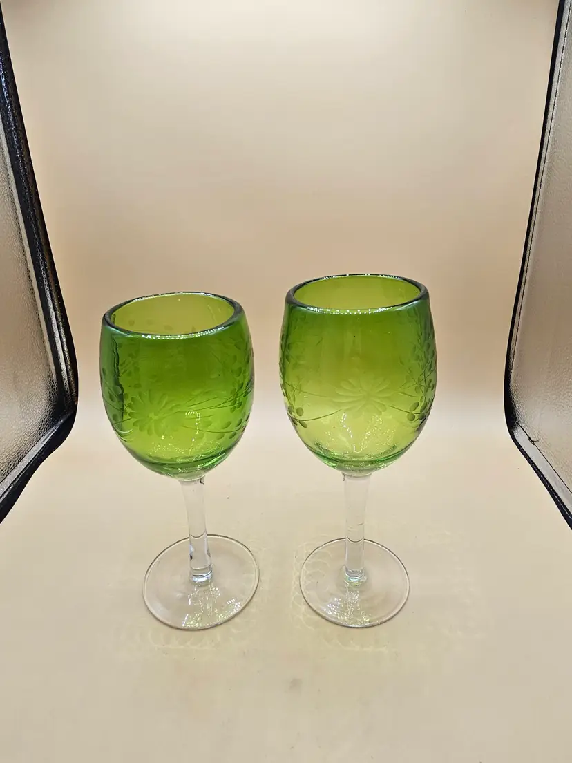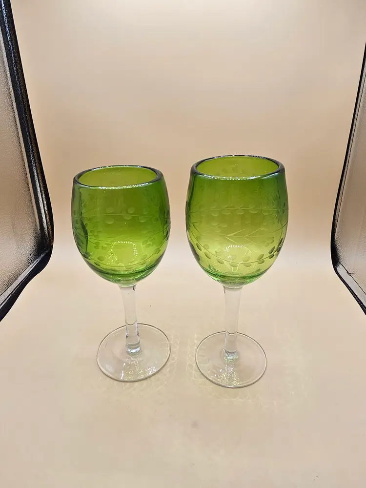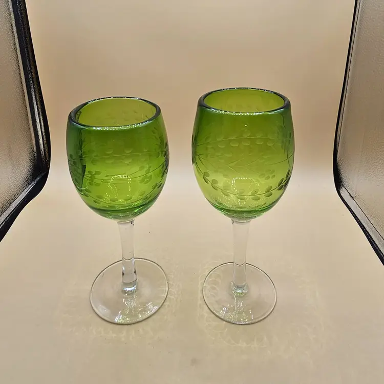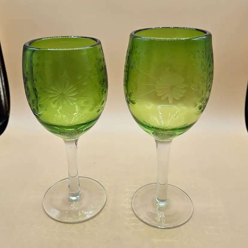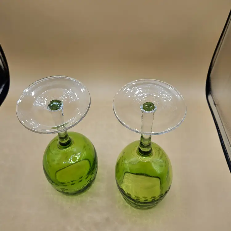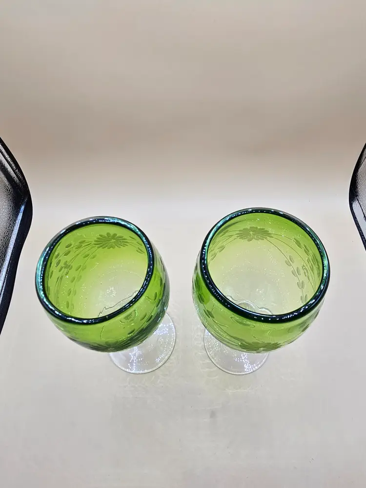 Tiny fleabite chip on the smaller one. Bubble inclusions SEE PICTURES. Glasses are 8 3/8" & 8 7/8".