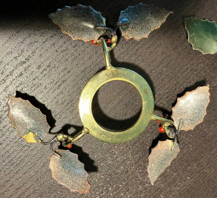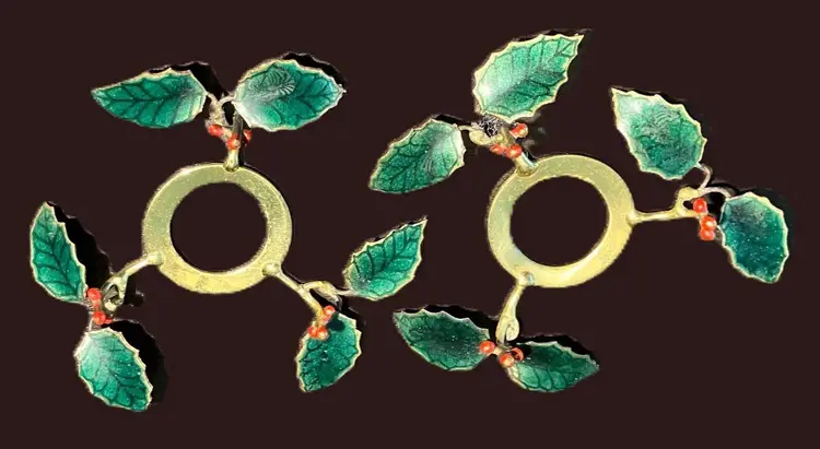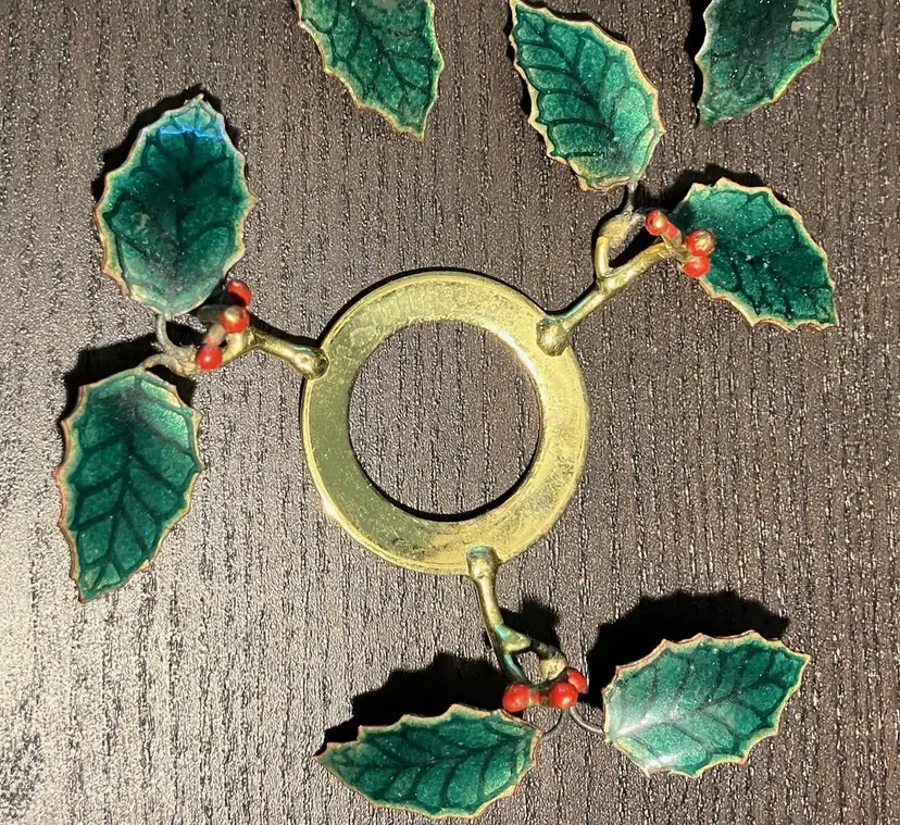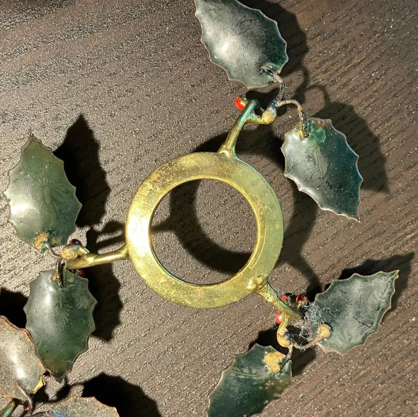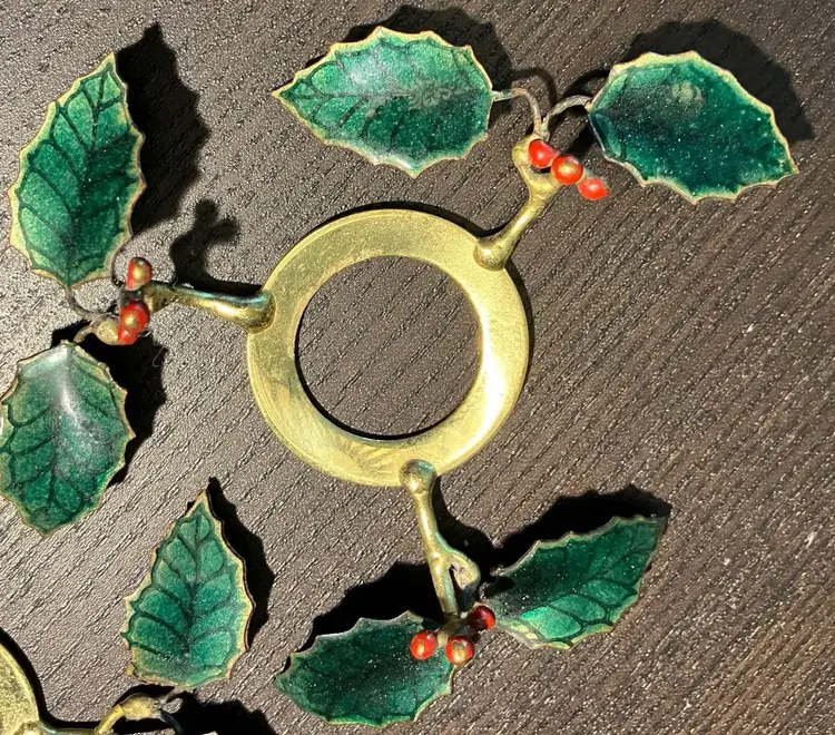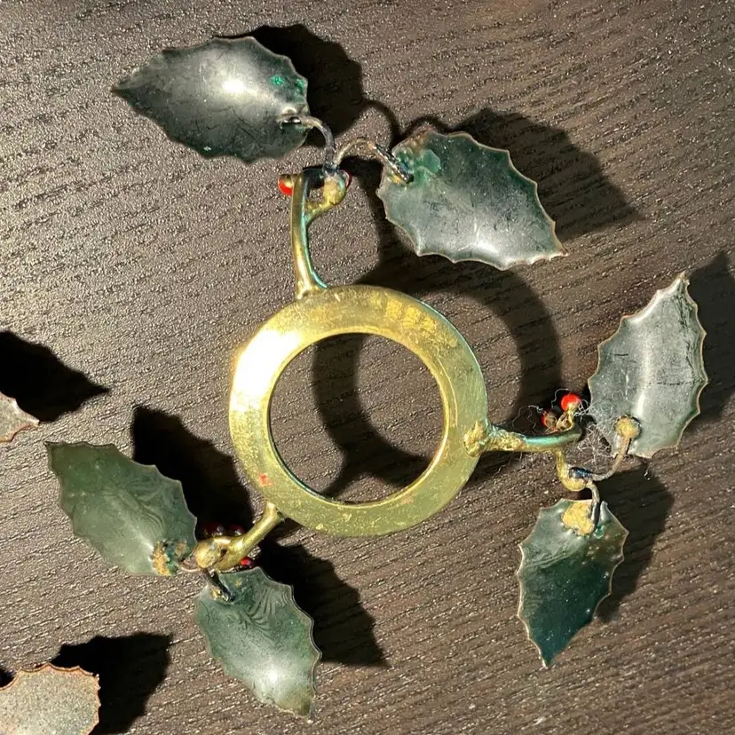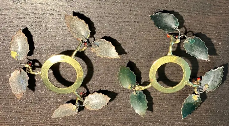 Appears to be vintage and Hand fused. There is red missing from several of the berries revealing gold colors. There is some glaze missing from the underside of the leaves but these can not be seen when displayed. They fit over a candle less than 1" in diameter. They are approximately 4" in overall diameter.