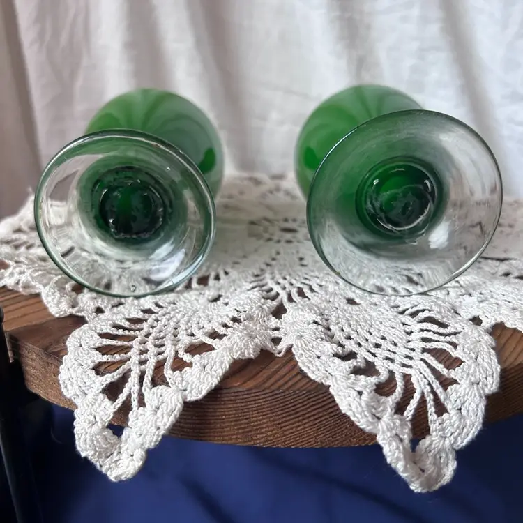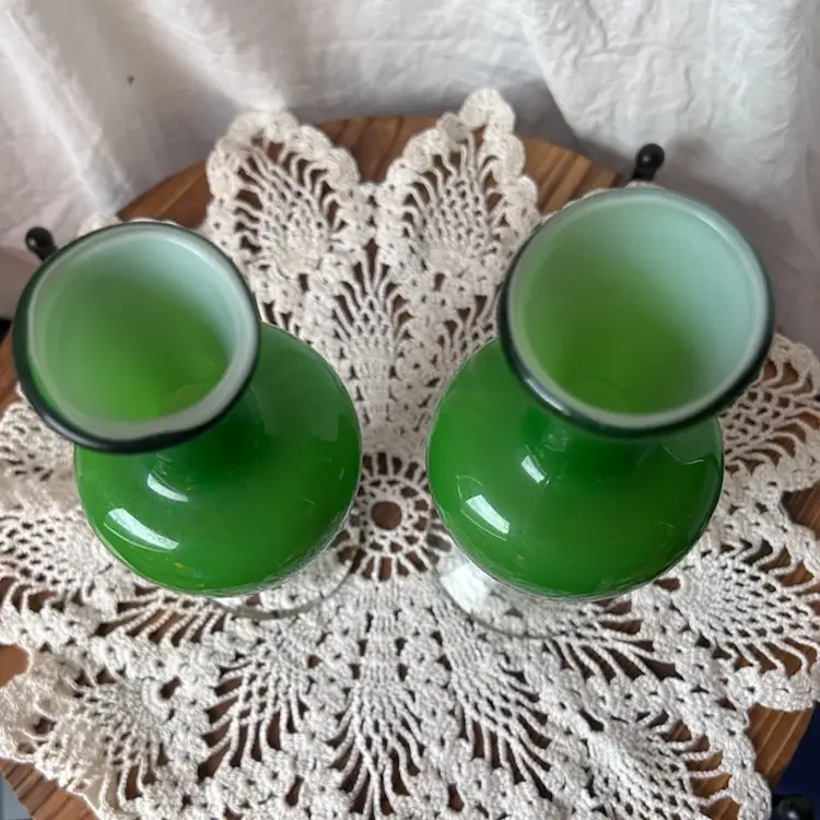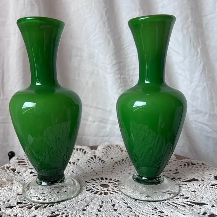 Hand blown vases with pontil marks on the bottom. Unsure of year made or maker. Both are in VGC and measure 6.75” tall.