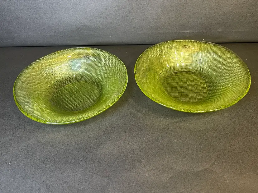 This set of two oval glass bowls from Crate & Barrel is a must-have for any occasion. With a stunning green Erin pattern and a waffle underlay, these Italian-made bowls are perfect for serving your favorite dishes. Measuring 9 inches in diameter and 2 inches in height, these bowls are both functional and stylish. The glossy finish and intricate production technique make them a beautiful addition to your dinnerware collection. The set includes two bowls, each measuring 8.5 inches in length, 8.25 inches in width, and 1.75 inches deep. The production style is waffle, adding texture and visual interest to the bowls. They are suitable for all occasions and can be used for serving a variety of dishes. Made in Italy using high-quality glass material, these bowls are both durable and elegant. Make a statement with these stunning bowls that are sure to impress your guests.