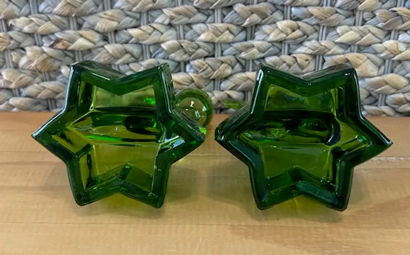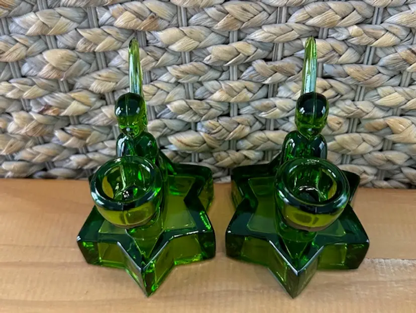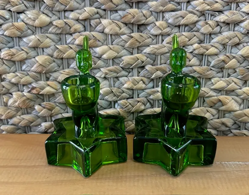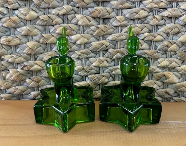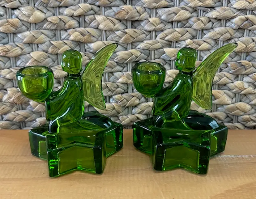 The product is a small pair of LE Smith Kneeling Angel Candlestick Holder made of green glass with a star pattern. It is designed in a star shape and is ideal for use during the Christmas season. This decorative collectible candle holder is perfect for adults and adds a touch of elegance to any space with its beautiful patterned finish. The brand LE Smith specializes in creating unique and charming glassware pieces, making this candle holder a beautiful addition to any collection. W: 3.75" L: 4" H: 4.75"