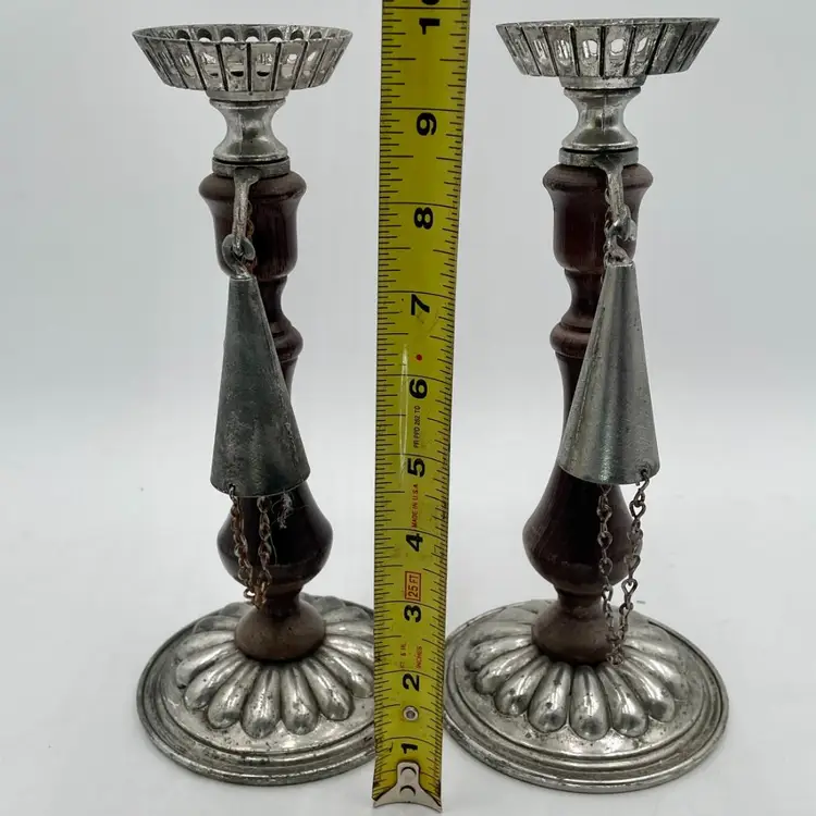 10" Tall. This set is beautiful. There is a bit of patina on the metal. But overall they are in wonderful condition!