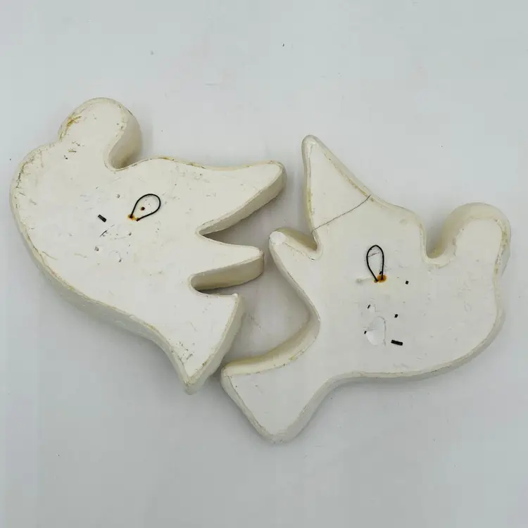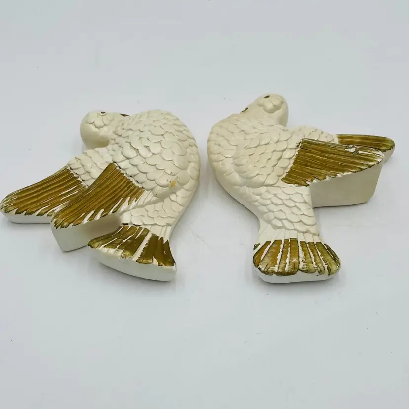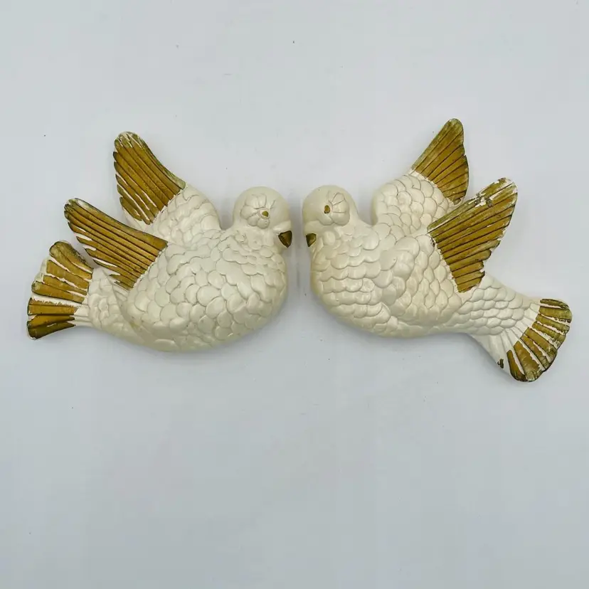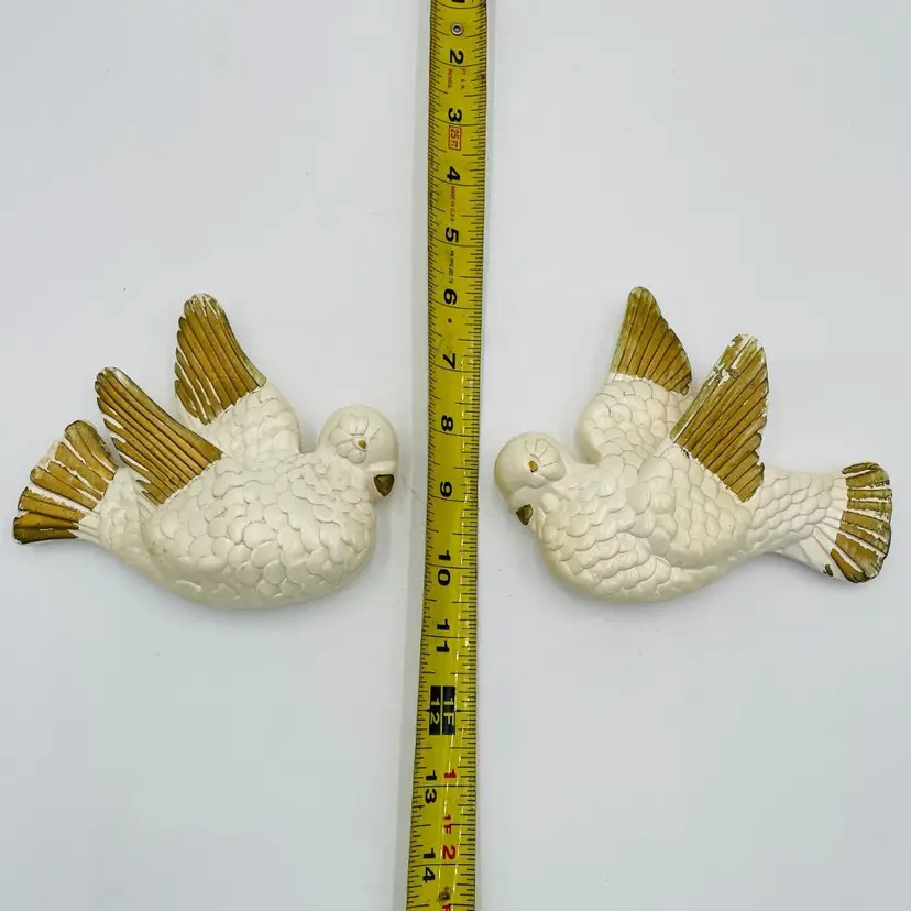These are darling! The tip of one of the dove's wing has been repaired. You cannot see the repair on the front because it is on the seem of the feathers, but you will see the line on the back. They display beautifully! They are about 5" x 5" each.
