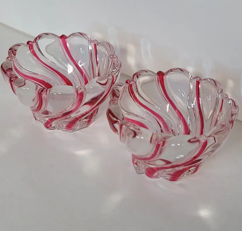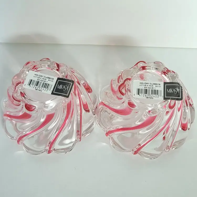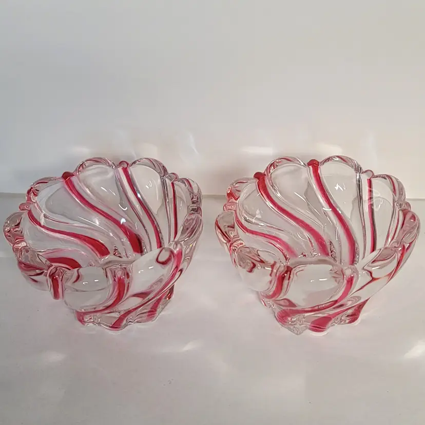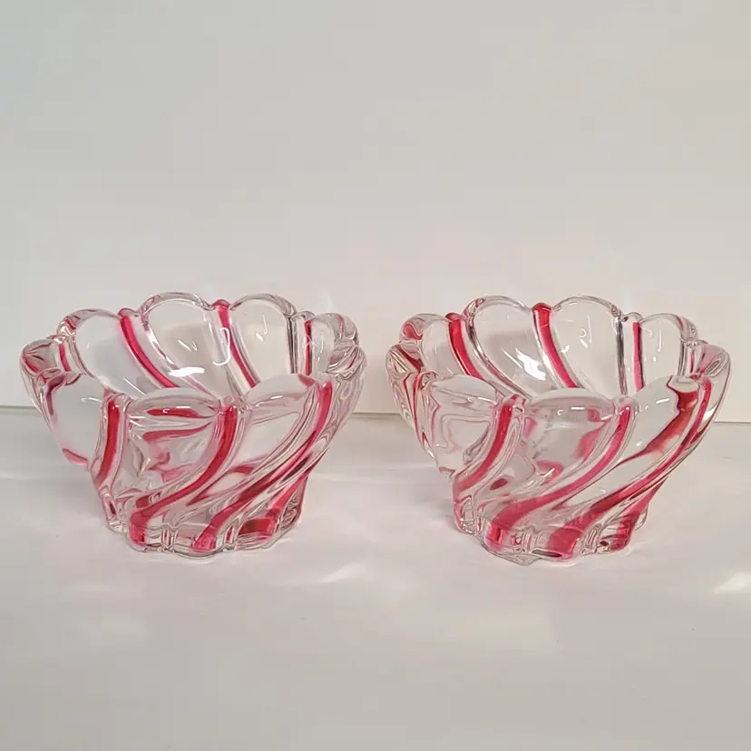 2 Mikasa Clear and red striped glass votive holders or candy dishes. Perfect for Valentine's or Christmas. 2.5" H, 4" W.