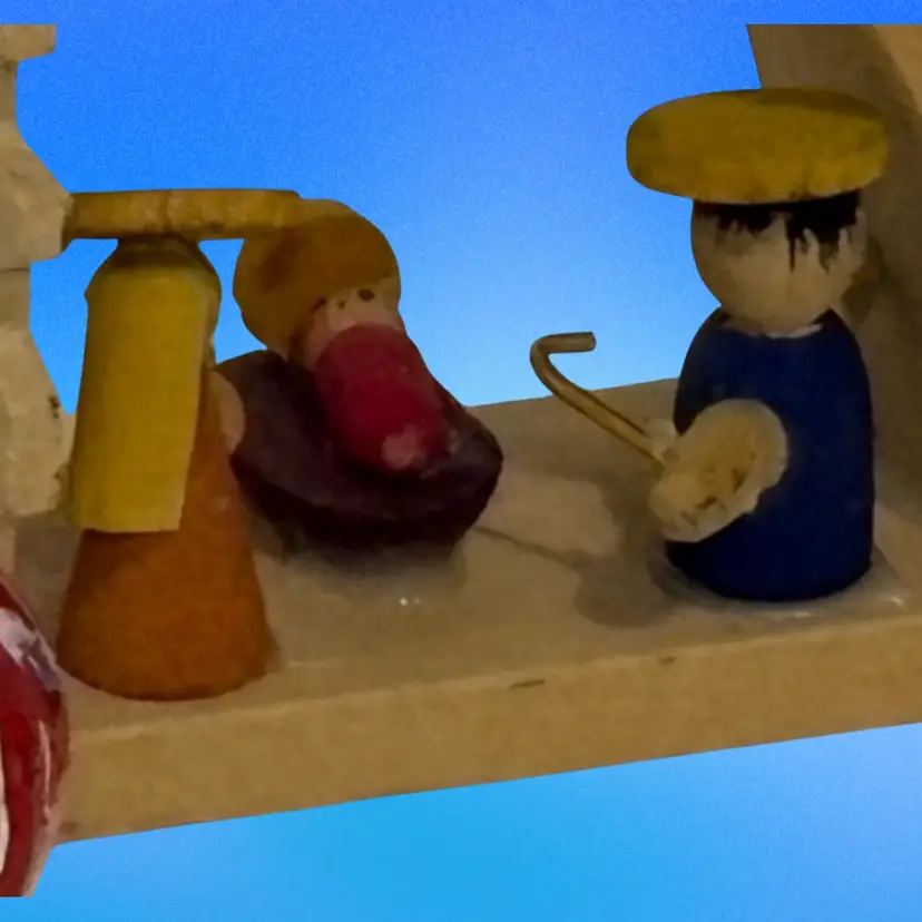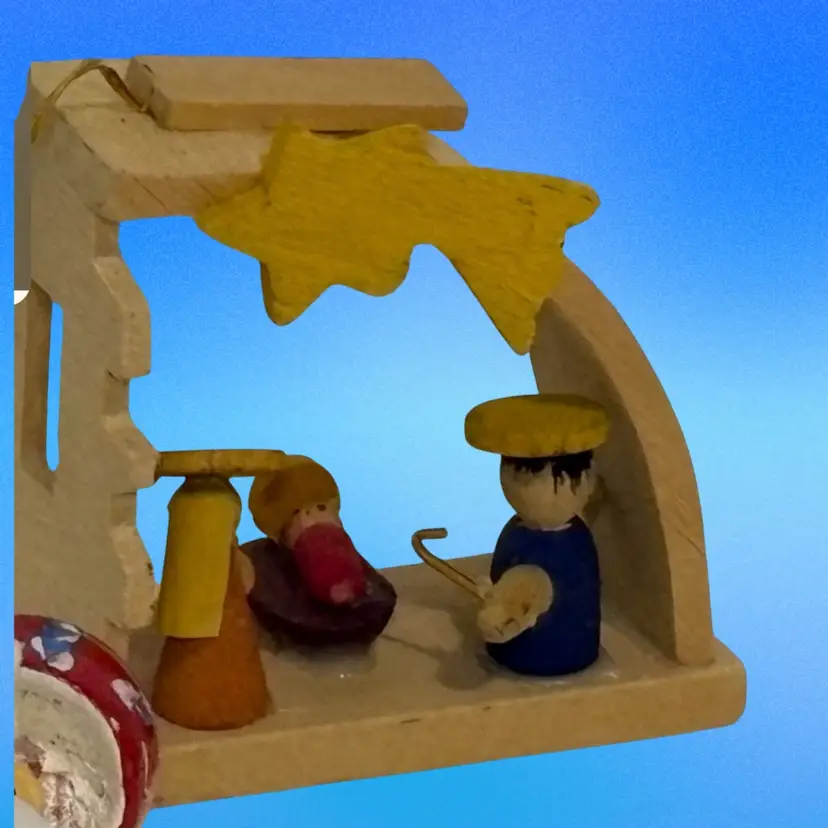 -Hand carved, hand painted, vintage folk art. This a Nativity Scene in a stable setting with a yellow star above. -No two are the same, each unique with subtle variations. Sticker shows made in Taiwan -No chips, cracks, cracks. Unable to confirm if any variations are part of wear and tear or original.