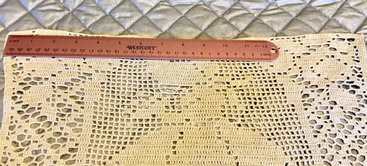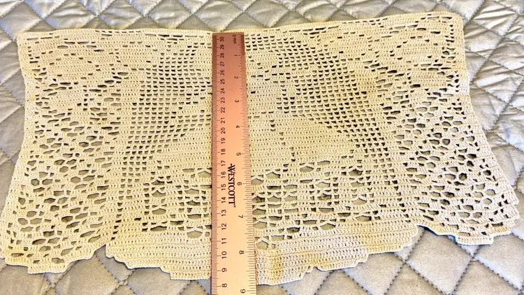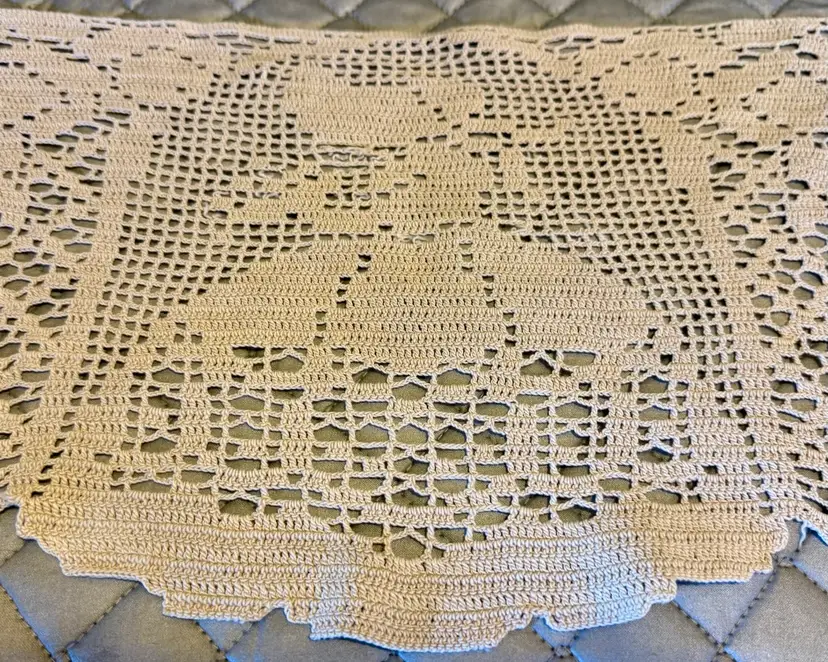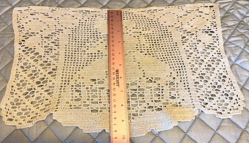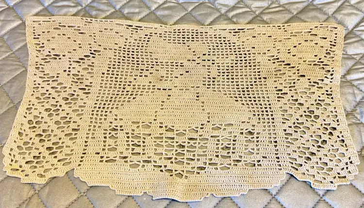 These are vintage ecru filet crochet antimacassar, also known as a doily or chair back cover. It is a type of lacework featuring a design of a lady in a long dress and hat and used to protect furniture from dirt or as an ornament.