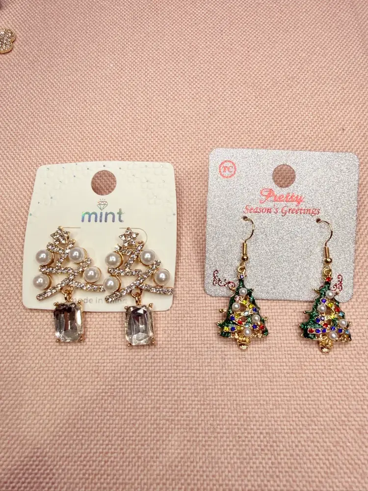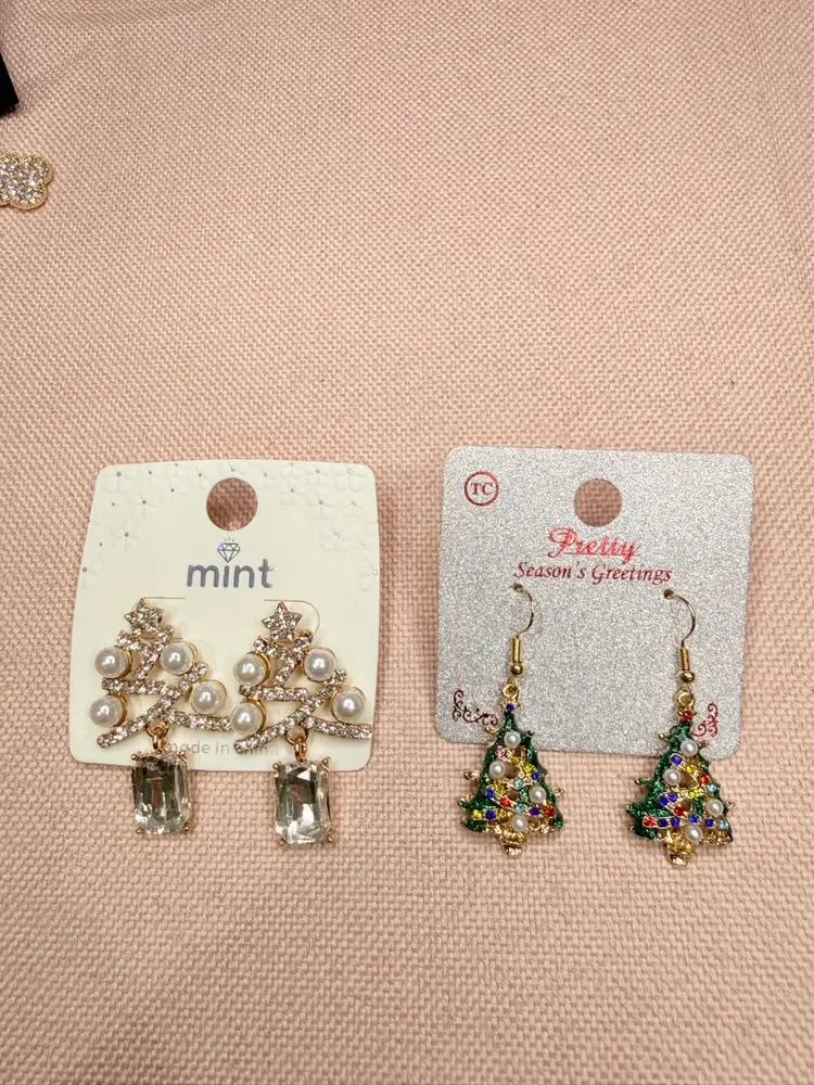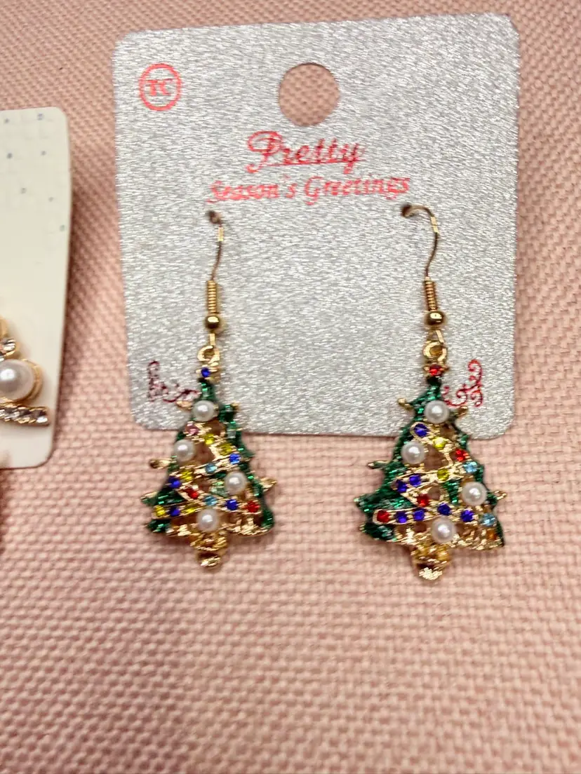Celebrate the festive spirit with these dangle earrings, designed to add a touch of elegance to your holiday ensemble. Shaped like Christmas trees, these gold-toned earrings feature clear simulated crystals and faux pearls, creating a dazzling effect that captures the joy of the season. Perfect for Christmas gatherings or holiday parties, these earrings are sure to make a statement. With a comfortable hook closure and nickel-free design, they offer both style and comfort. New with tags.