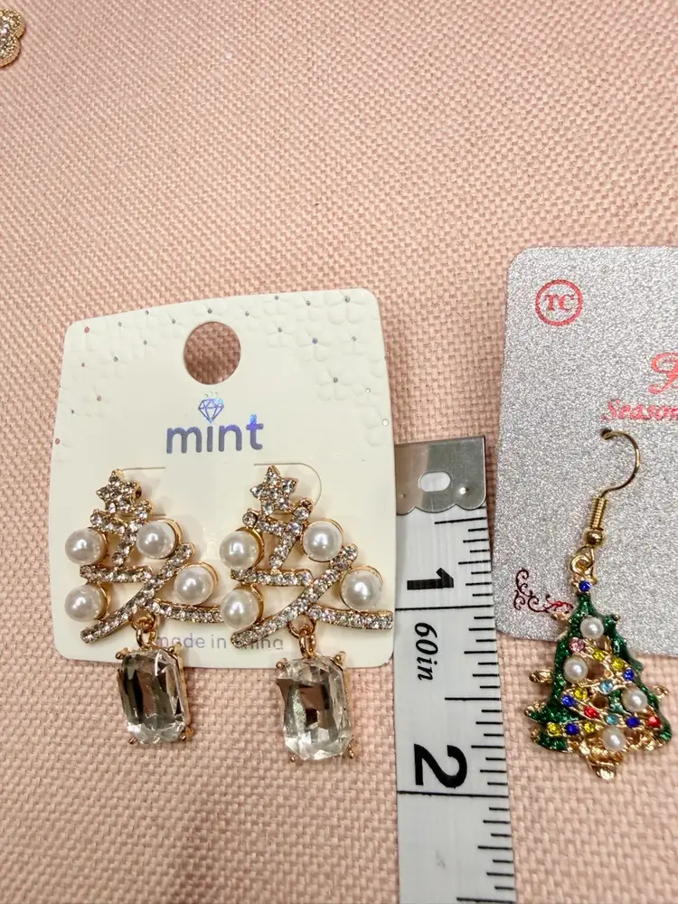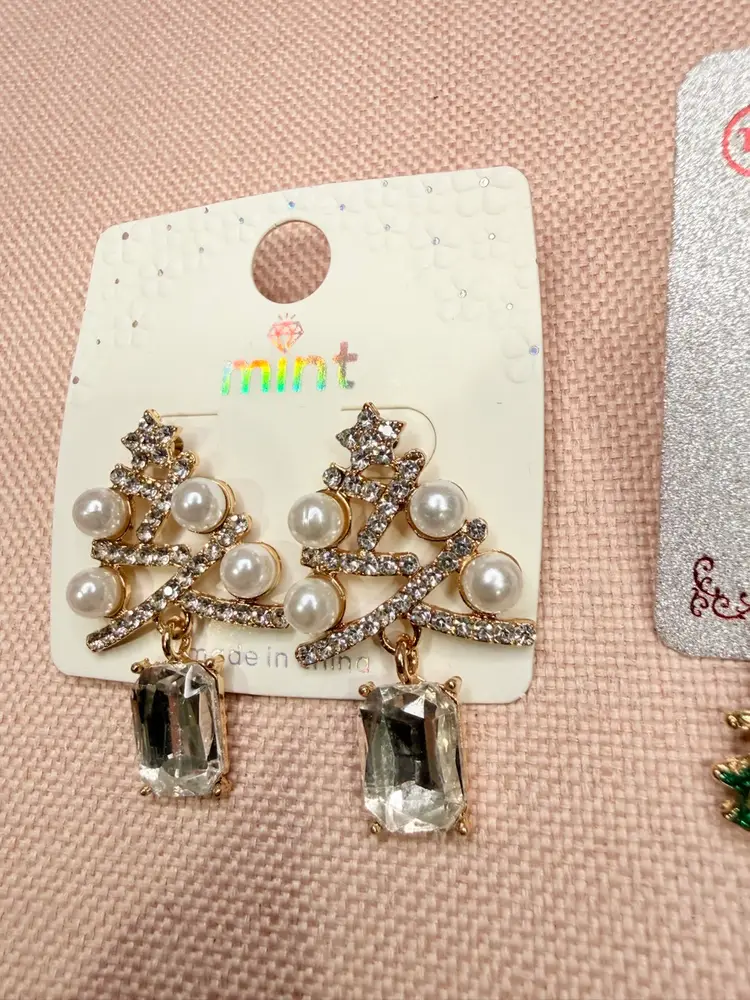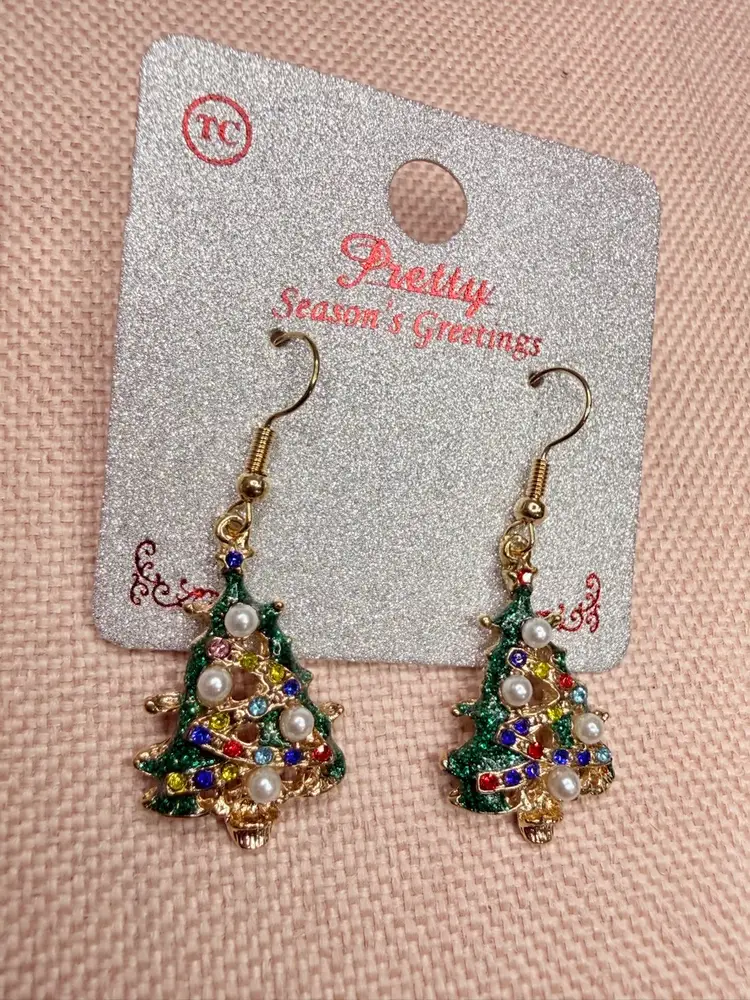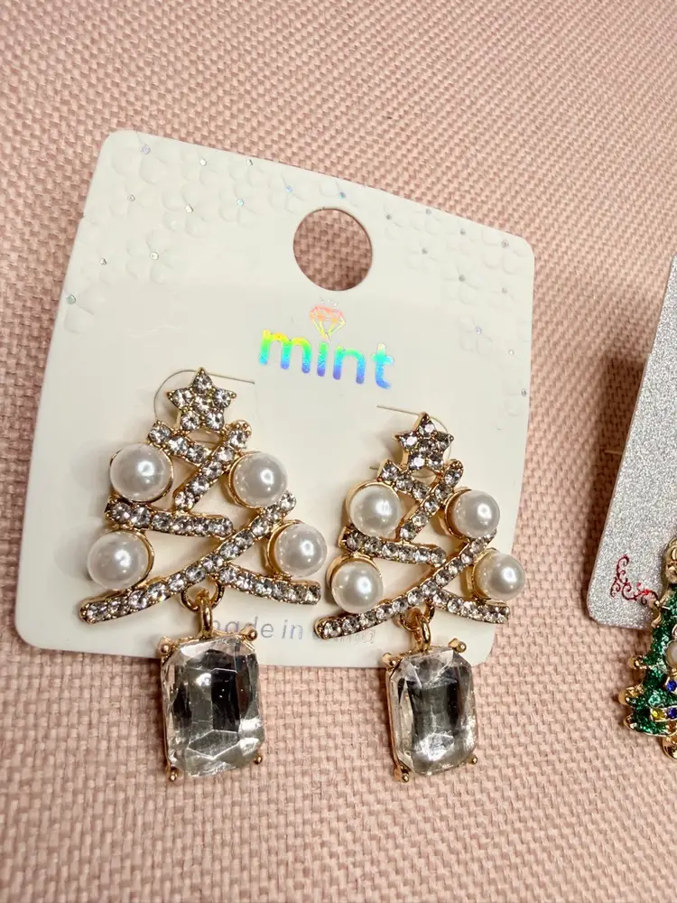 Keywords:, dangle earrings, Christmas, holiday, gold, crystal, faux pearl, tree shape, festive, party, nickel-free, hook closure, new with tags.