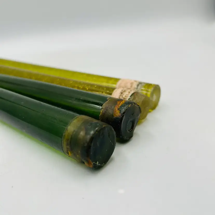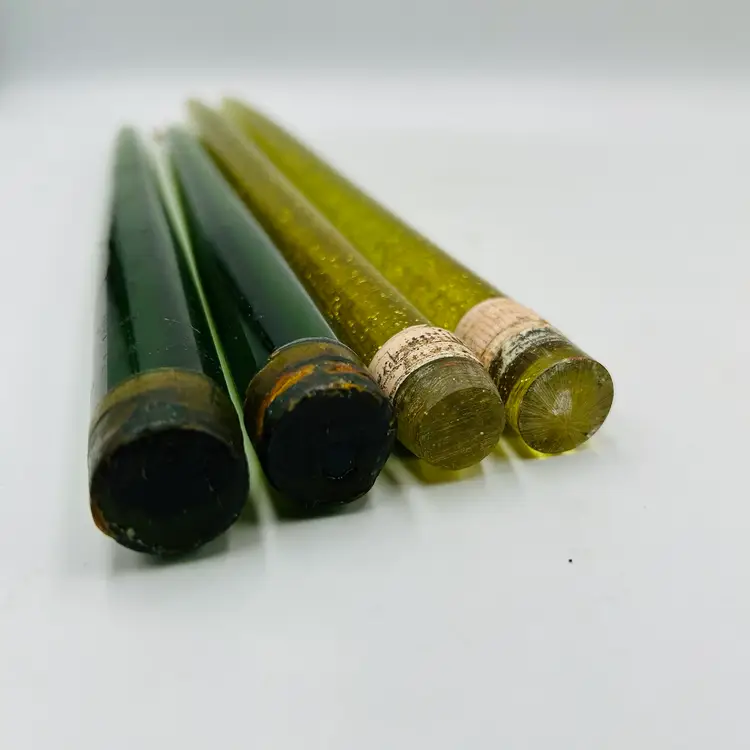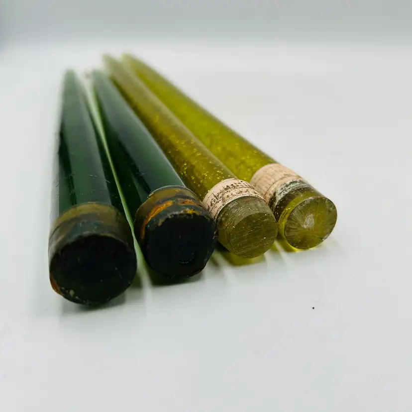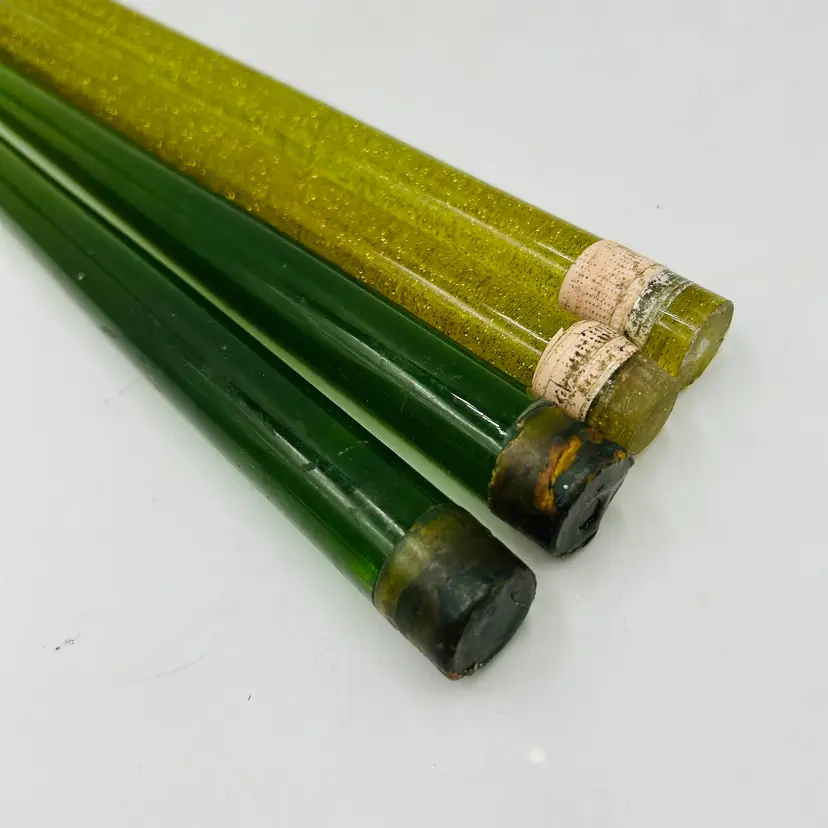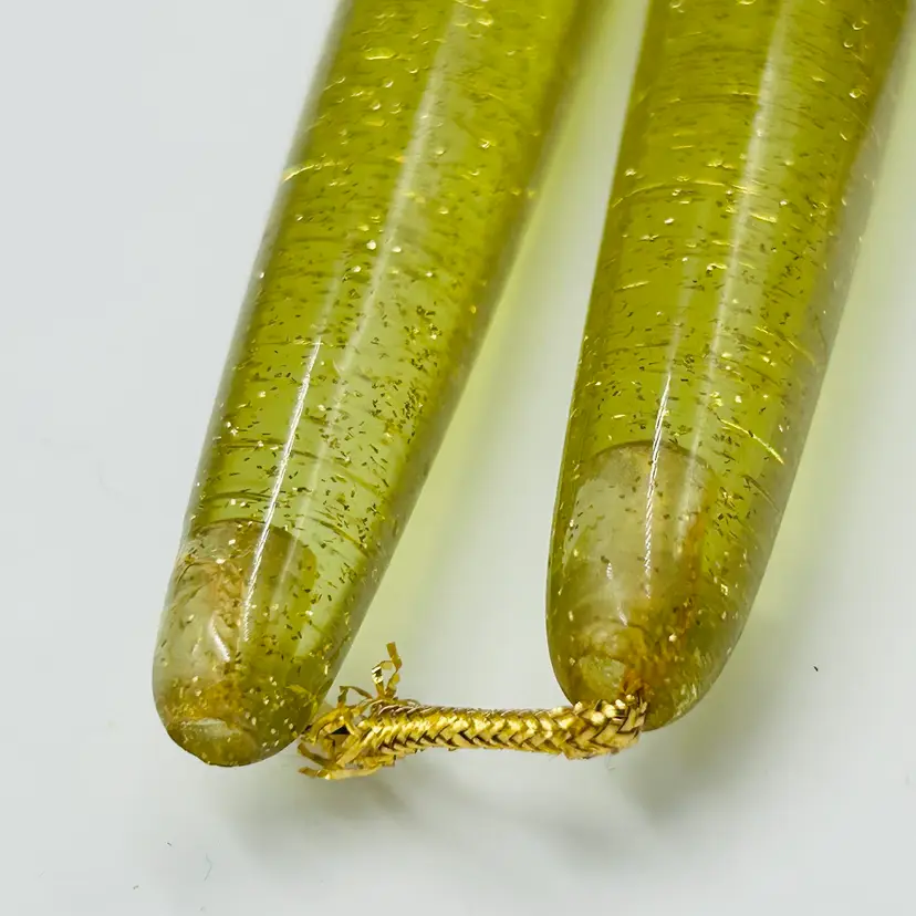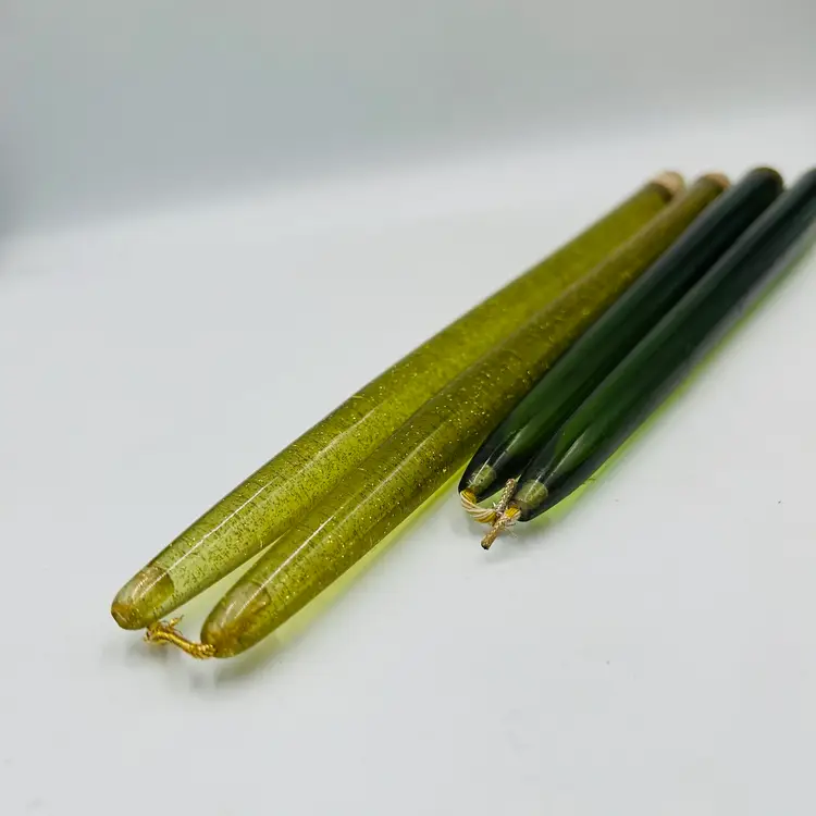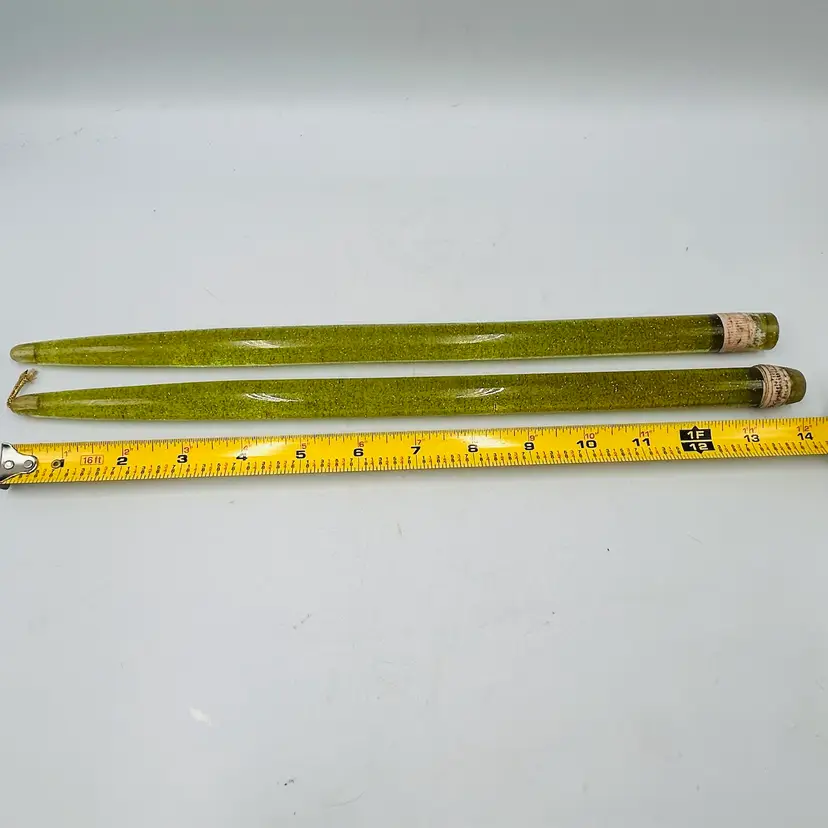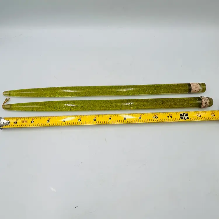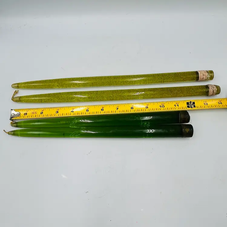 The longer pair measures approximately 14”. Difficult size to find. Note one is missing the wick but could be replaced. No chips or cracks. Has gold glitter