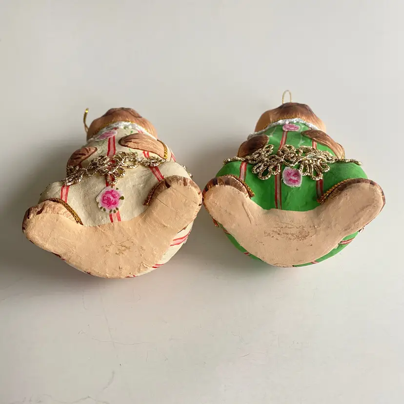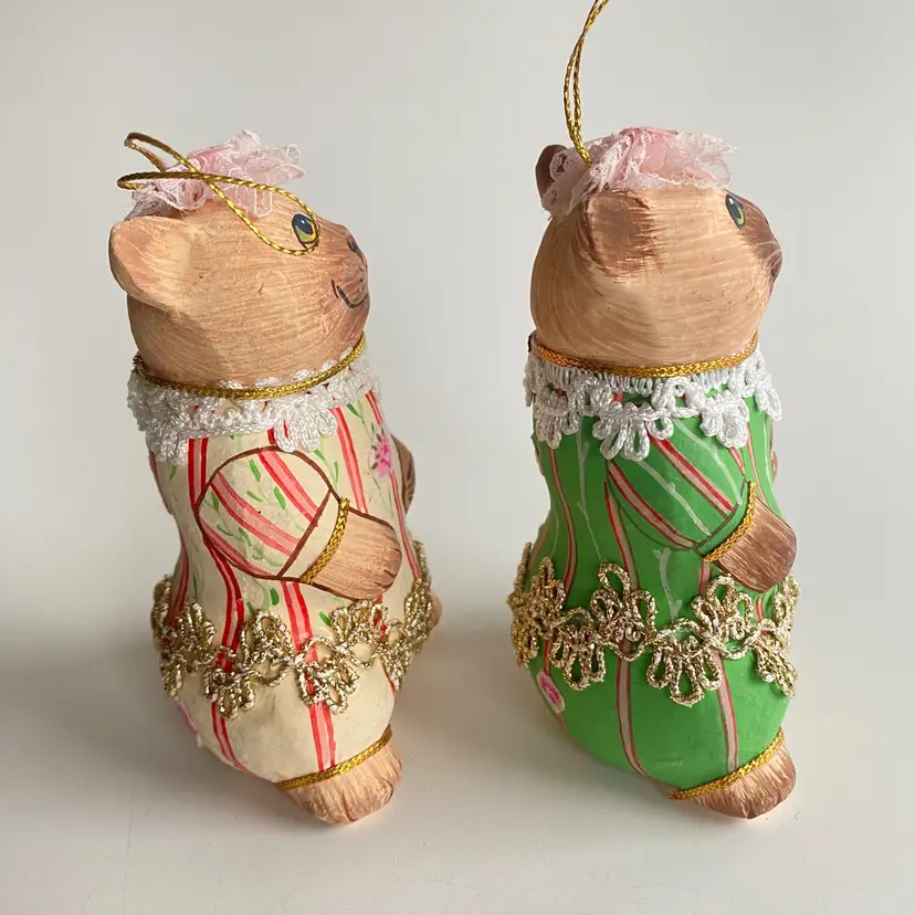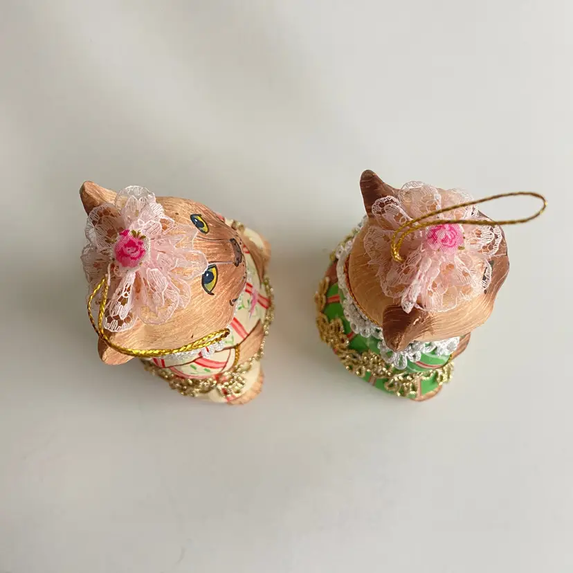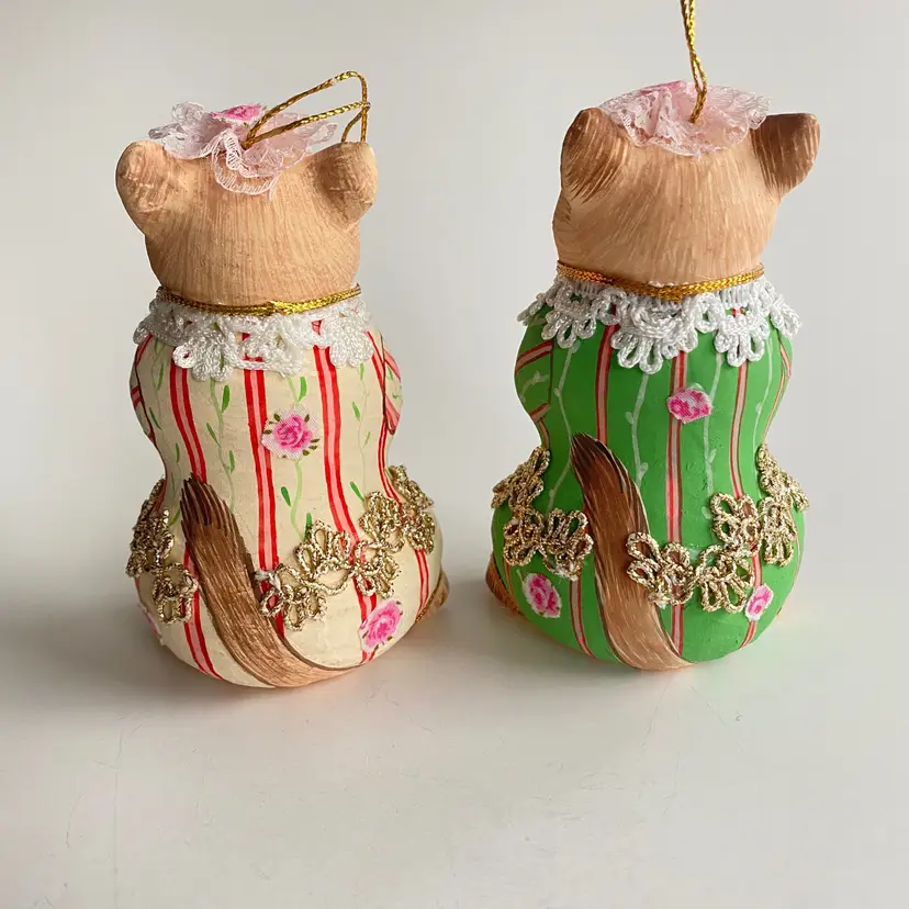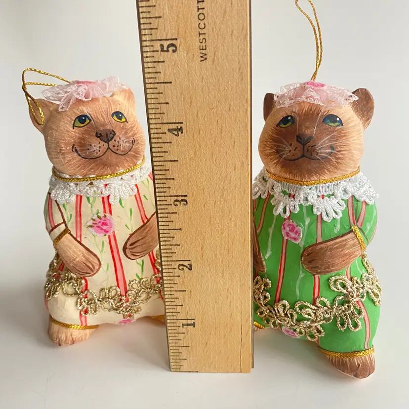 Pair of vintage happy cat hanging ornaments, approx 4.5" tall. Hand painted and embellished with lace & ribbon in Victorian style. Very nice condition, no damage, only minor surface scuffs from use and storage.