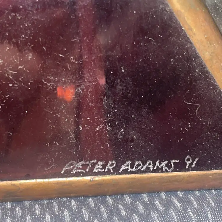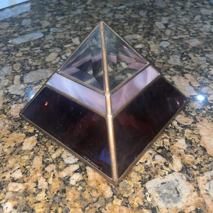 This product is a set of two Peter Adams signed stained glass pyramid votive candle holders from 1991 in reddish pink colors. The holders are designed for tealight candles and are suitable for any room in the house. Crafted in the United States in the 1980s, these original candle holders are a unique and artistic addition to any collection of decorative items. The big one stands at 5 inches tall, they add a touch of vintage charm to any space with their vibrant red hues and elegant design.
