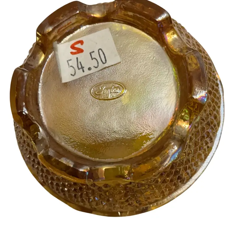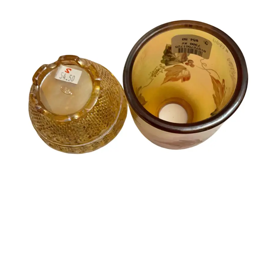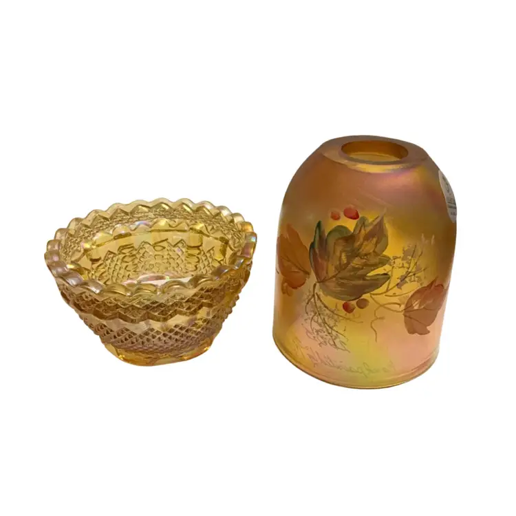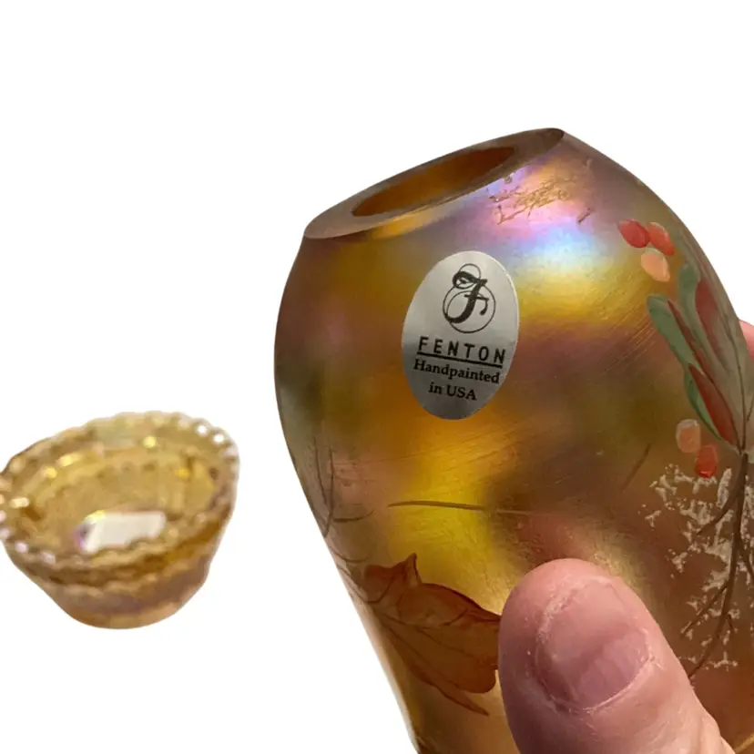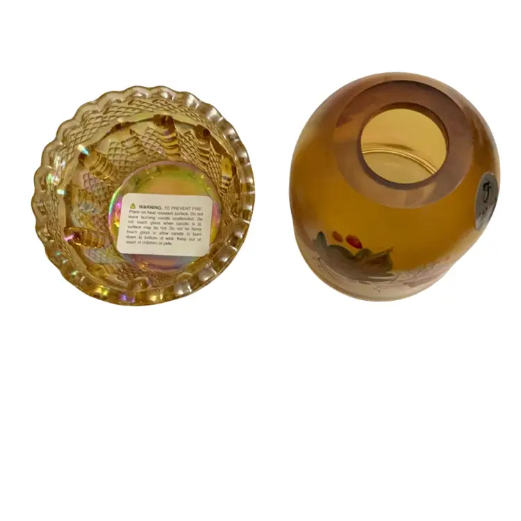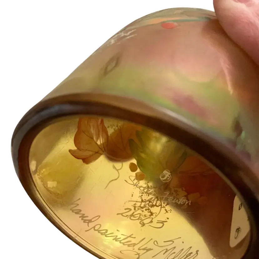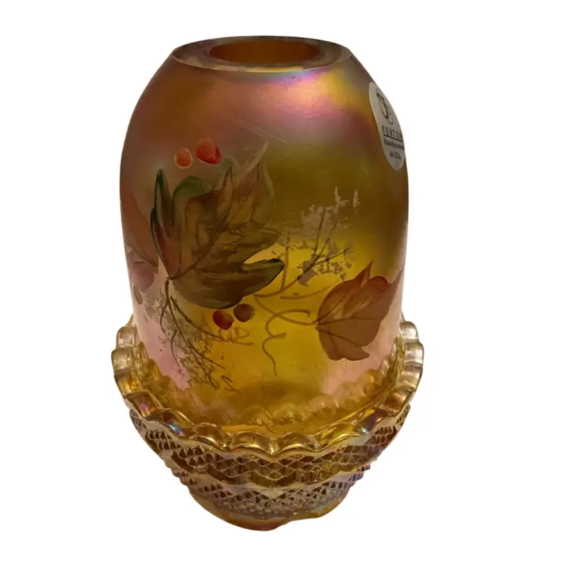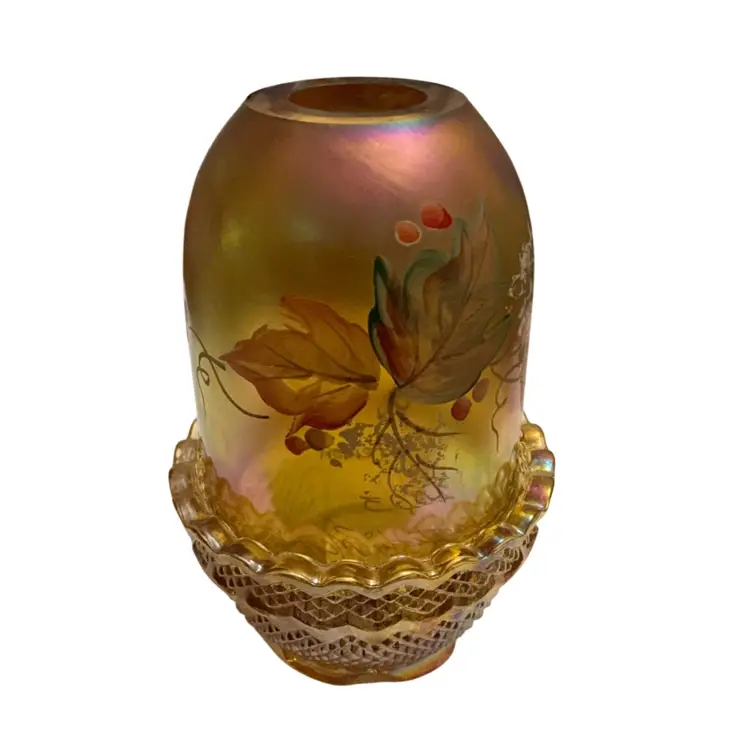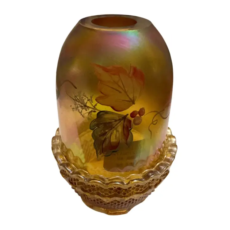 Beautiful Iridized gold colored fairy light with hand painted leaves and berries signed by Sheela Miller and also signed by Shelly Fenton. This lovely fall themed fairy light is a part of the Fenton Family Series from 2003. It has its original Fenton sticker plus a retail store sticker. The base is stamped with the Fenton logo and a zero that depicts the decade in which it was manufactured.