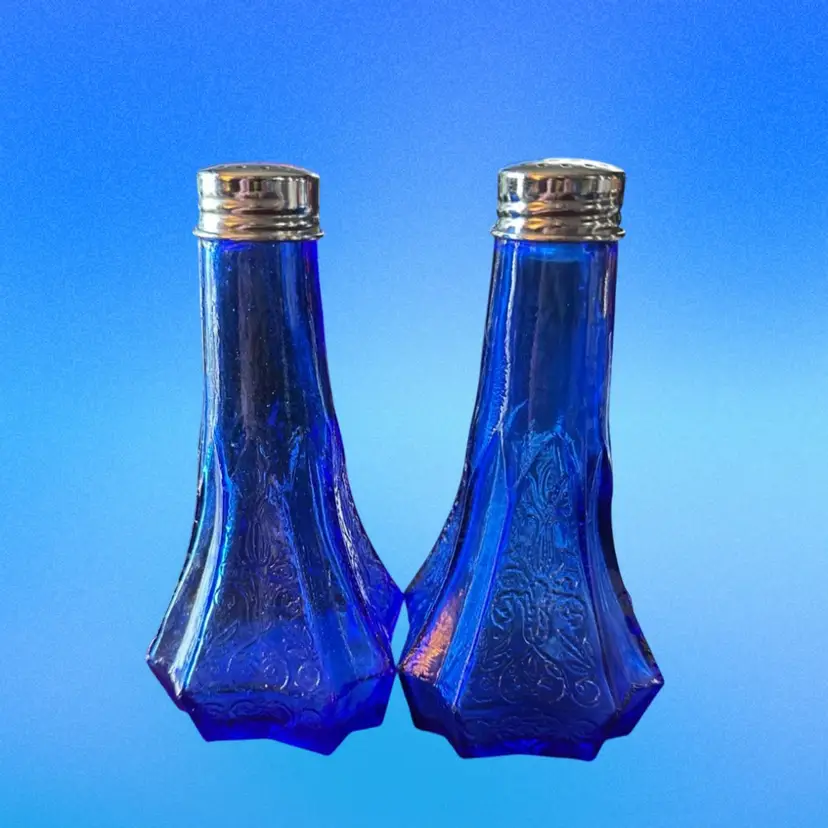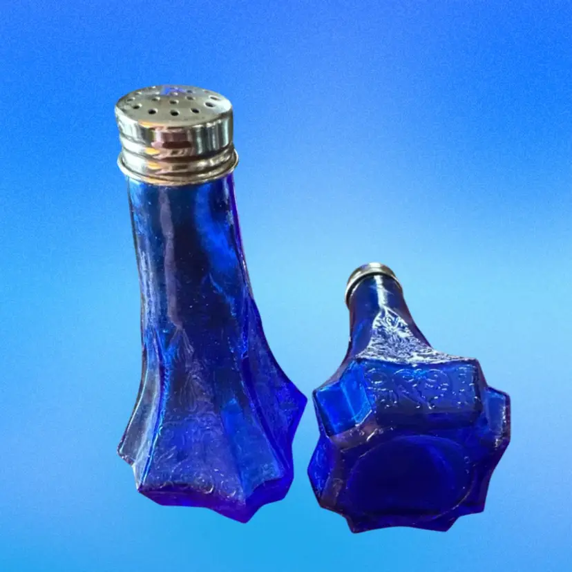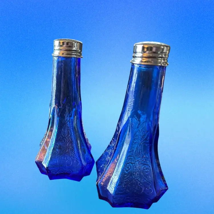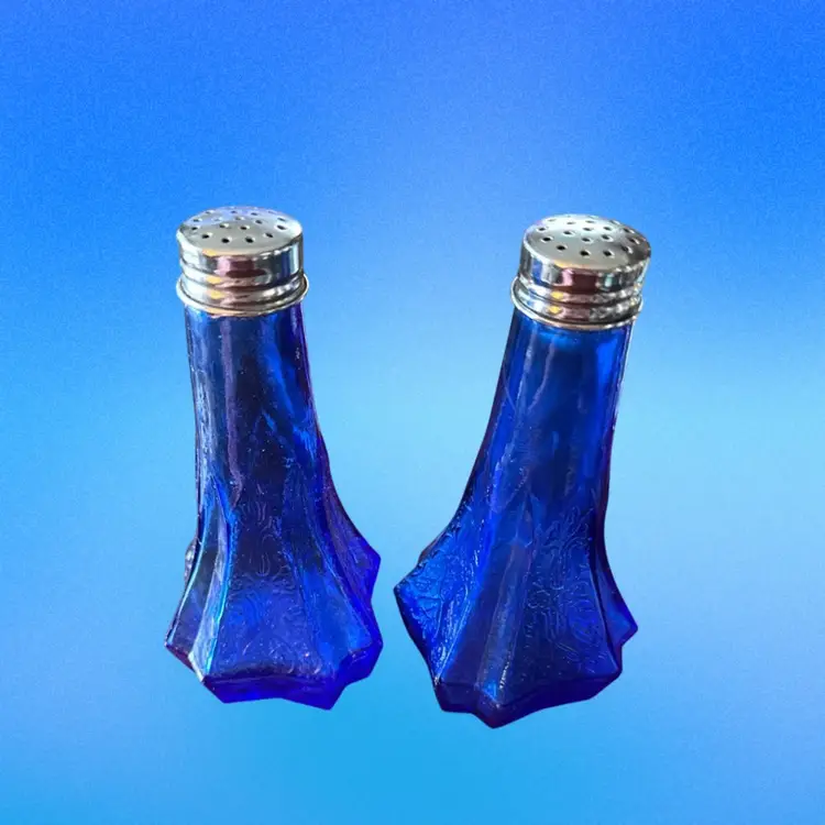 This 2 piece set of cobalt blue depression glass style tall floral salt/pepper shakers by IWGAC exudes a vintage/retro style with elegant blue glass featuring a floral pattern. The set includes salt and pepper bottles, making it both functional and decorative for your kitchen or dining table. Standing at 5.25 inches tall and 2.5 inches wide, these shakers add a touch of charm to your dining experience with their unique design and color.