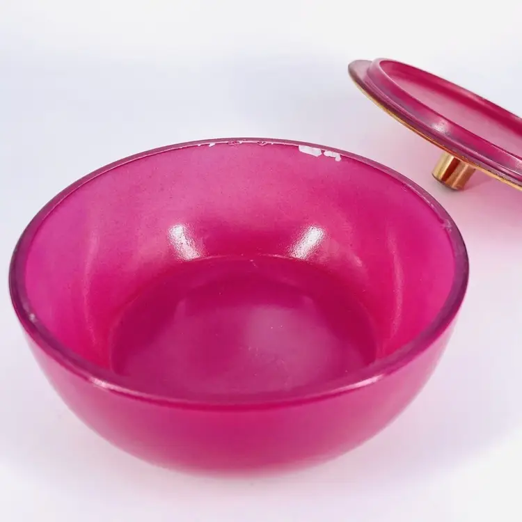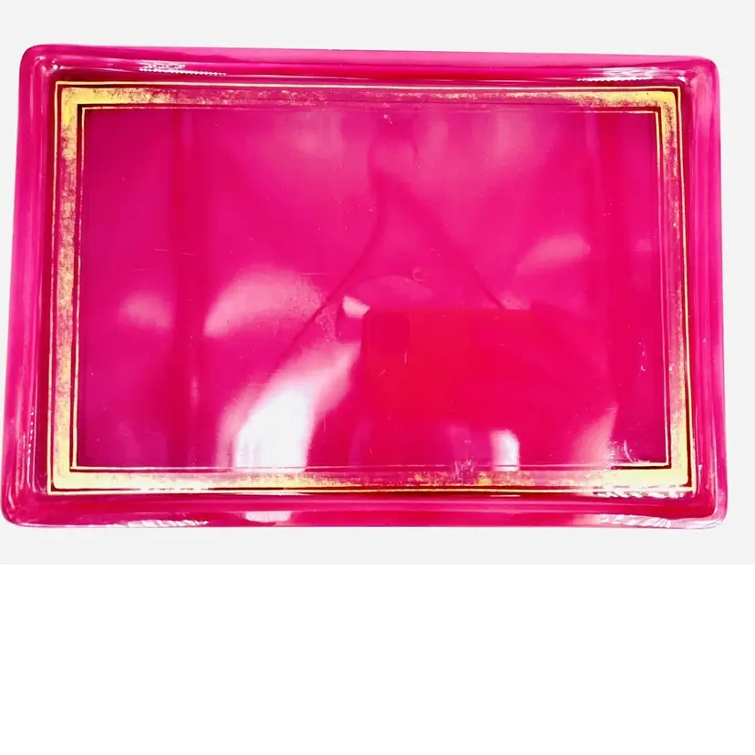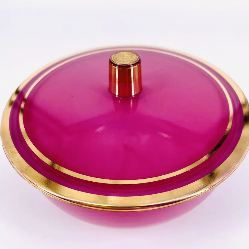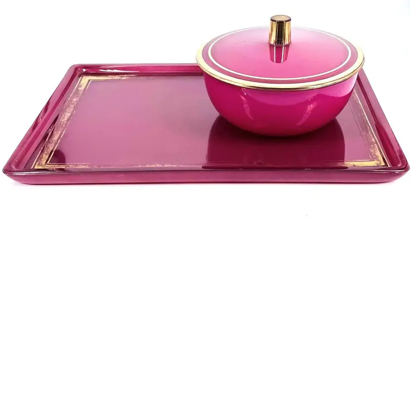 These items are in good vintage condition. No chips or cracks. Several places where the gold trim has wear. Scratches to the bottom of the tray. One spot on the inside of the powder jar where the color has come away. See all images for details. The tray measures 10 1/2" x 7". The powder jar measures 4 3/4" in diameter by 2 3/8" tall with lid. Weighs 2lbs 6oz