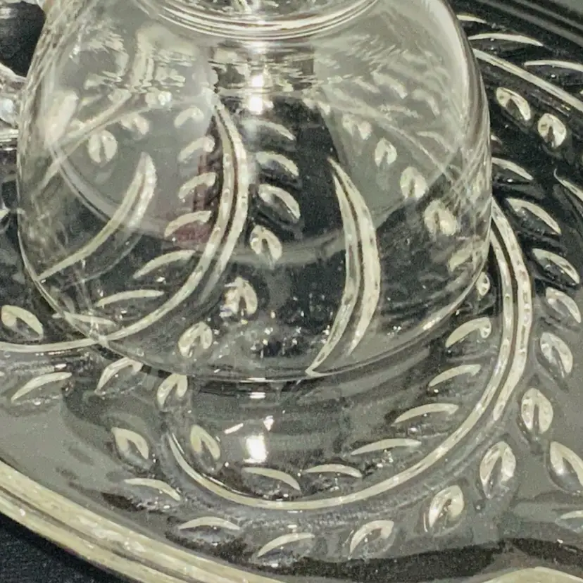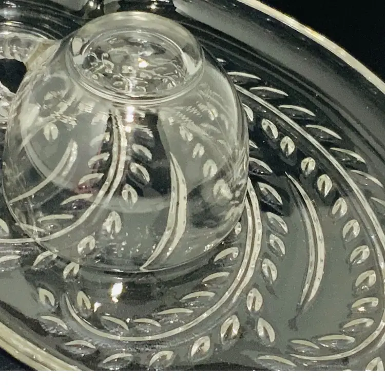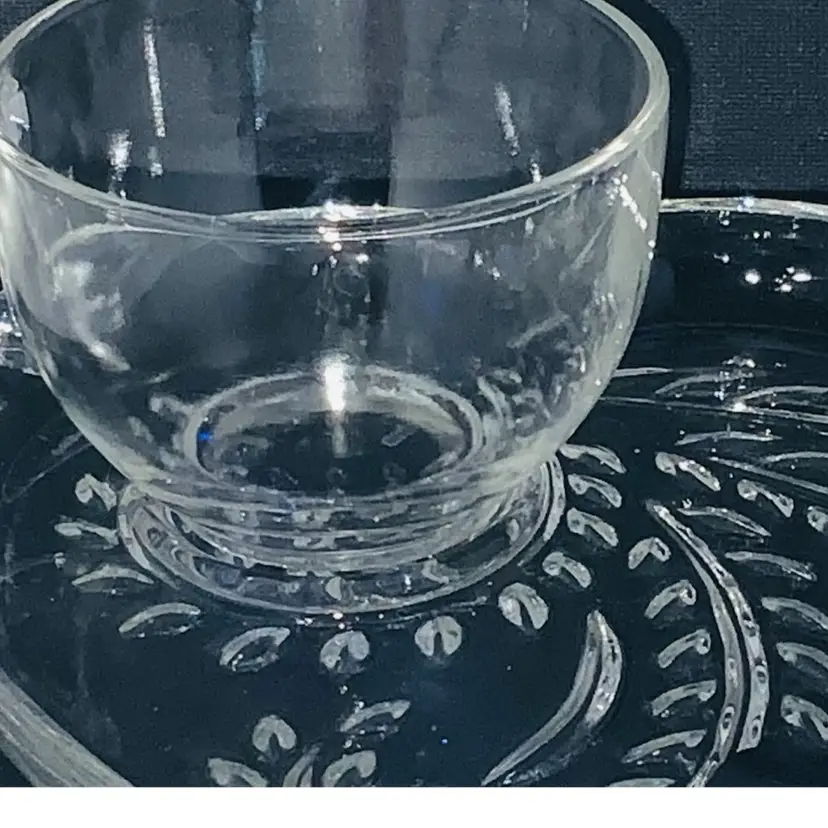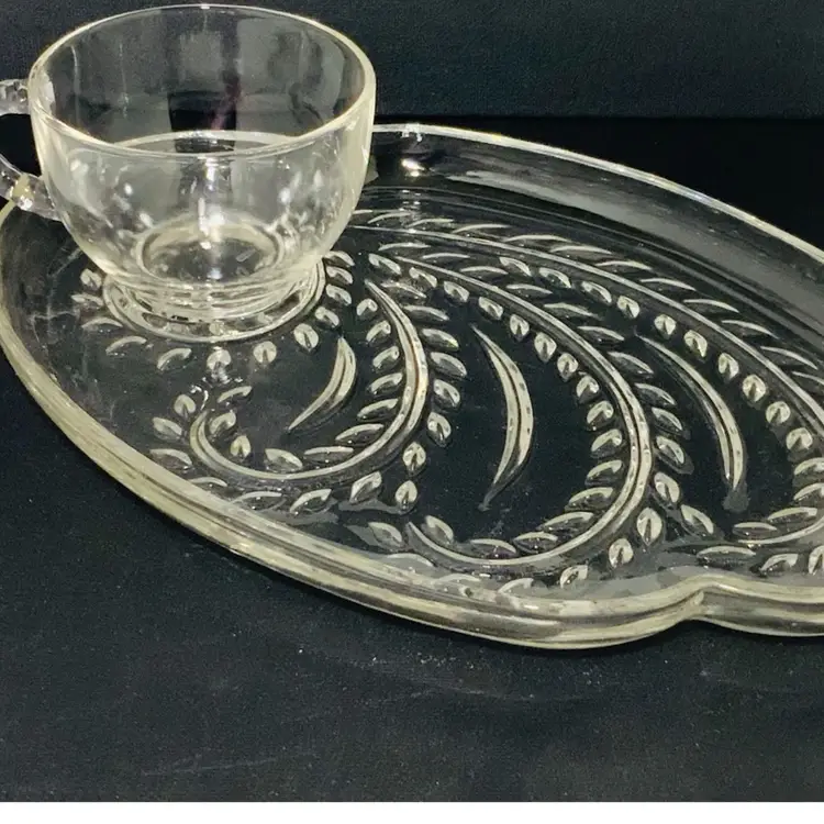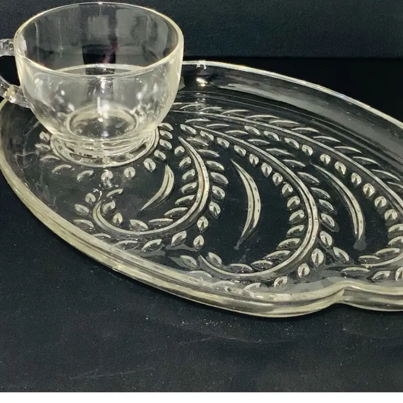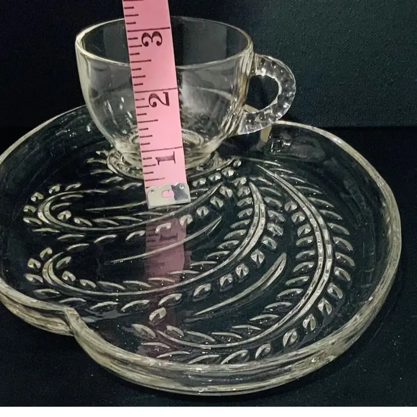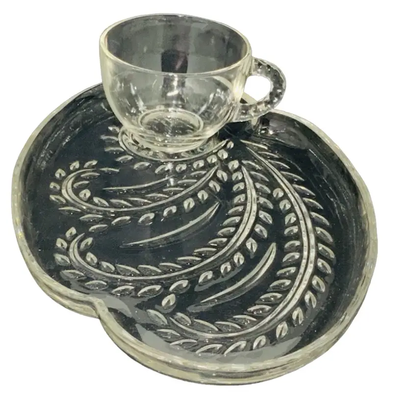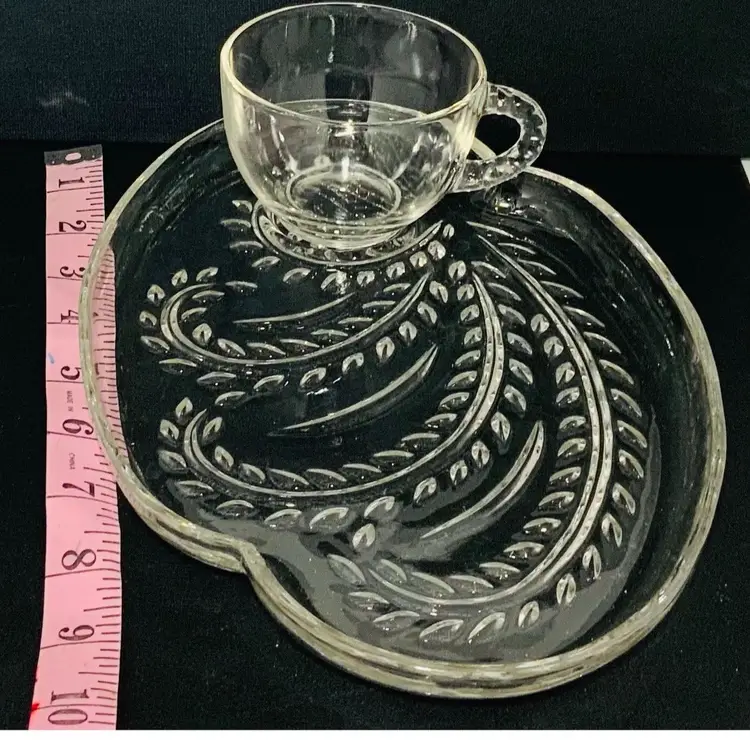 Set includes one 6” by 9.5” snack plate saucer and a 2.5” tall and 3” diameter cup. Please review photos. All pieces are heavy. can be used as a votive candle holder, ashtray or trinkets dish. Glows under 395nm UV light.