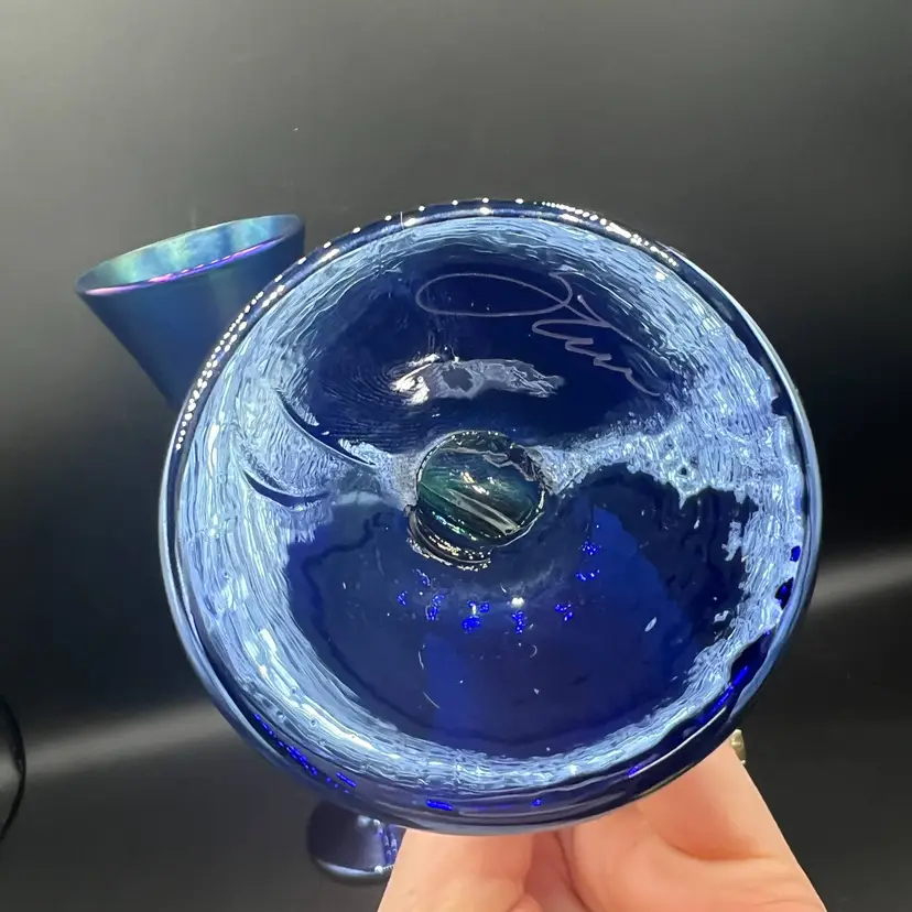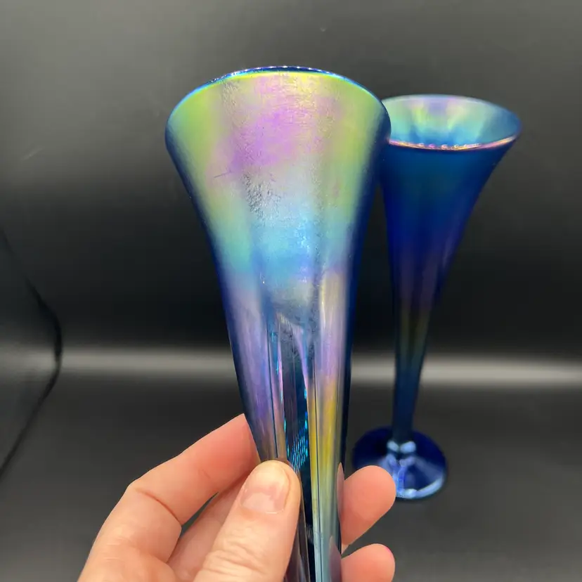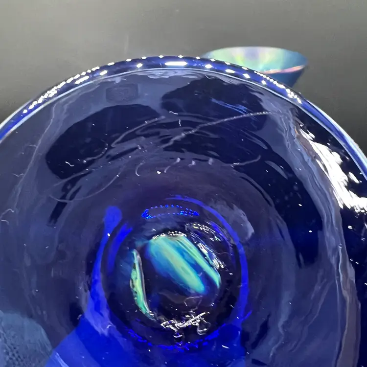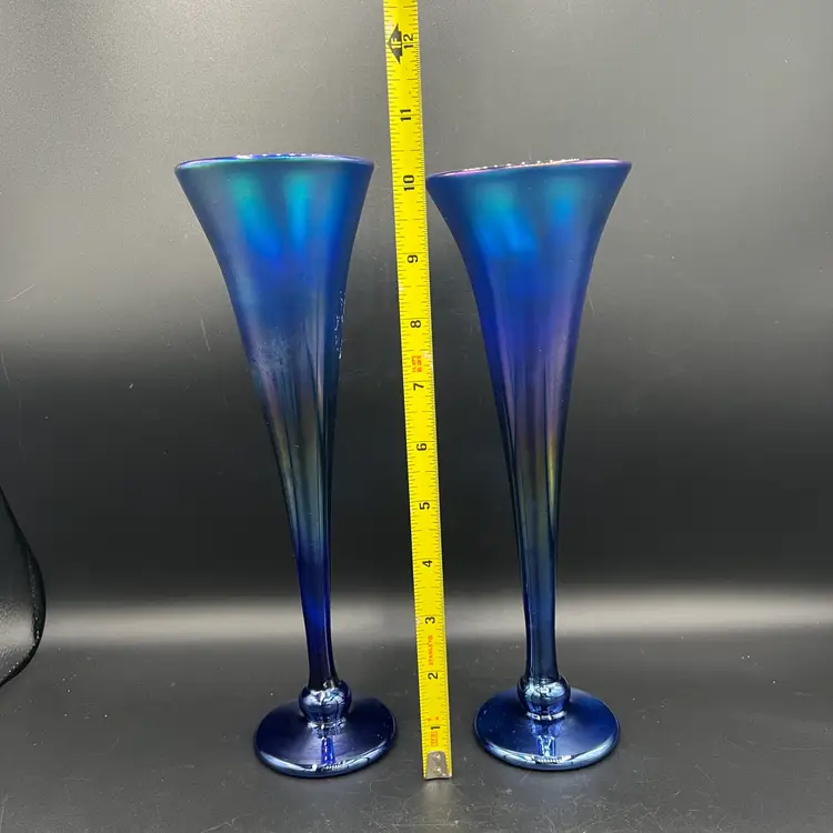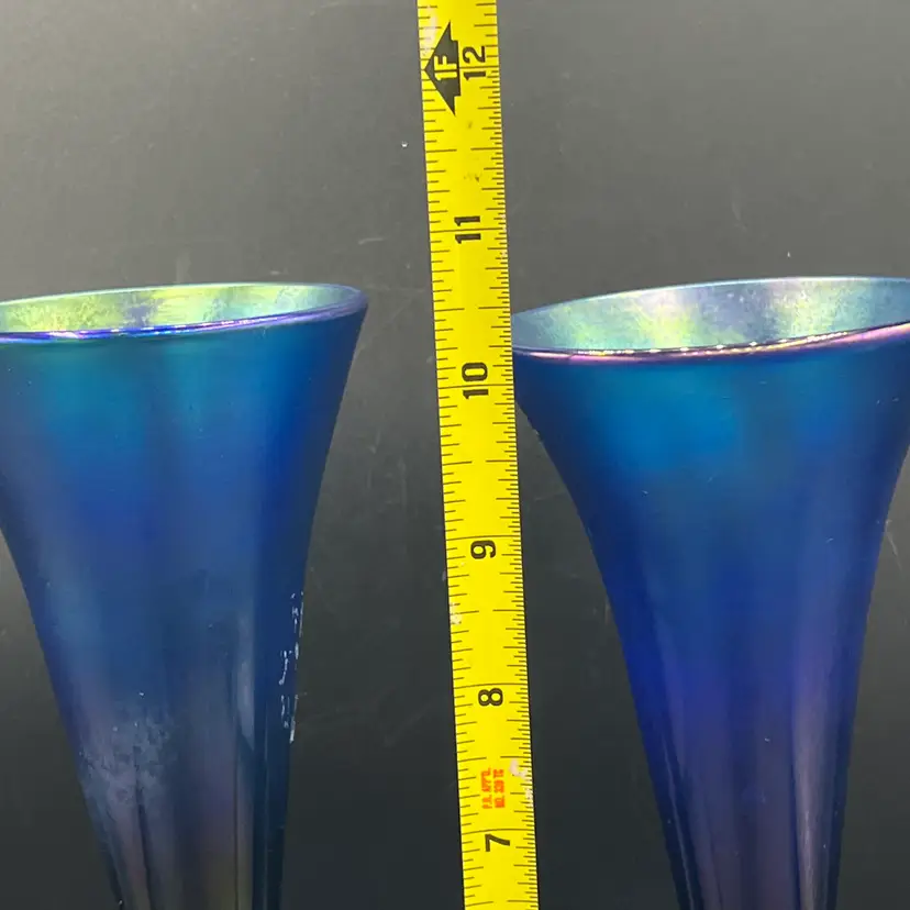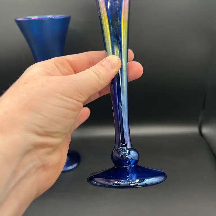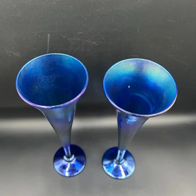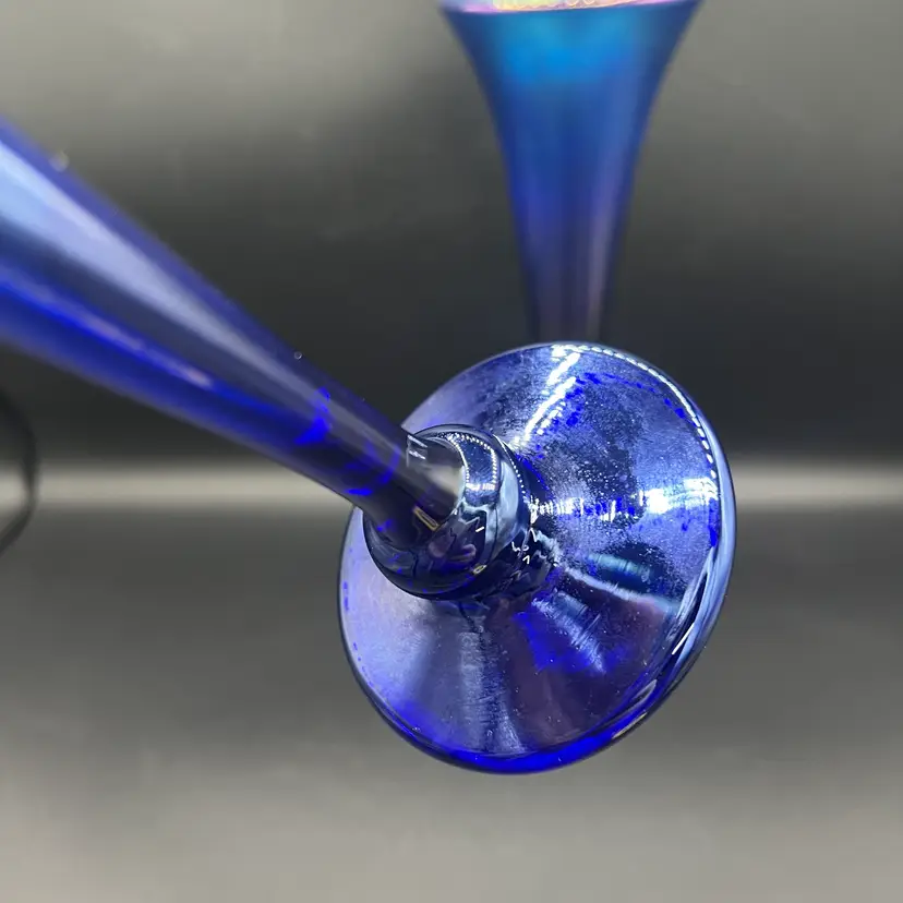 2 RICK STRINI Art Glass Blue Luster Iridescent Champagne Flute Stem Set ~ Both Flutes are Signed, Beautiful Blue Luster through out the flute. Please let me know if you have any questions of need additional pictures.