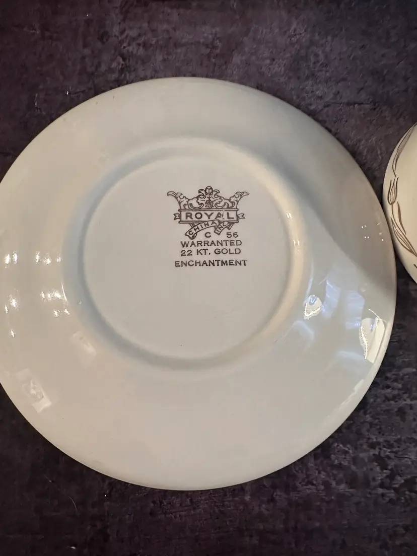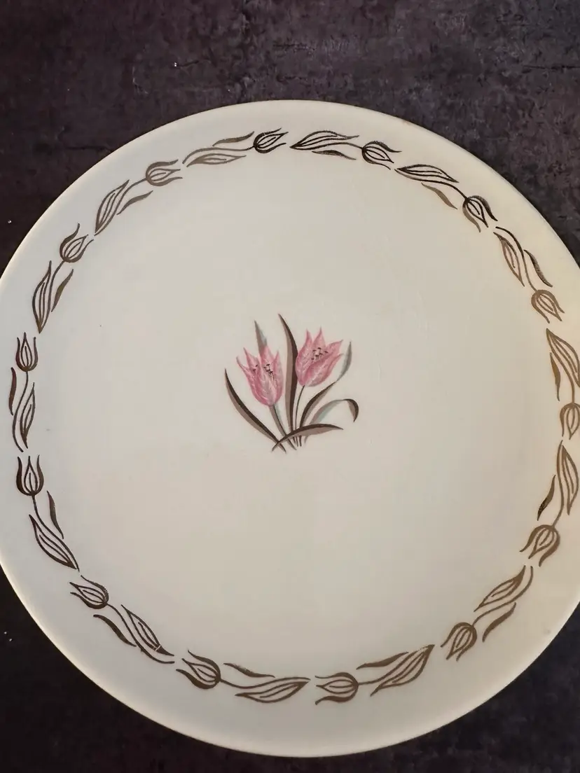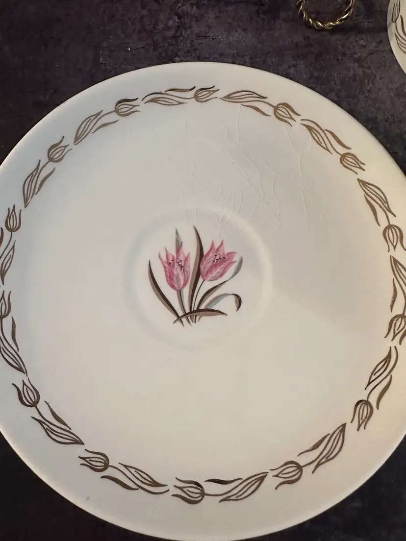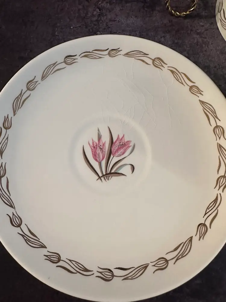 2 pretty tea cups and saucers. Pink tulip design rimmed in Gold tulips. Cups measure 2” Tall & 3.75” wide. The saucers are 6.26” in diameter. There is some crazing on the saucers. No chips or cracks