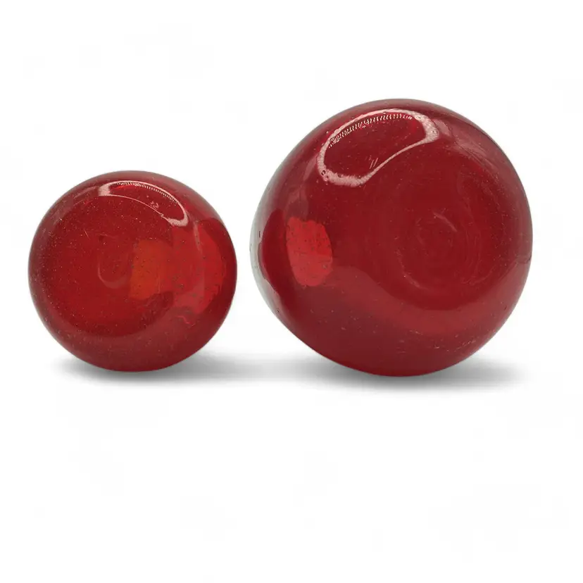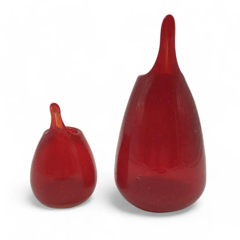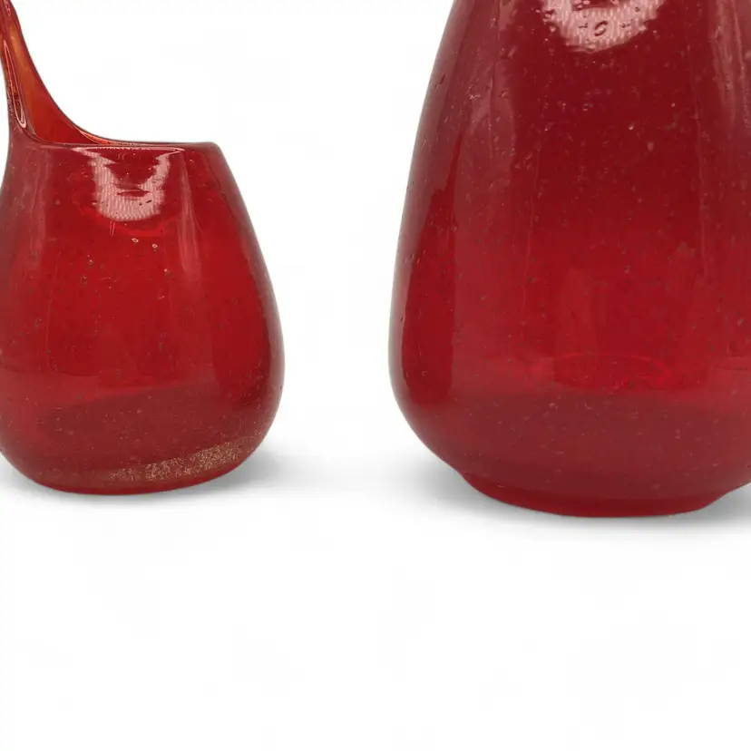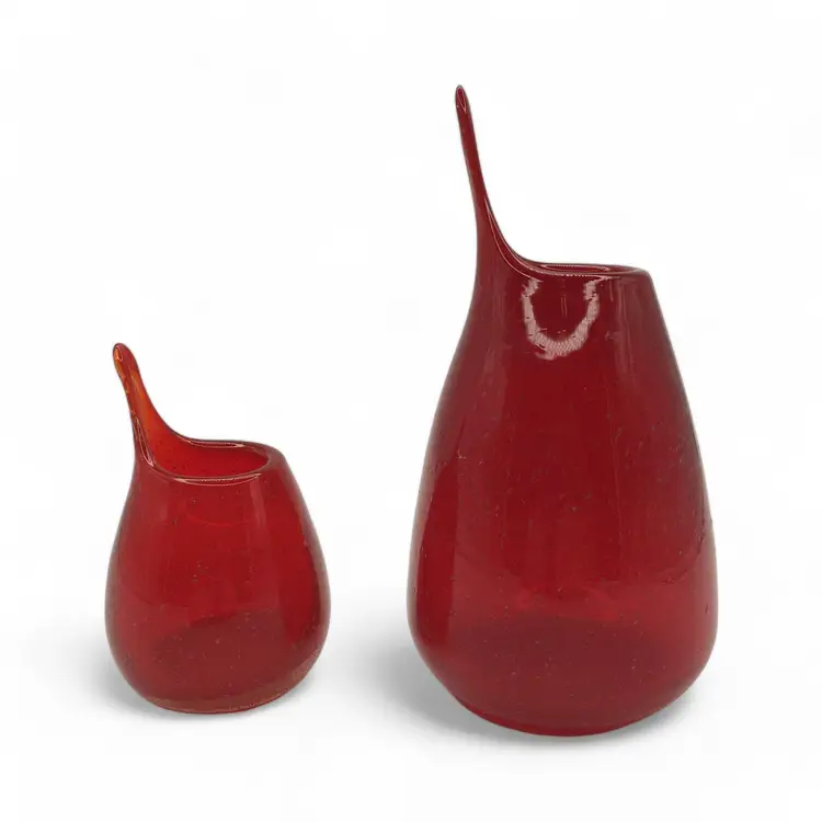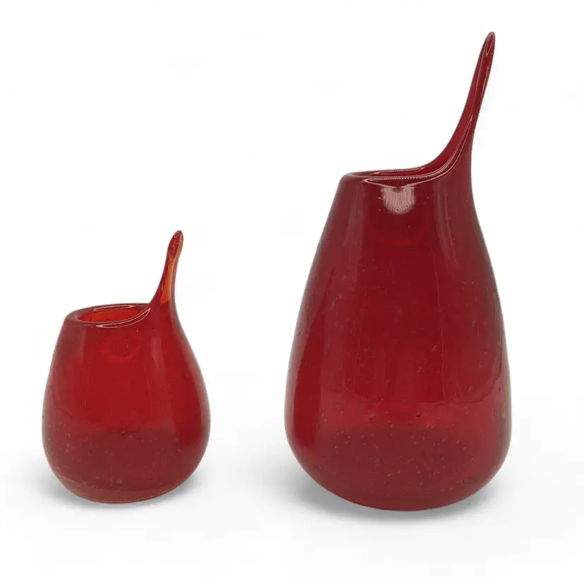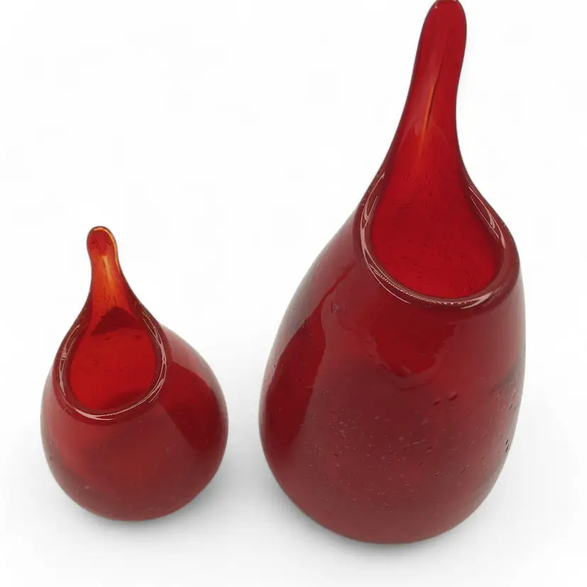 Details: ** Set includes 2 vases (one small, one large) ** Deep ruby red color with subtle air bubbles inside the glass ** Smooth polished bases ** Elegant, fluid sculptural design — perfect for modern, retro, or minimalist interiors ** Great for display, shelf styling, or gifting