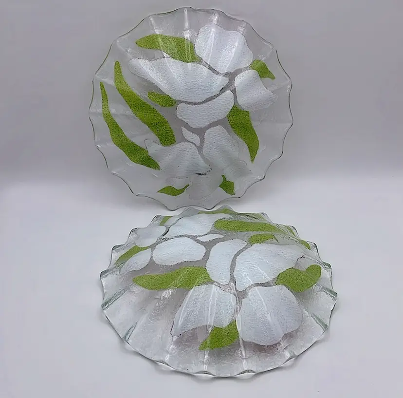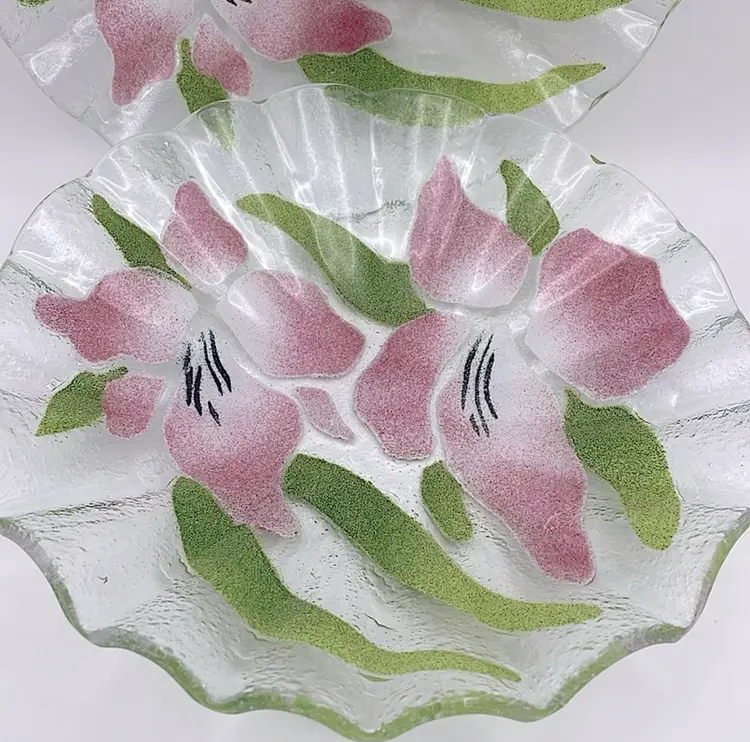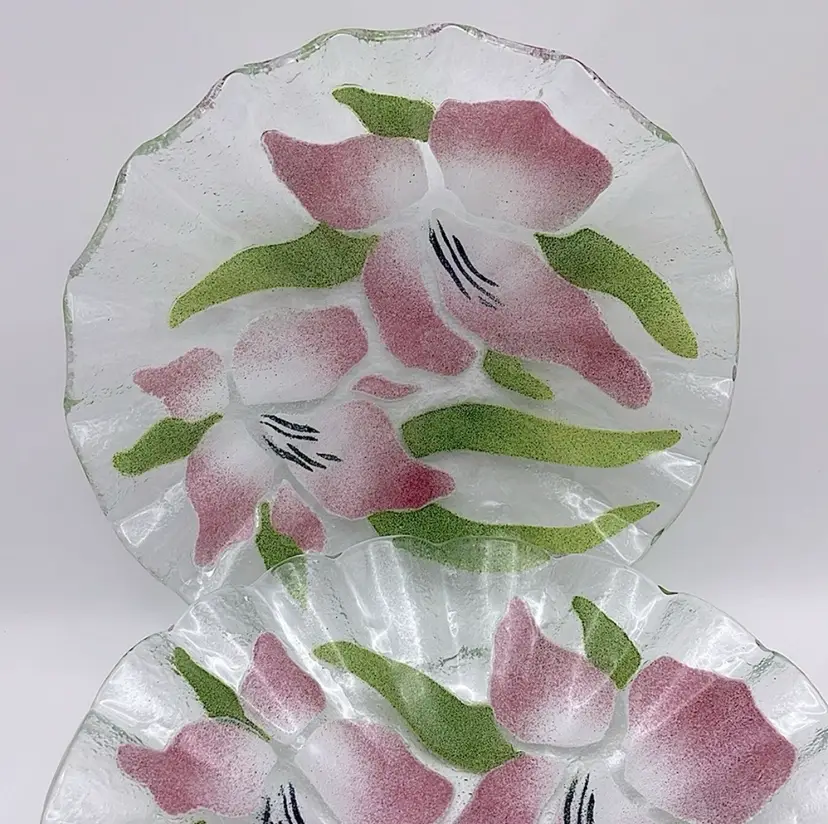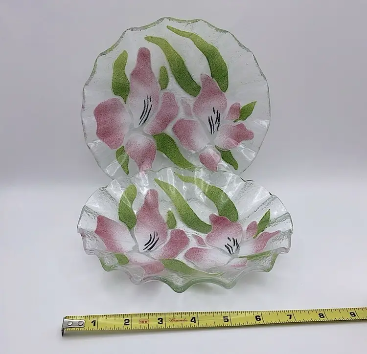 2 Sydenstricker Handmade Floral (Pink Lilies) Fused Art Glass Bowls, Signed “Syd” (Circled in pictures), Made in Brewster on Cape Cod in Massachusetts Please see pictures for measurement