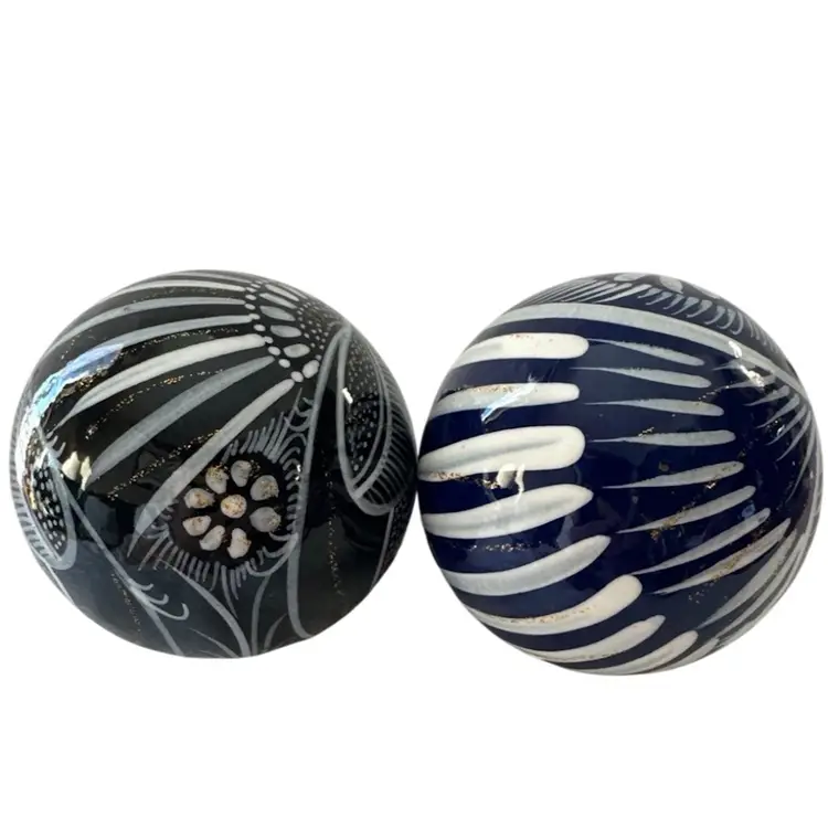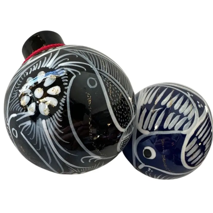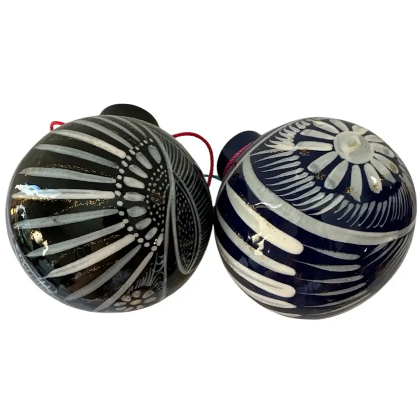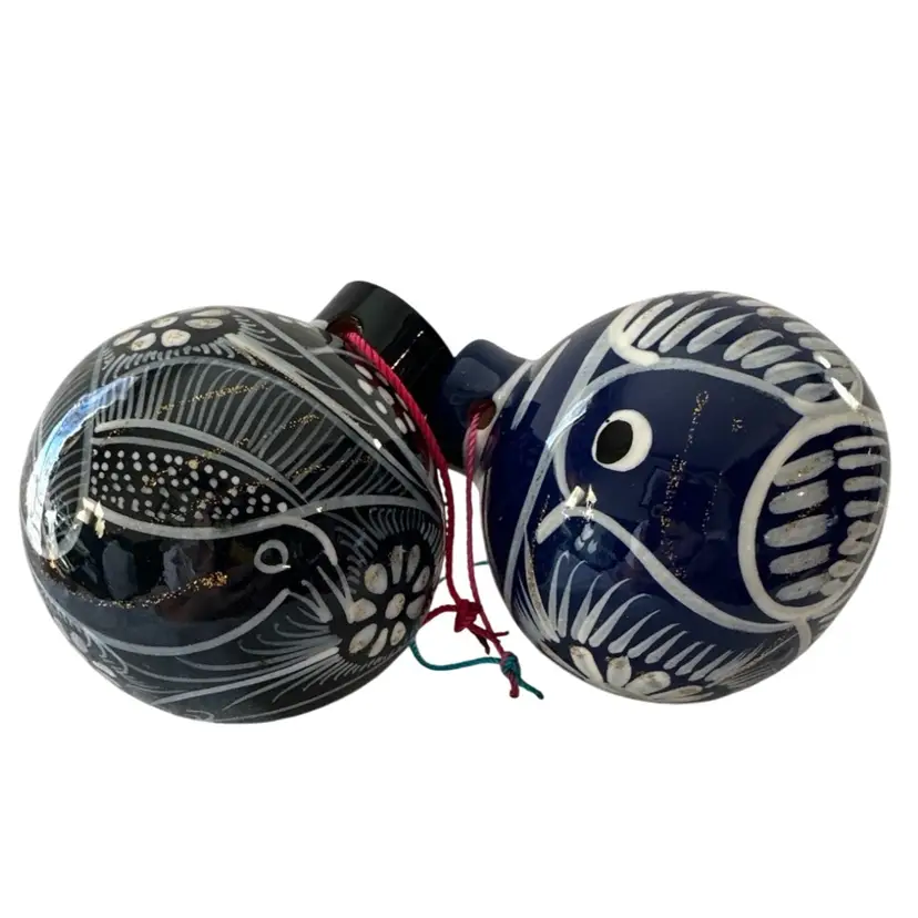 The product is a set of two Talavera Christmas ornament balls showcasing traditional Mexican ceramic folk art pottery with a colorful multicolor design. Handmade in Mexico, these ornaments feature intricate bird motifs that reflect the Mexican culture. Each ornament is a unique piece that adds a touch of authentic Mexican decor to any holiday or collection of collectibles.