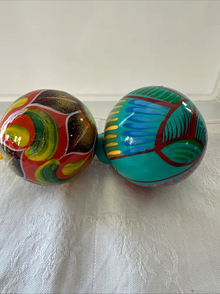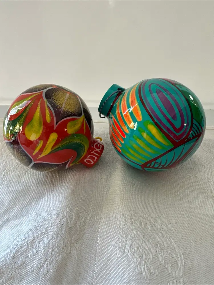 The product is a set of two Talavera Christmas ornament balls showcasing traditional Mexican ceramic folk art pottery with a colorful multicolor design. Handmade in Mexico, these ornaments feature intricate bird motifs that reflect the Mexican culture. Each ornament is a unique piece that adds a touch of authentic Mexican decor to any holiday or collection of collectibles. Bright colors glow with black light!