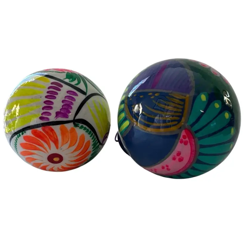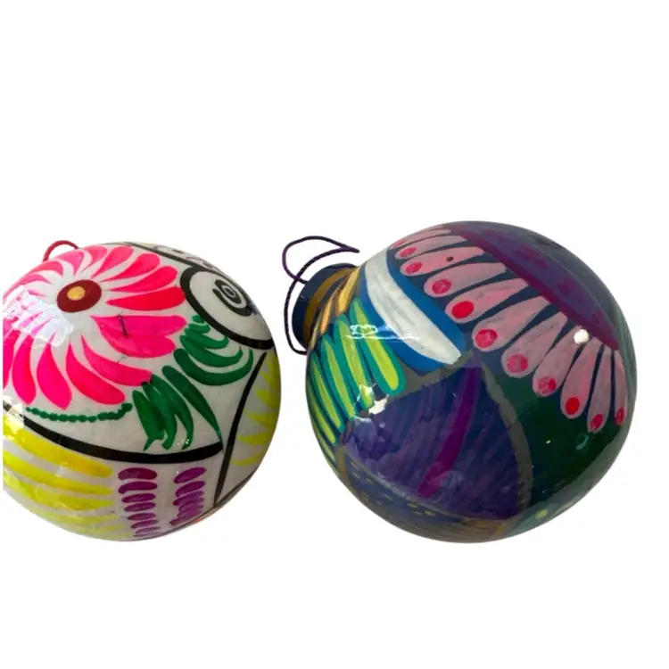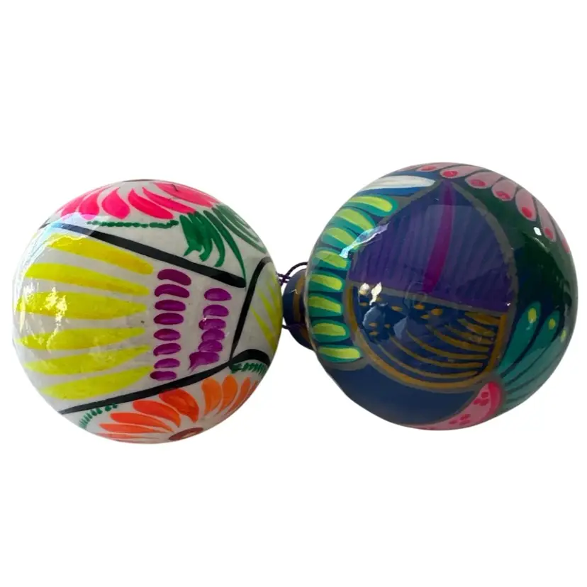 The product is a set of two Talavera Christmas ornament balls showcasing traditional Mexican ceramic folk art pottery with a colorful multicolor design. Handmade in Mexico, these ornaments feature intricate bird motifs that reflect the Mexican culture. Each ornament is a unique piece that adds a touch of authentic Mexican decor to any holiday or collection of collectibles. Bright colors glow with black light