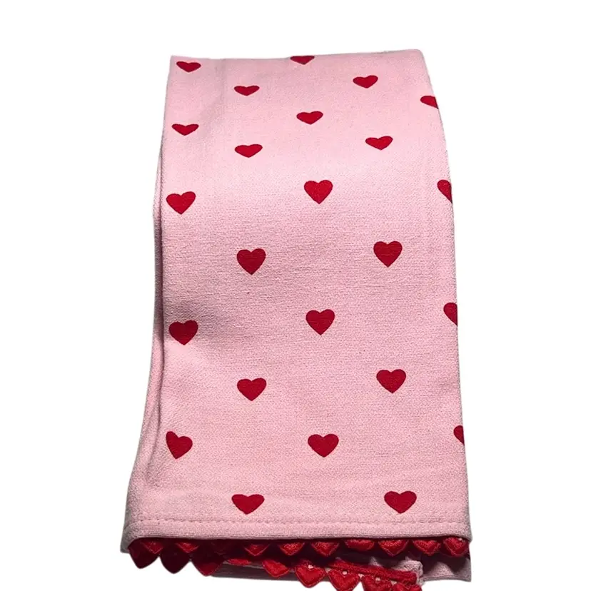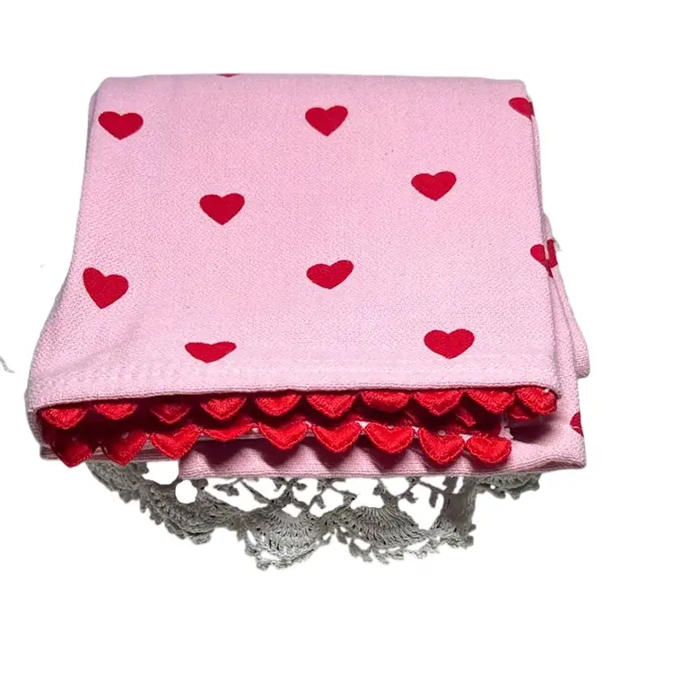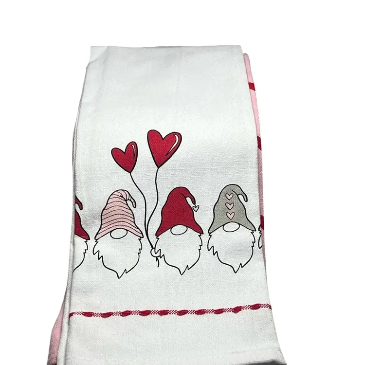100% cotton 1 with gnomes on white background and 2 with pink background with red hearts. No damage