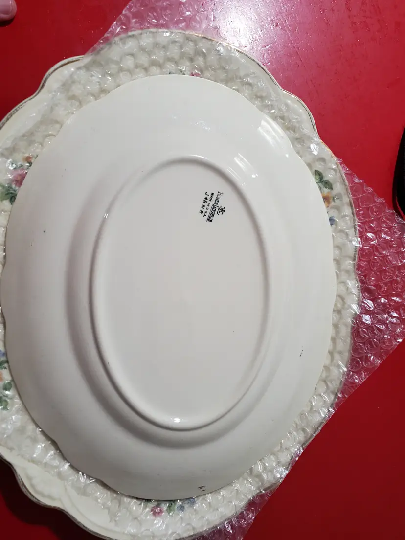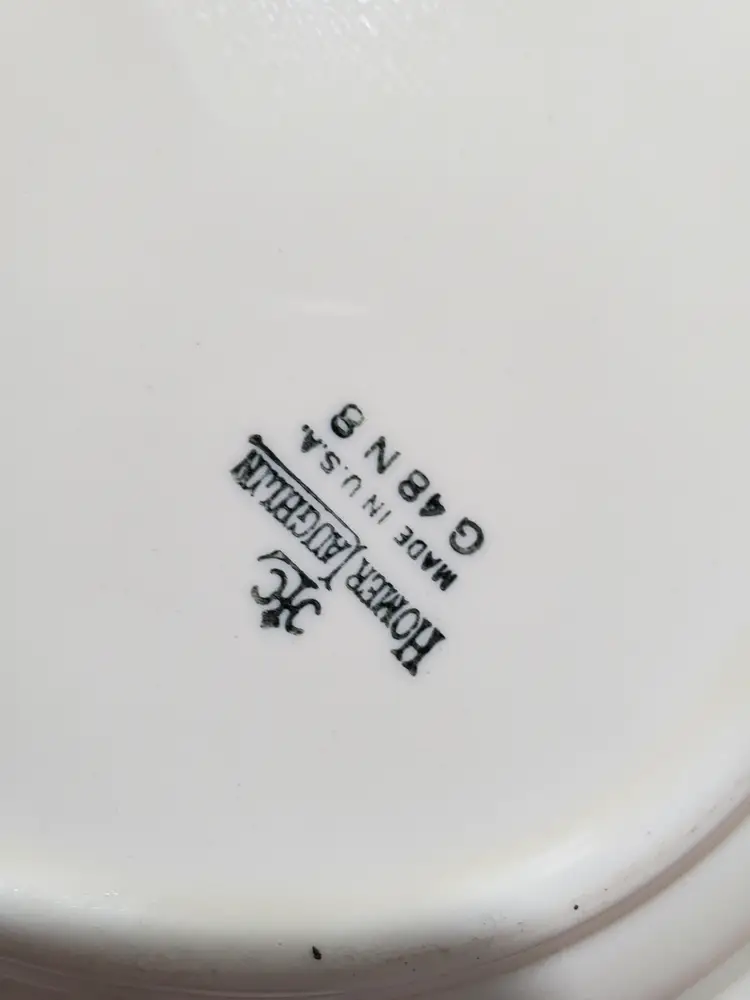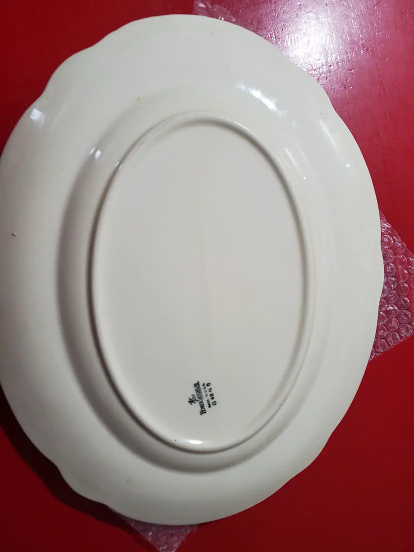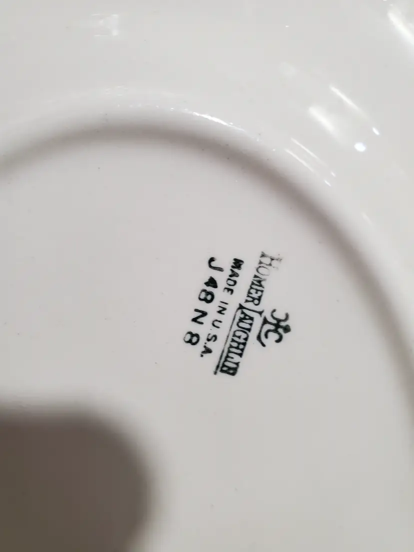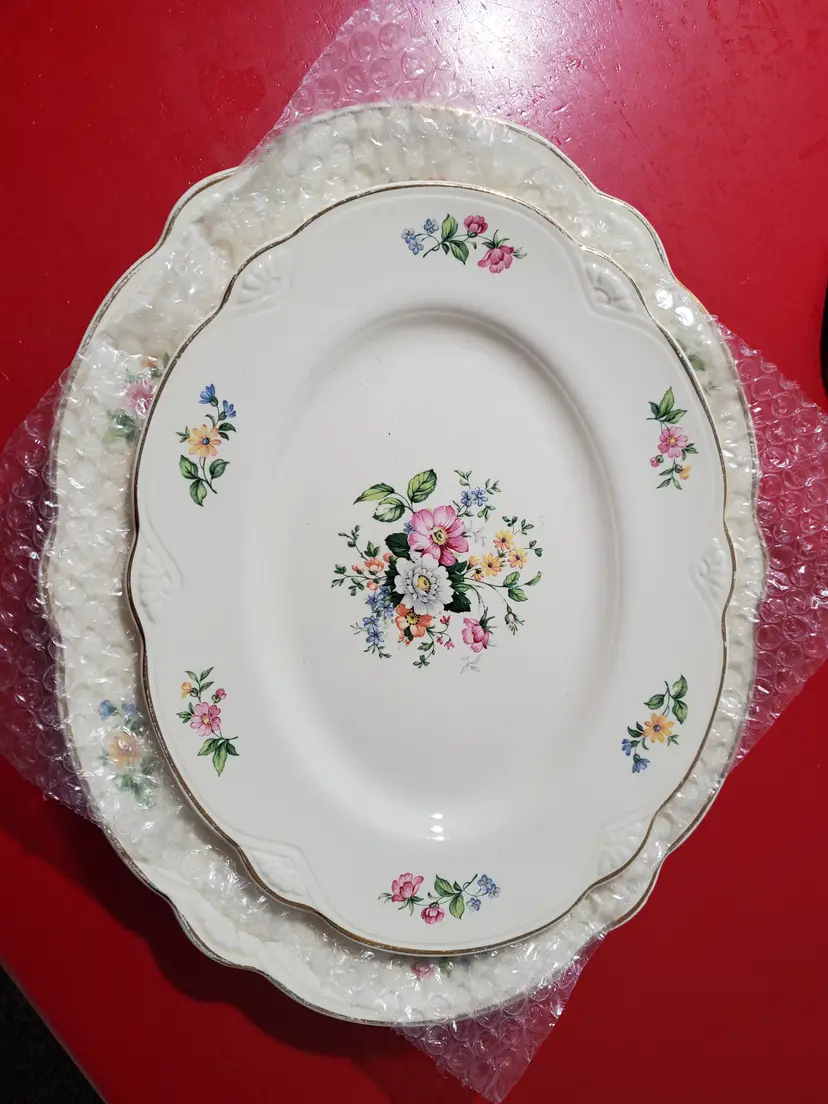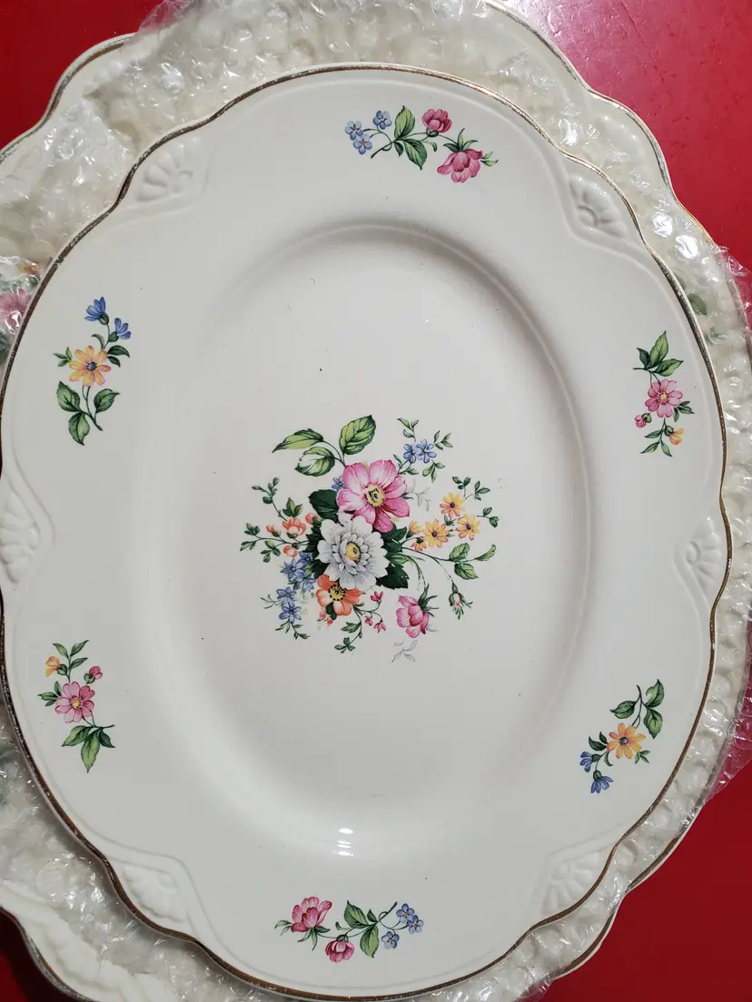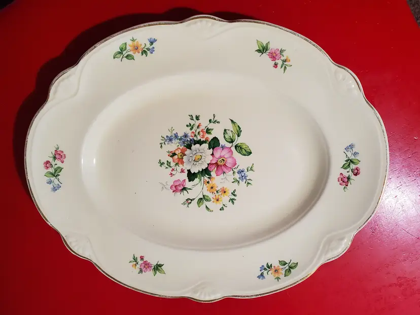 I believe this information is correct. Large plate is 14" across and the smaller plate is 11 3/4" Item#: 38720 Pattern Code: HLCSPRING Description: Marigold Shape, Floral Rim&Center Pattern: Springtime (Marigold) by Homer Laughlin Status: Discontinued. Circa: 1944 -