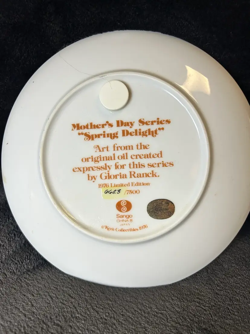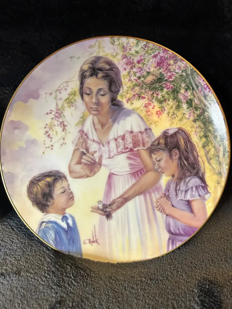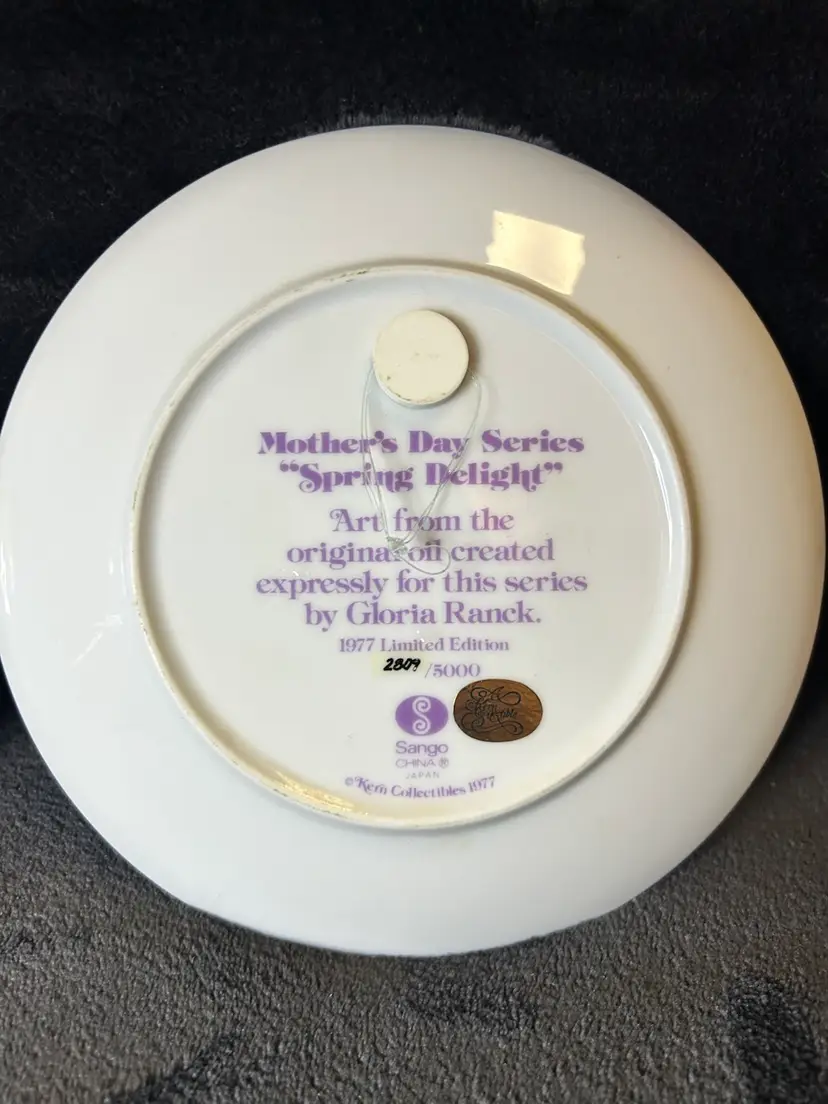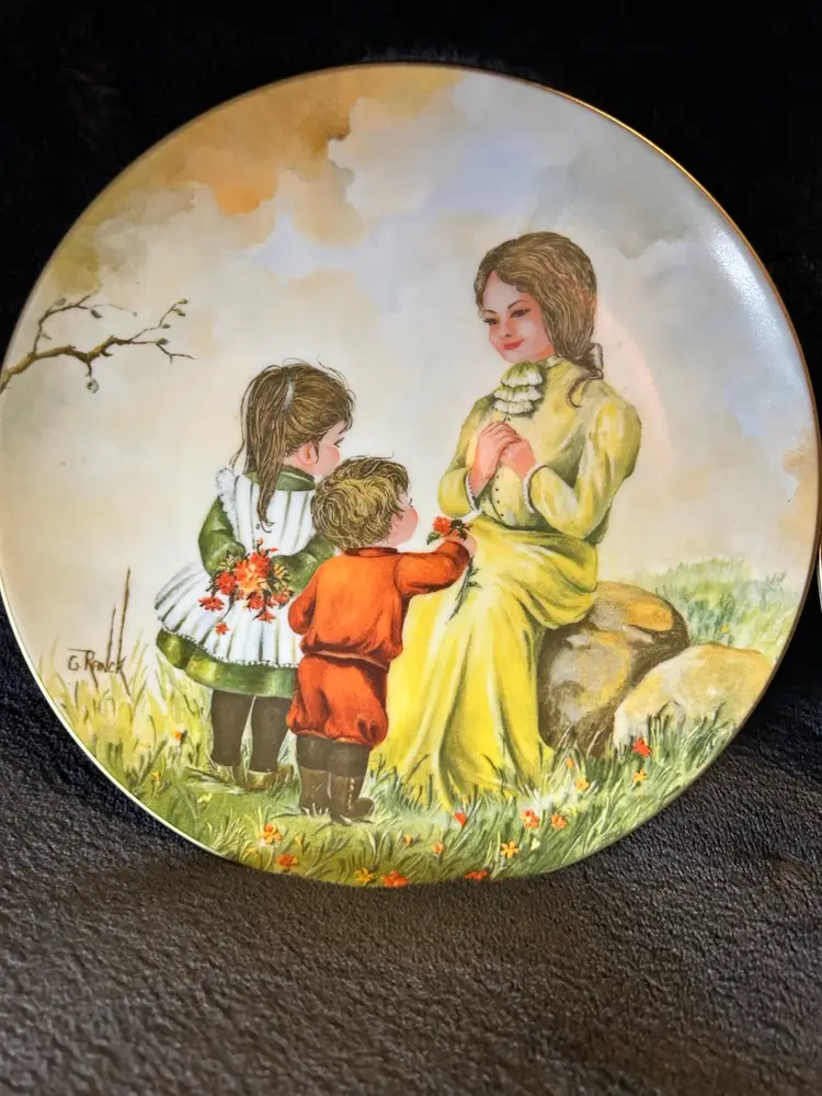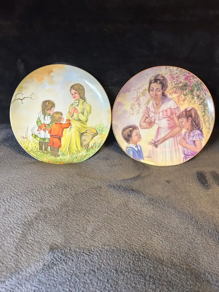 Two vintage collector plates from the 1976 and 1977 Gloria Ranck Mother's Day series. These decorative plates feature a multicolor design and are made of porcelain by Kern Collectibles Sango in the late 20th century. The plates showcase a decorative style with art pottery production techniques, reflecting the American culture of that era.