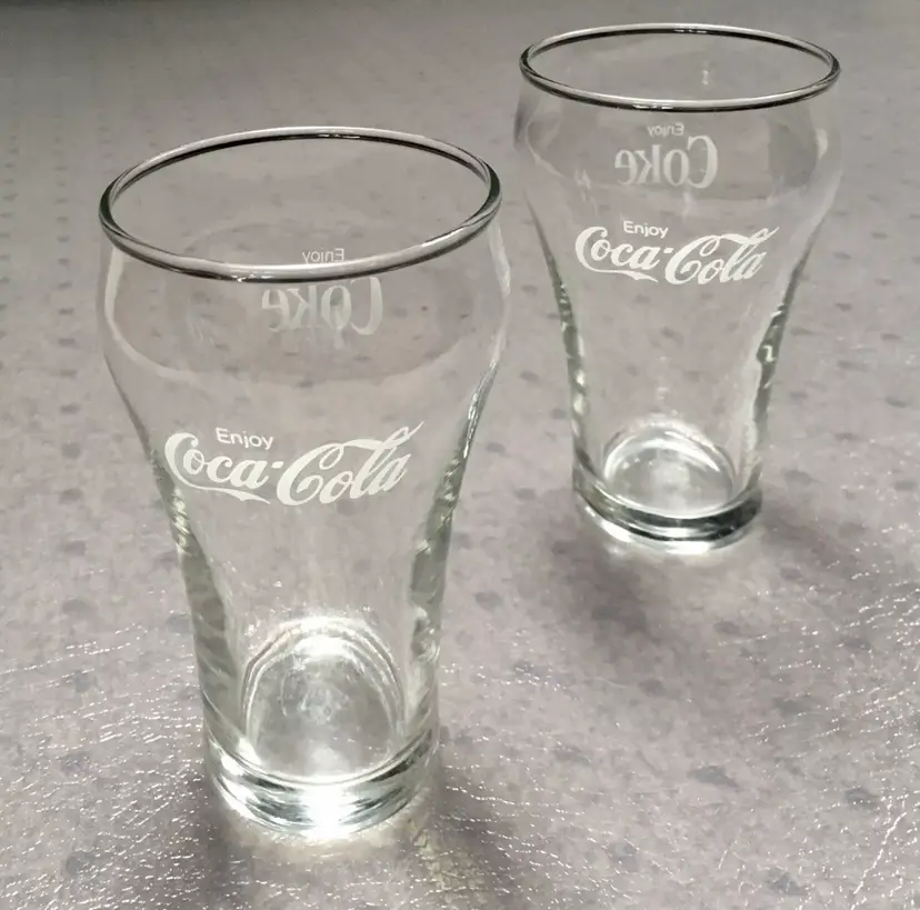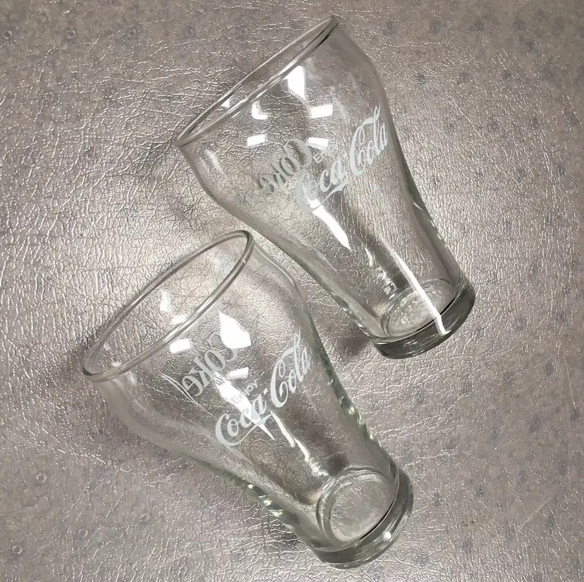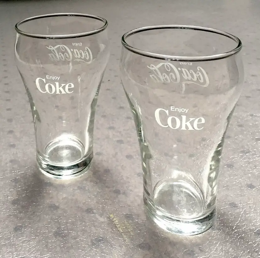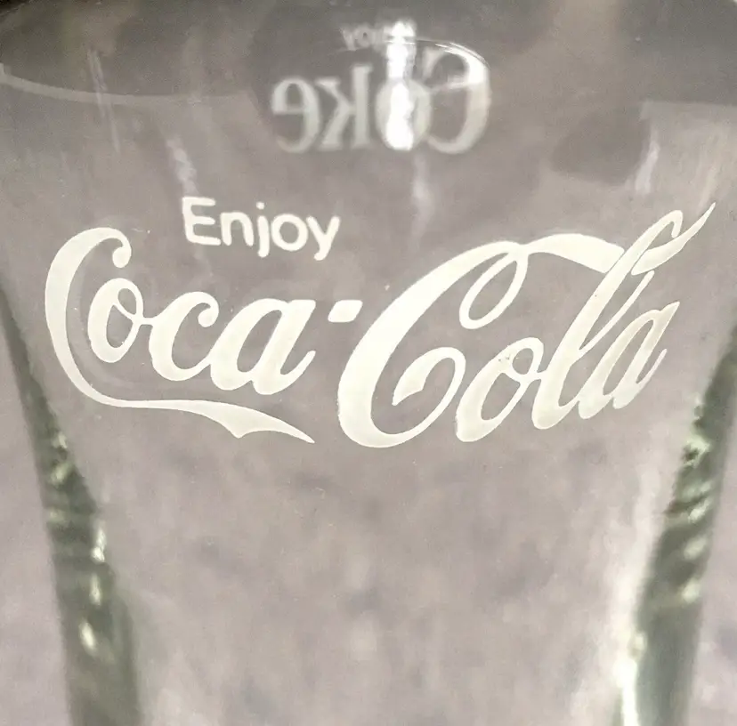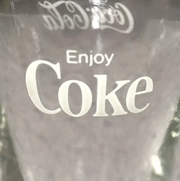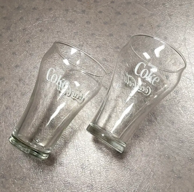 Vintage matching Coca-Cola/Coke clear soda fountain glasses with white lettering. Estimate these date to about the 1980s. Each glass reads Enjoy Coca-Cola on one side and Enjoy Coke on the opposite side. Like New Condition with no cracks or any other defects to the clear glass. White lettering on both glasses is excellent throughout. Both glasses stamped with a faint star on bottom. Each glass measures about 5”high. See pics for more details.