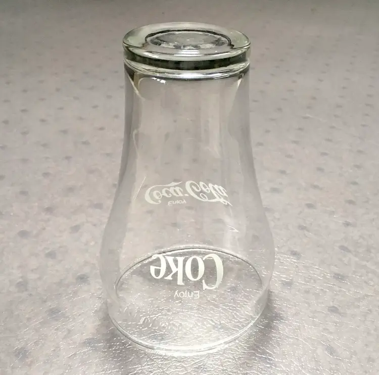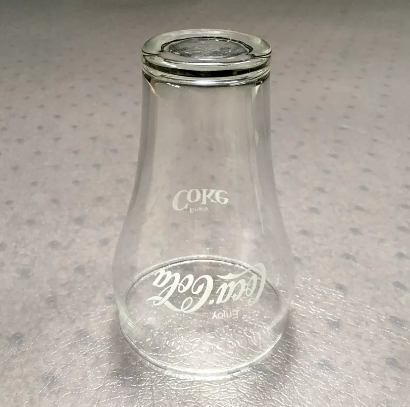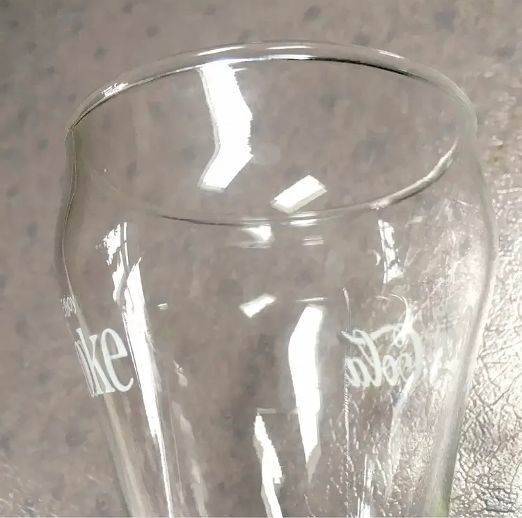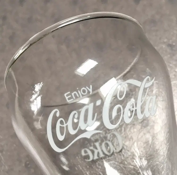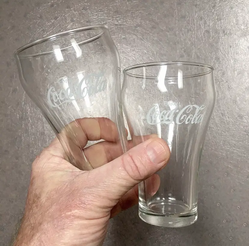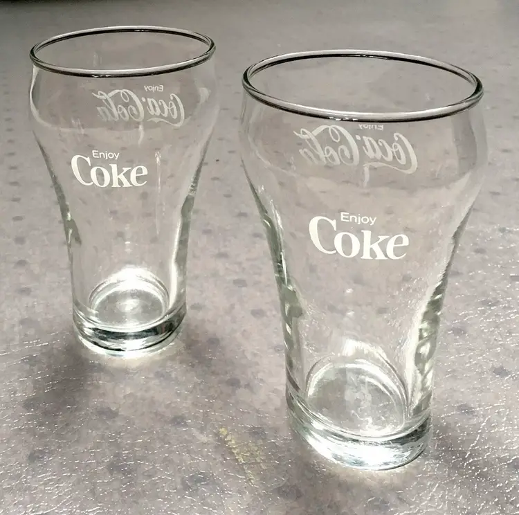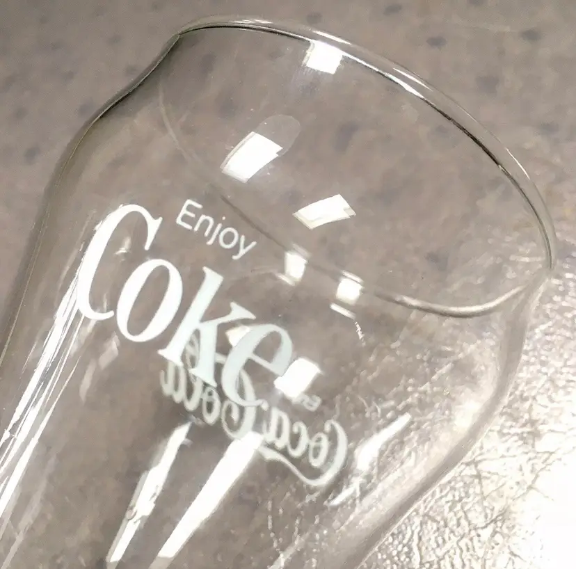 Vintage matching Coca-Cola/Coke clear soda fountain glasses with white lettering. Estimate these date to about the 1980s. Each glass reads Enjoy Coca-Cola on one side and Enjoy Coke on the opposite side. Like New Condition with no cracks or any other defects to the clear glass. White lettering on both glasses is excellent throughout. Both glasses stamped with a faint star on bottom. Each glass measures about 5”high. See pics for more details.