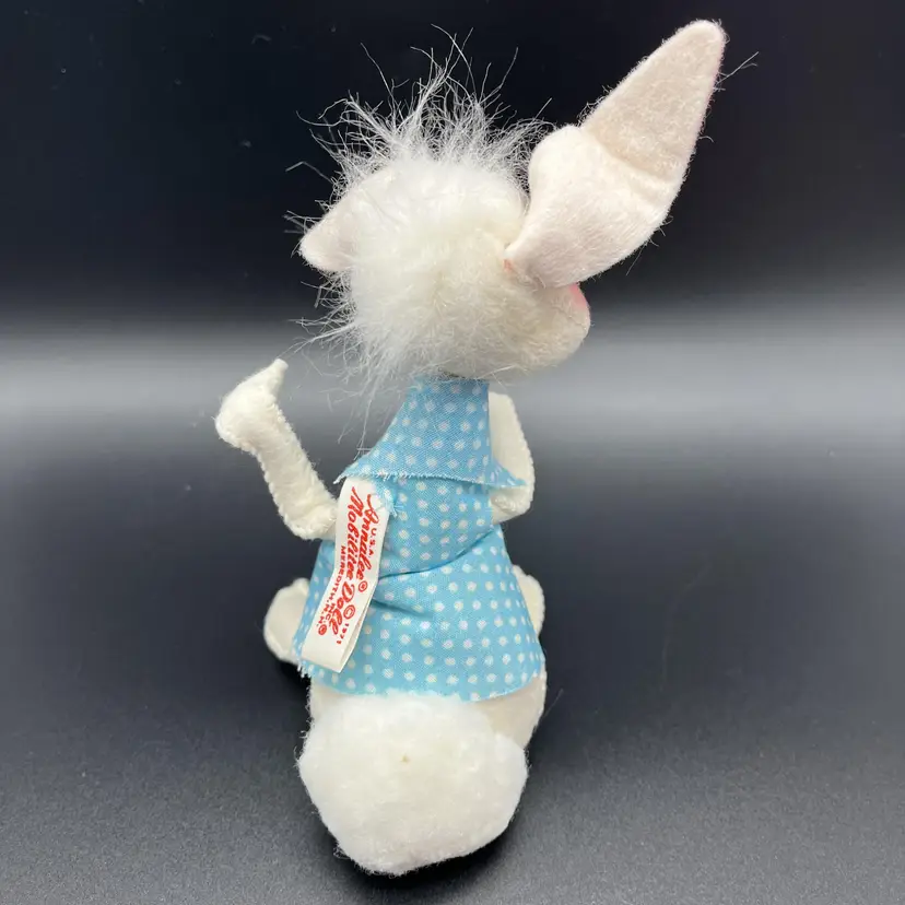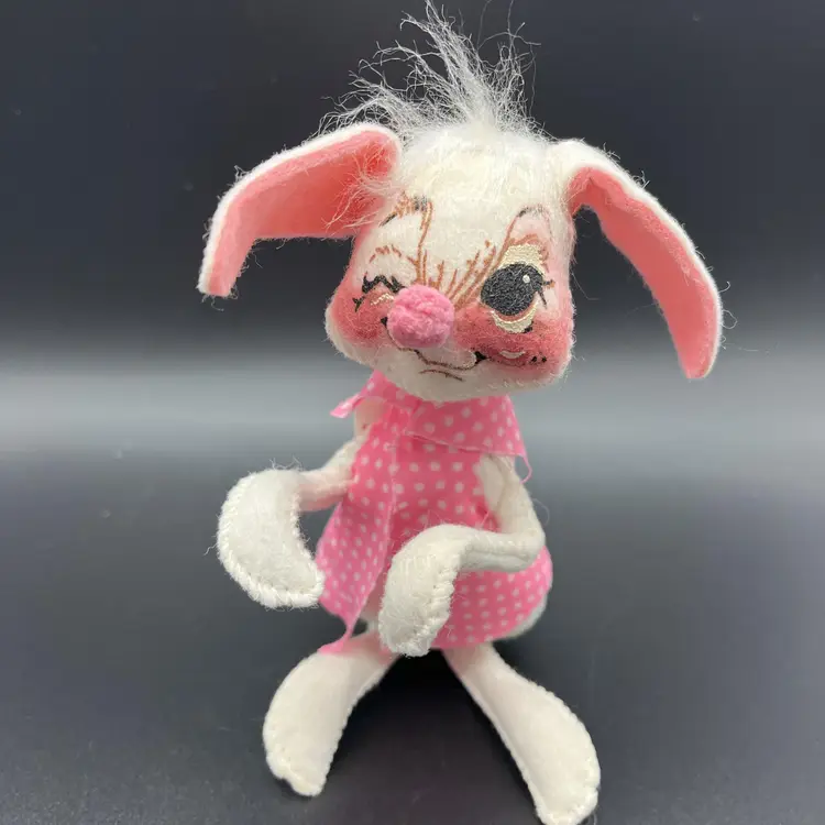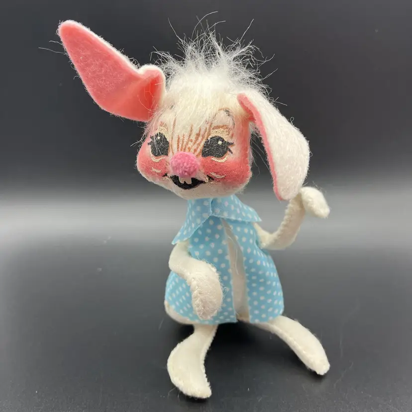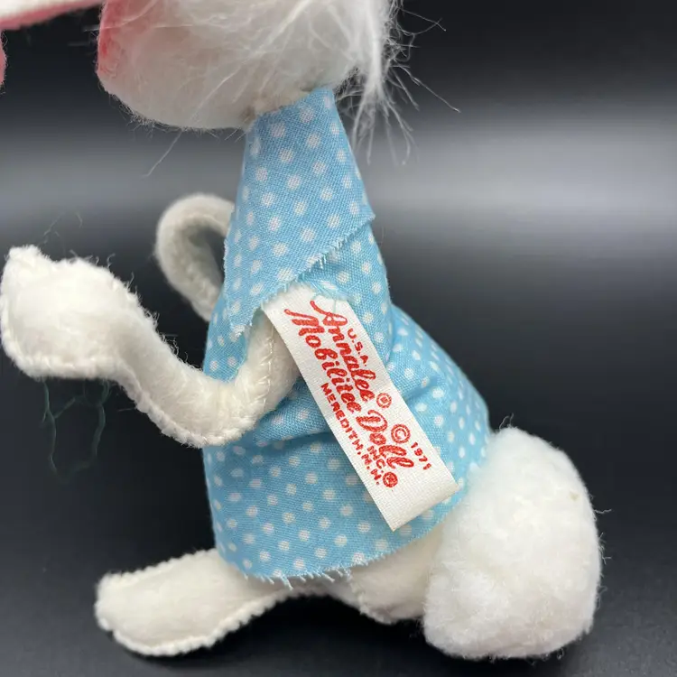 Handmade in 1971, these two 6-inch dolls feature a sweet bunny rabbit theme, perfect for the occasion. The girl doll has beautiful white straight hair and blue eyes, while the boy doll has a charmingly cute expression. Made with high-quality fabric, these original Annalee dolls are a great addition to any collection or display.