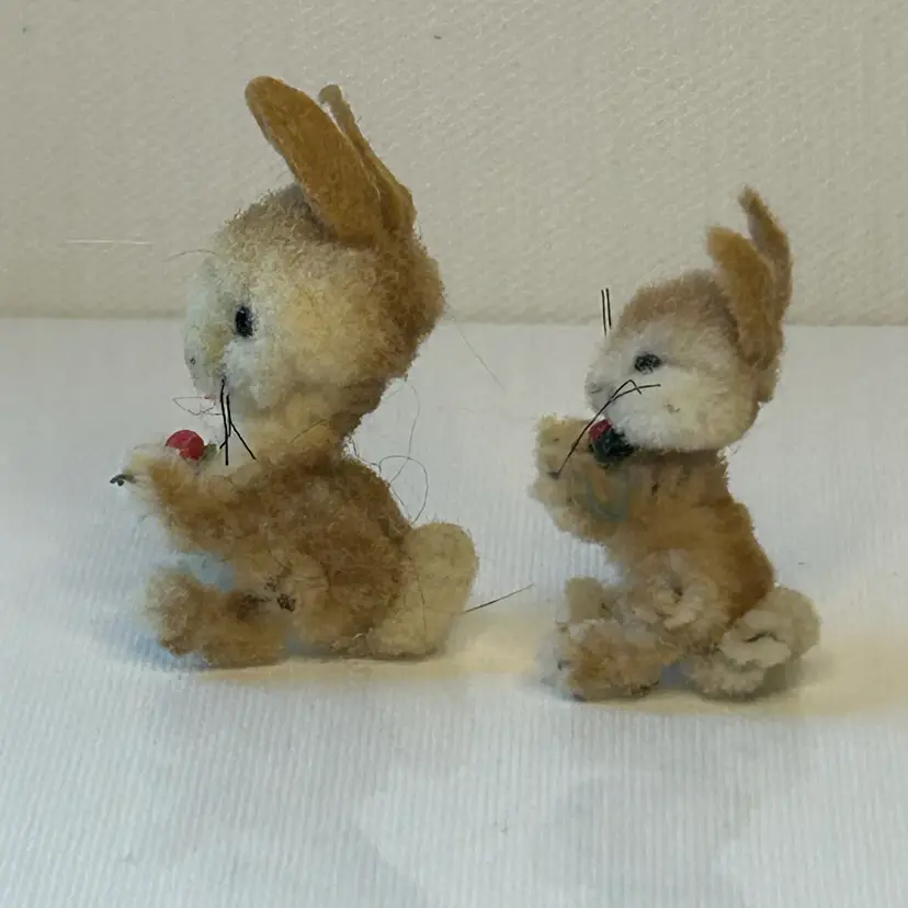 Wool Chenille Stem Bunny Rabbit Pocket Pet Toy Figures Designed by Ara, Austria Small 1-1/2” tall to tips of ears Large 2” tall to tips of ears Bendy construction Red plastic eyes Clear whiskers Holding fruit in one paw c1960s to 70s Ara Jeretzian Austria was famous for their exquisite handmade 100% wool pipe cleaner/chenille stem animals made 1950s to 70s.