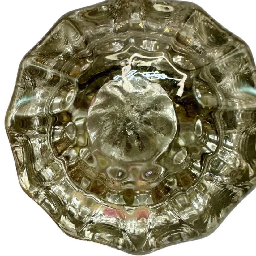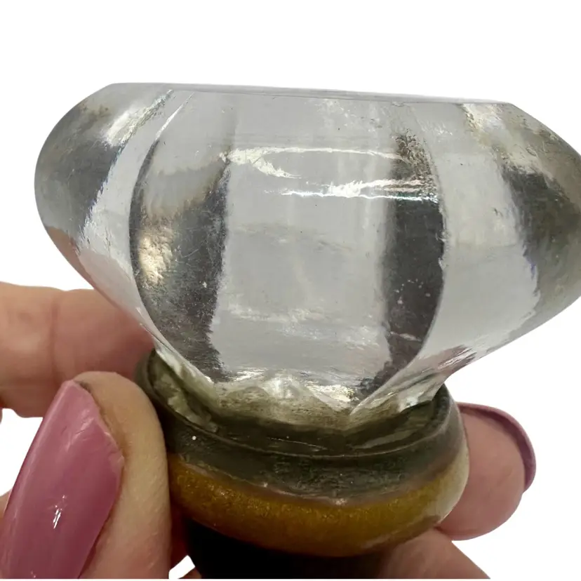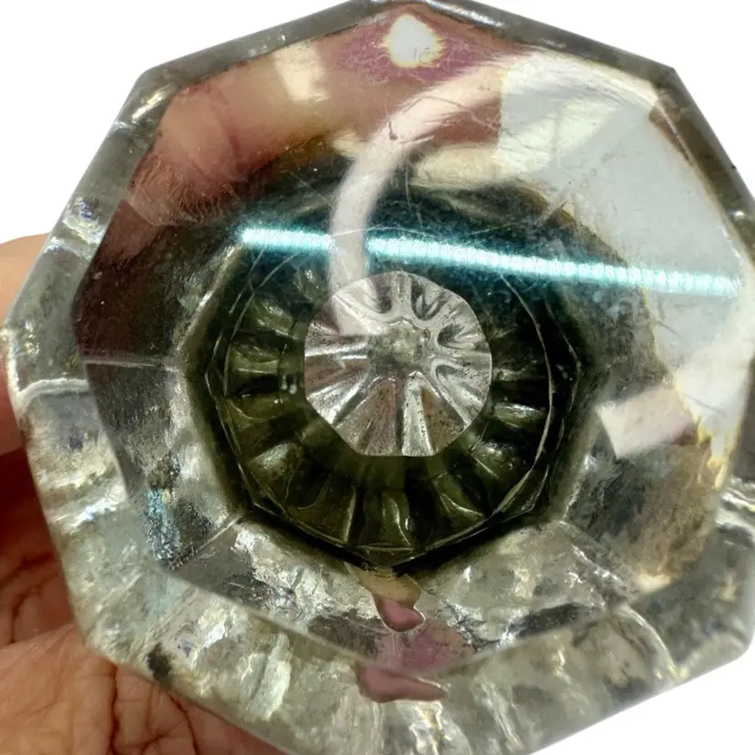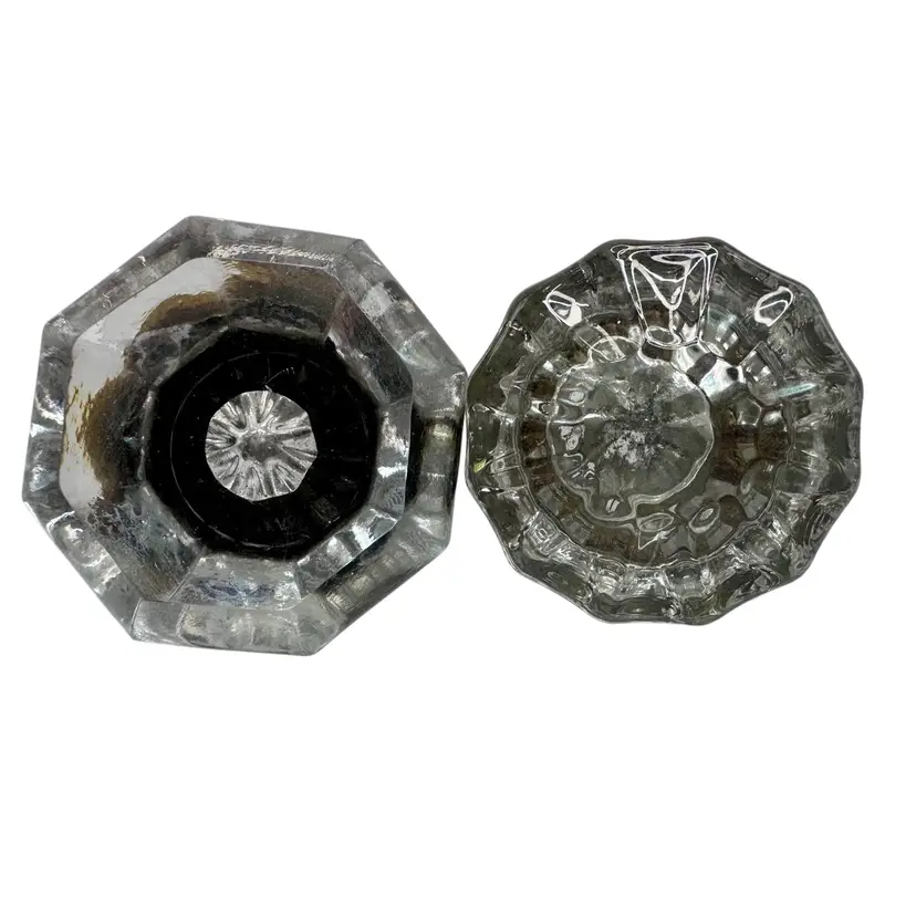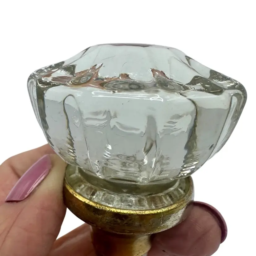 2 inch circles at top 2 Vintage Clear Glass Brass color Door Knobs Preowned and used condition with scratches on glass and signs of use/scratches on brass color. As Shown - It is missing parts needed to install on doors