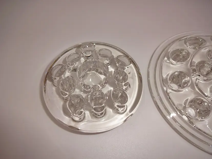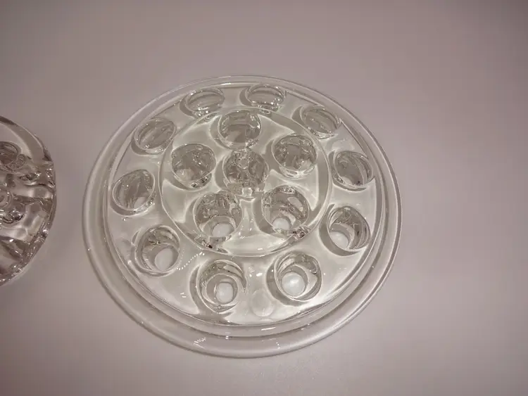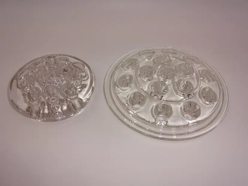 Good pre-owned condition. Two round, clear glass flower frogs (11 (the middle one is bigger) and 16 holes). Approximate measurements: 3-1/4" x 1-1/8" and 5-1/8" x 3/4". No chips, cracks or stains. Light scuffs consistent with age/use.