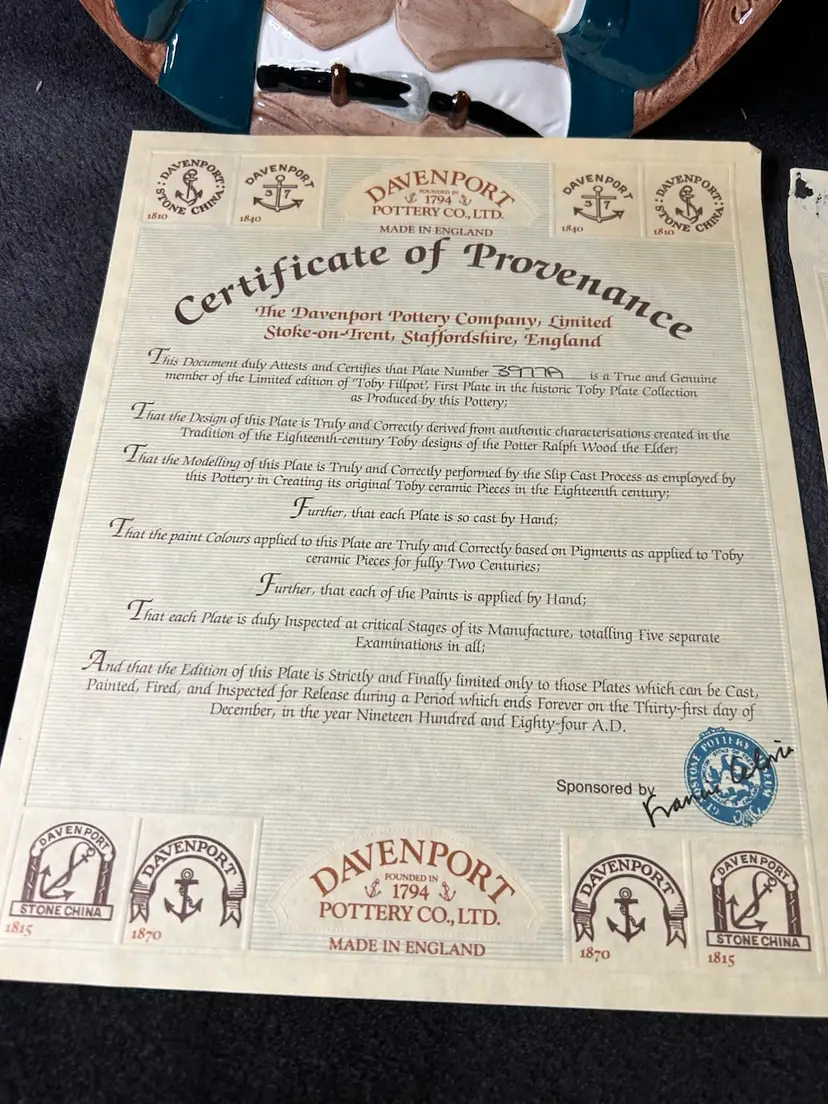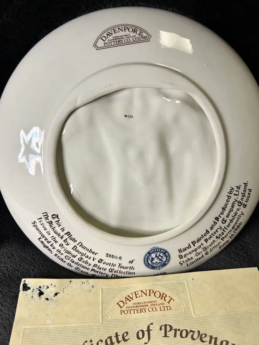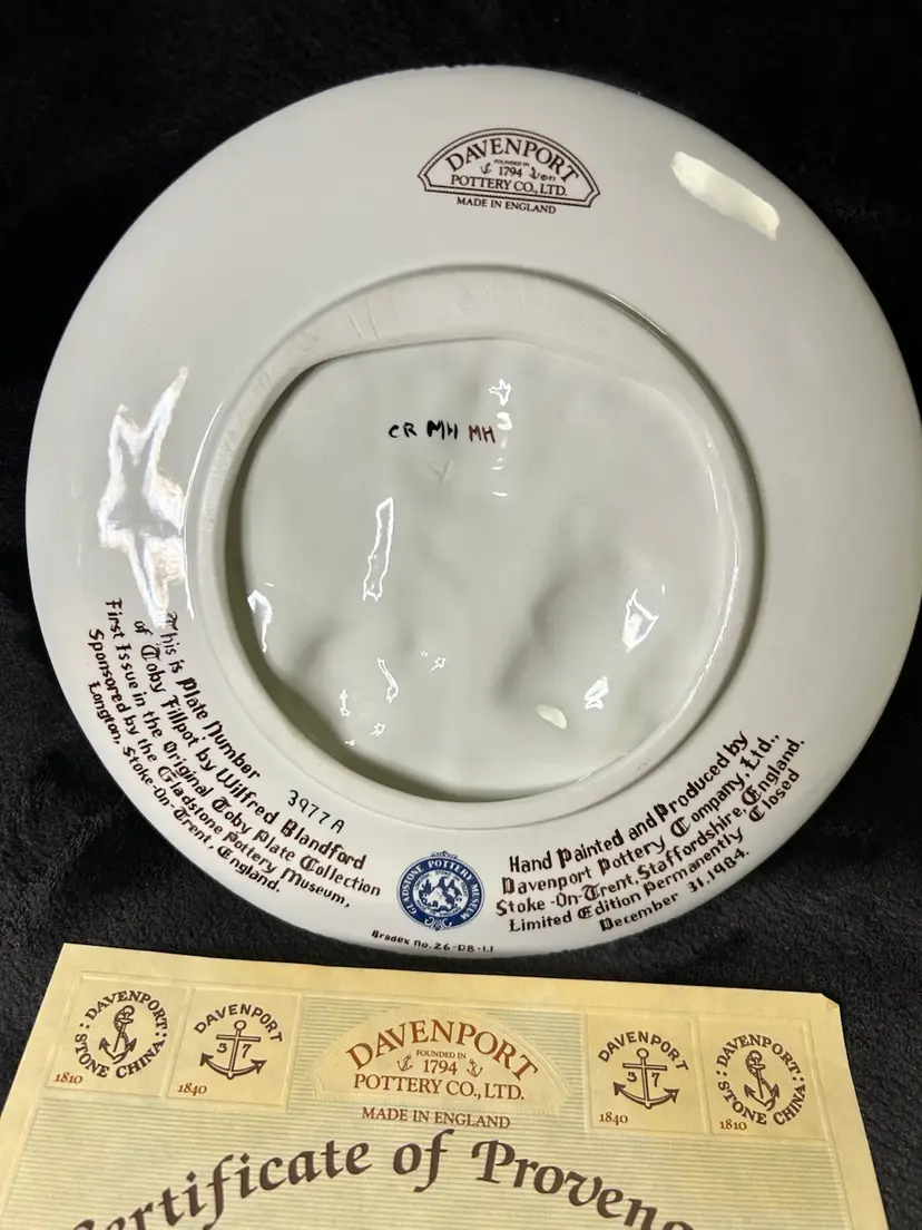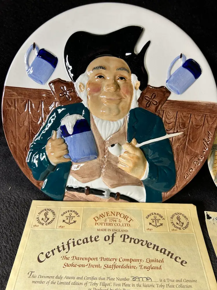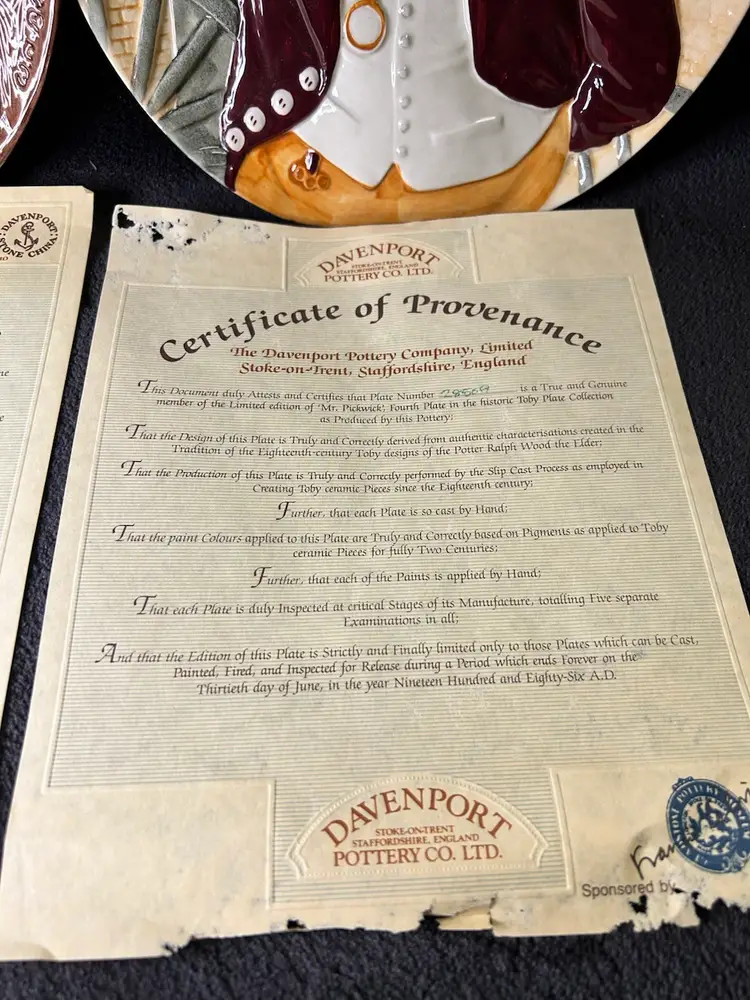 A set of two vintage Davenport Pottery collector plates featuring Mr. Pickwick and Toby Fillpot. These multicolored pottery plates are adorned with British-themed designs and come with certificates of authenticity. Perfect for collectors of decorative pottery, these plates showcase the craftsmanship and artistry of Davenport Pottery, adding a touch of history and charm to any home decor.