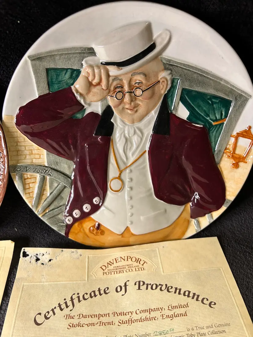 Mr. Pickwick Toby Plates from the Davenport Pottery Toby Plate Collection. These ceramic plates depict characters from Charles Dickens' novels.