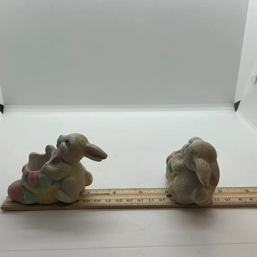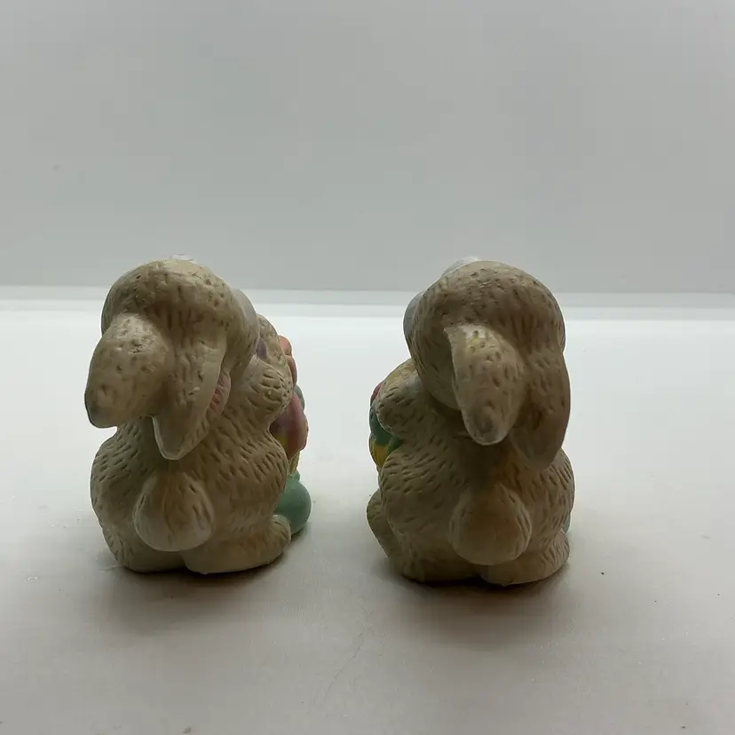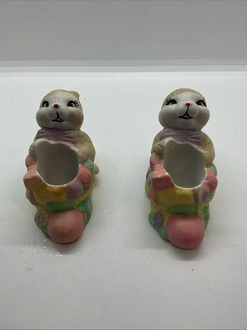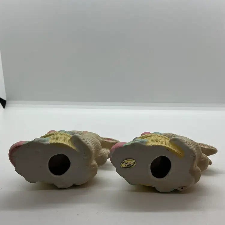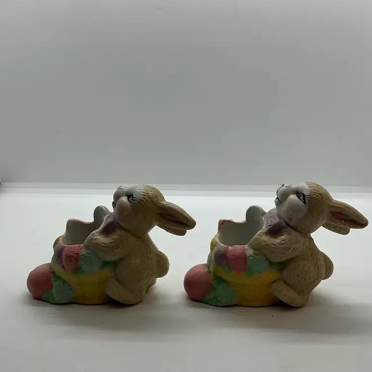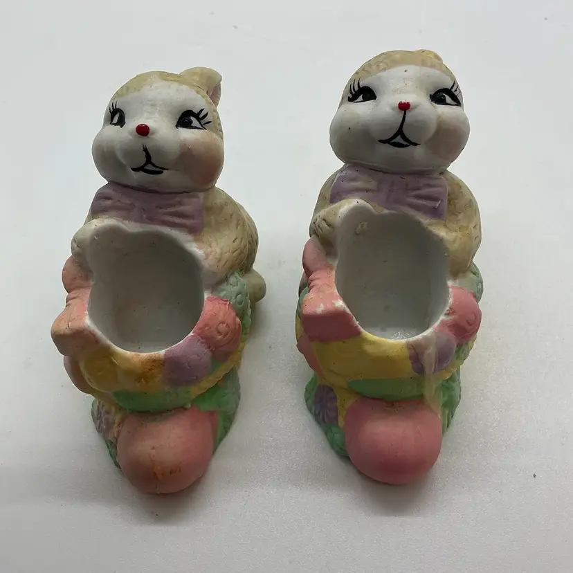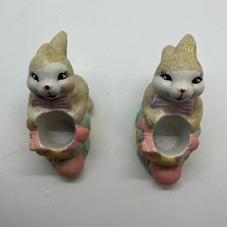 Set of two vintage ceramic candle holder figurines featuring Easter bunny rabbits. The colorful figurines are from China and are perfect for adding a festive touch to your home during the Easter season. Comes from a non smoking home. No chips or cracks.