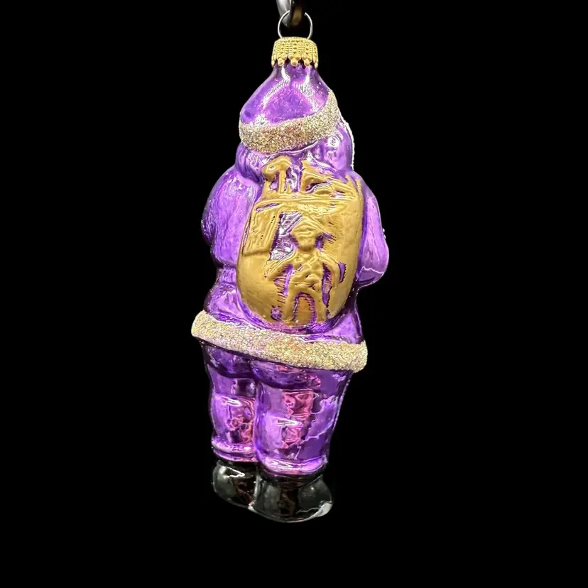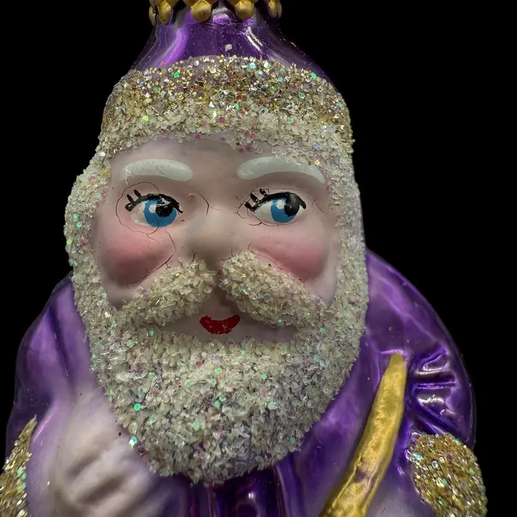 Condition - Preowned - Good - some signs of use and age including some wear to glitter embellishments and cracking paint on the faces. The purple Santa has some peeling and cracking paint on the feet.