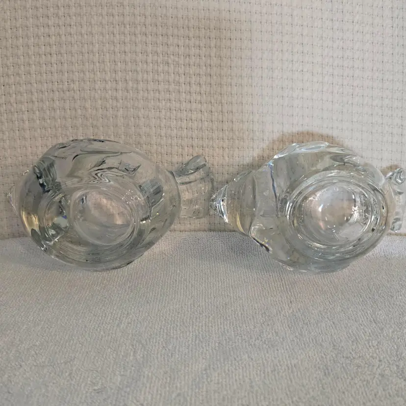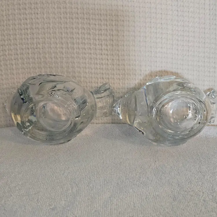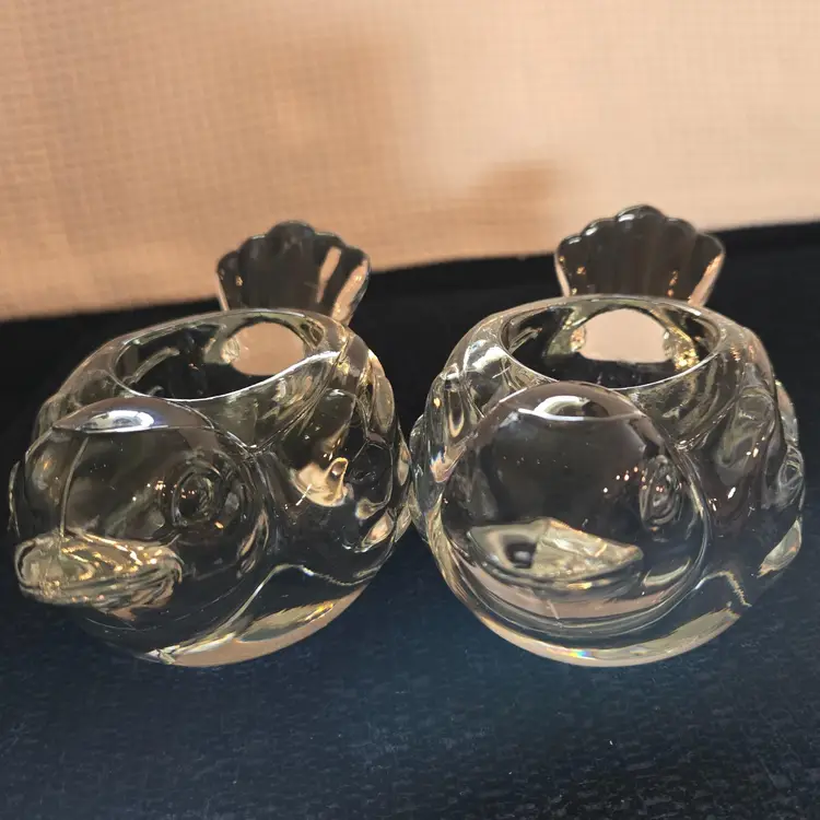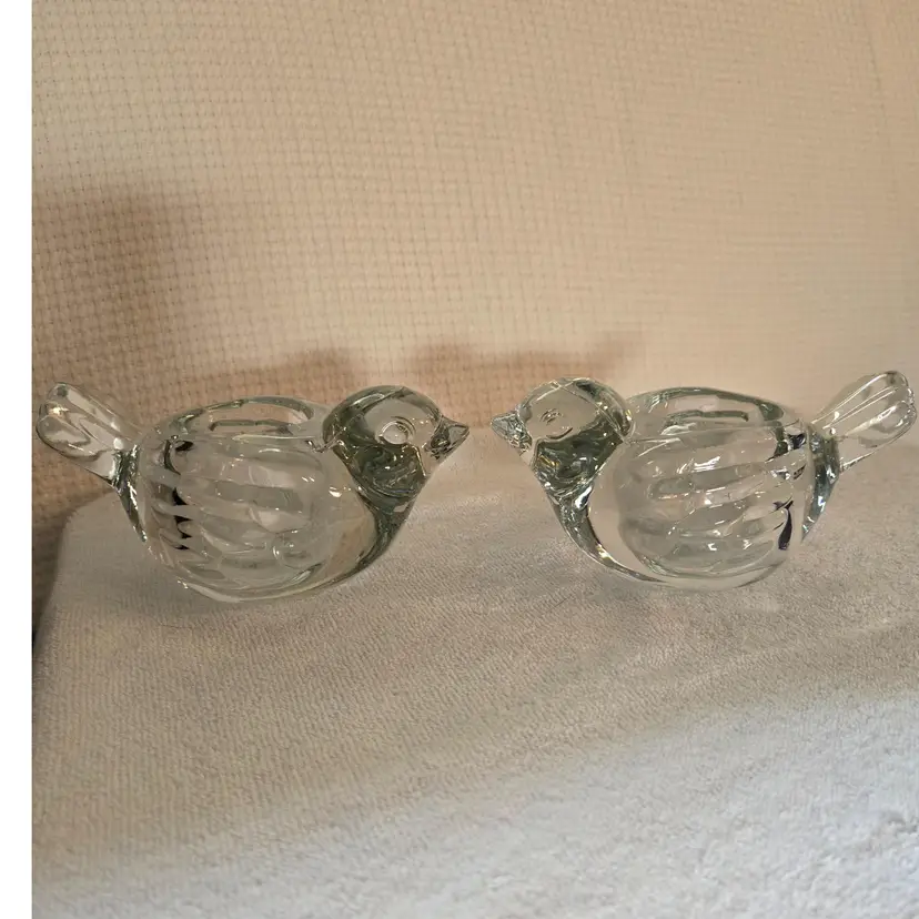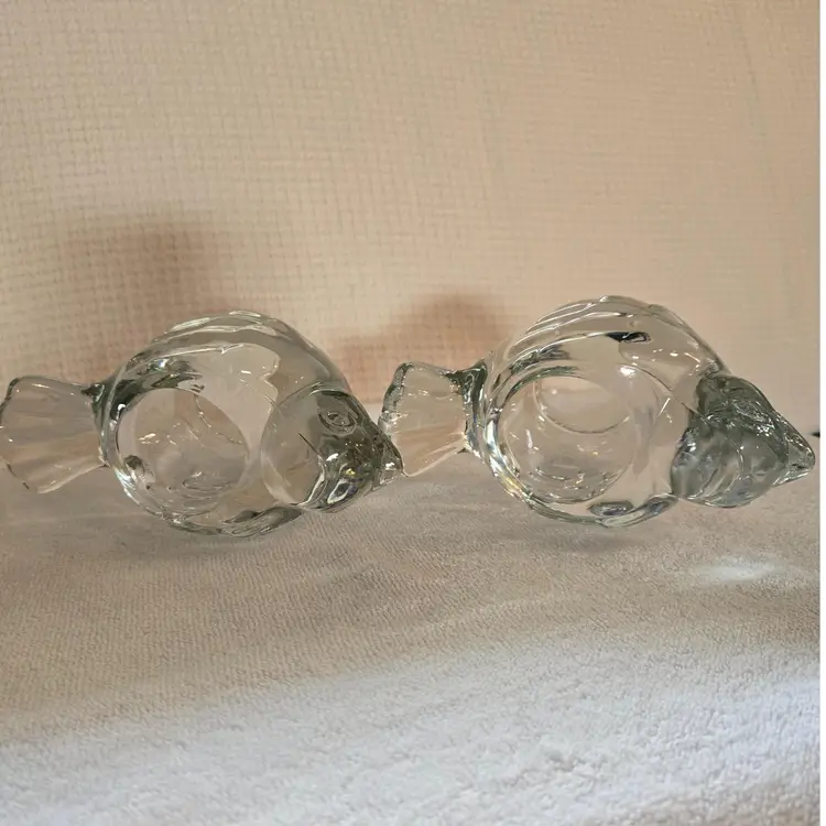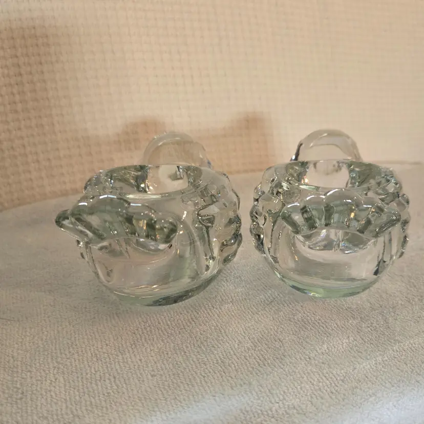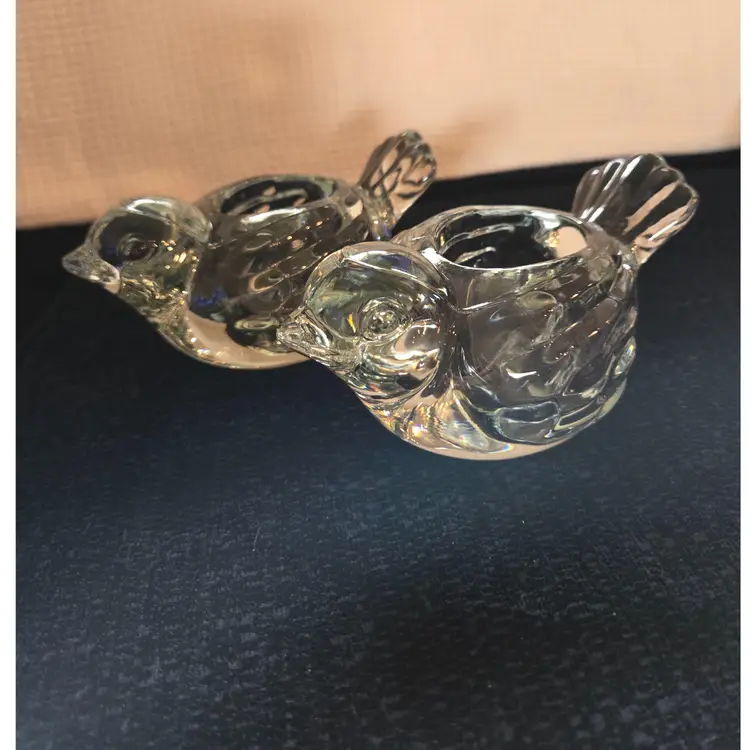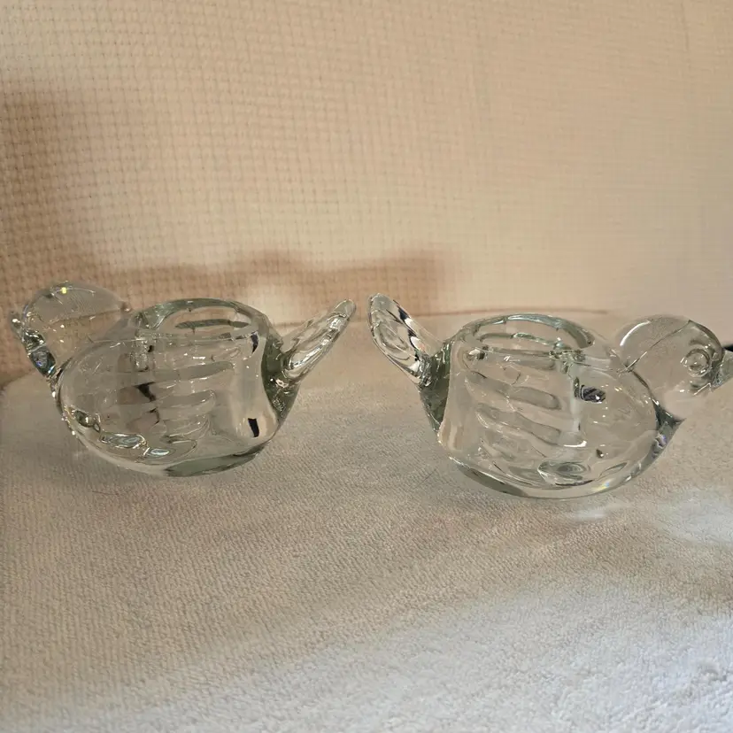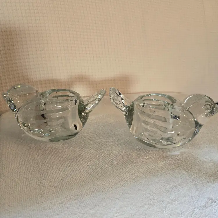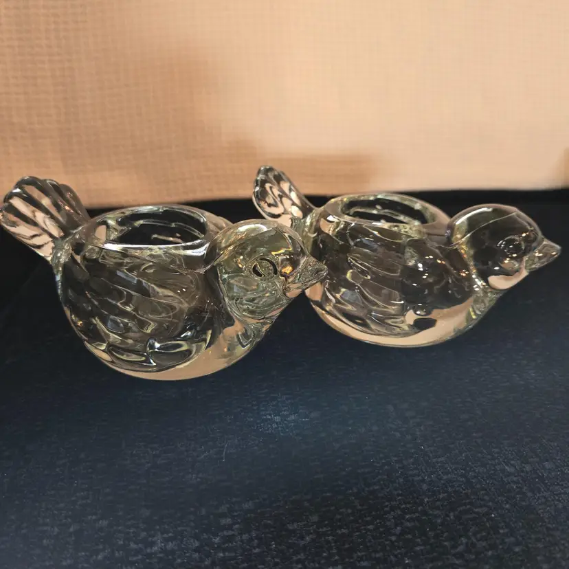 2 heavy Indiana crystal clear dove votive tealight candle holders. They measure 6" long, 3 1/4" wide, and 2 1/2" tall. In excellent condition. No chips, cracks, or repairs.