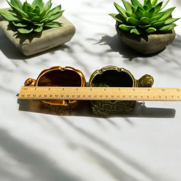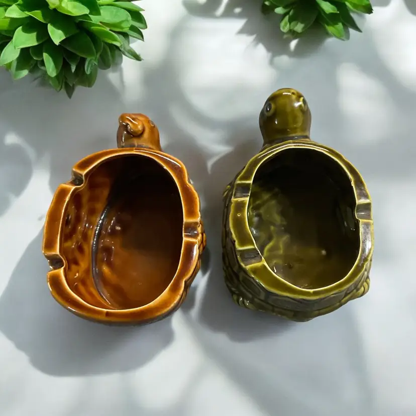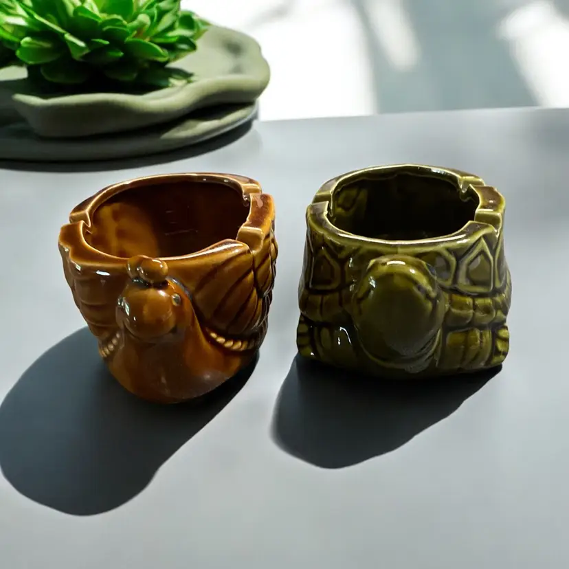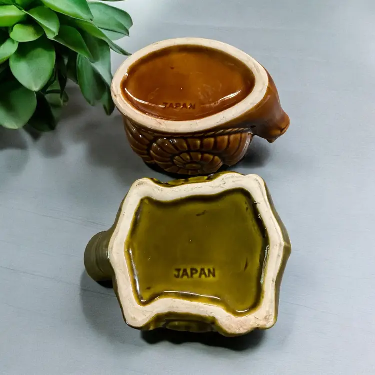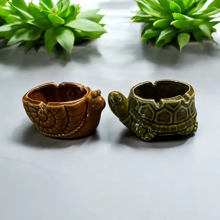 This unique vintage set features two made-in-Japan ashtrays/planters shaped like a snail and a turtle. The intricate details of these charming collectibles make them perfect for any tobacco enthusiast or collector. Crafted in Japan, these pieces are sure to add some Asian artistry to your collection.