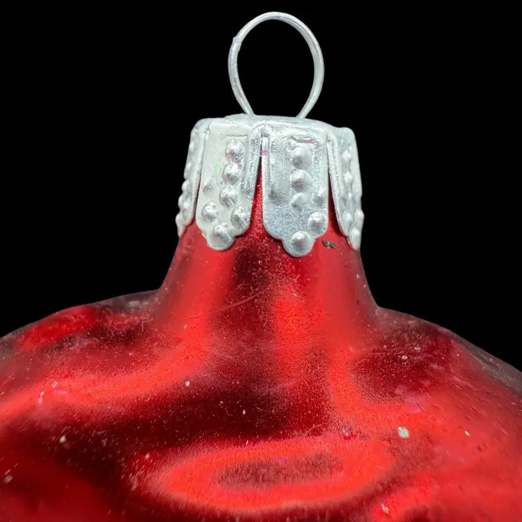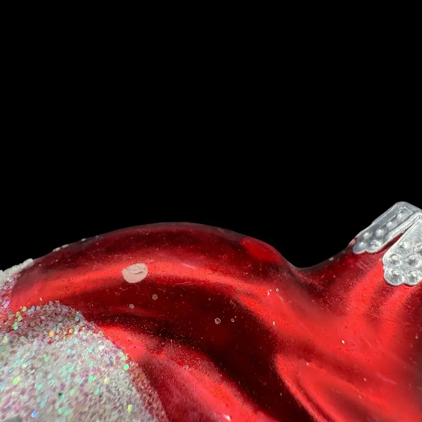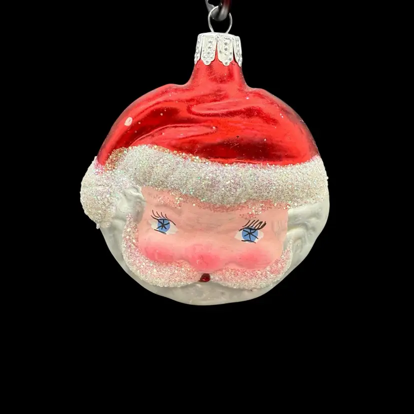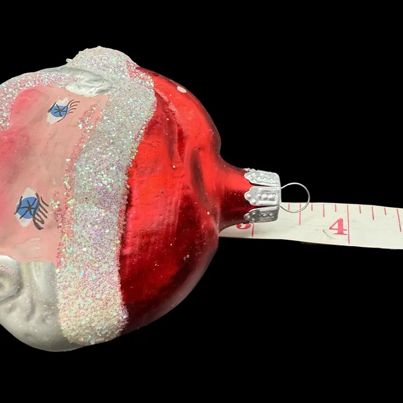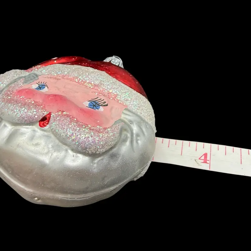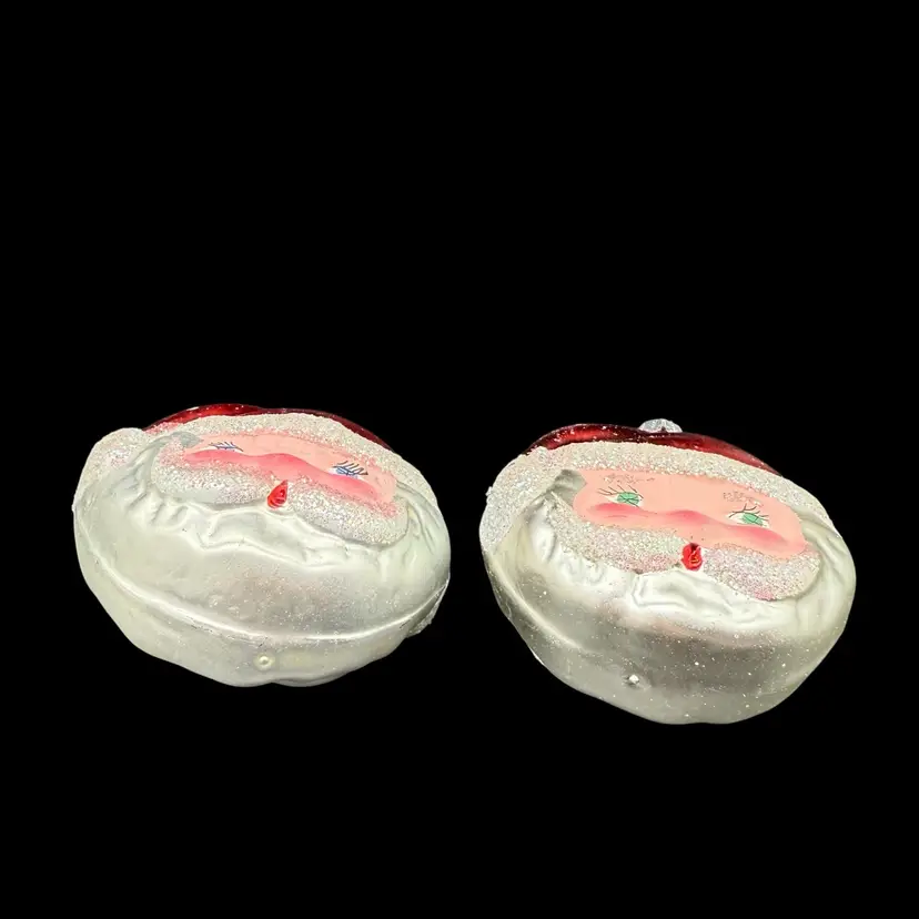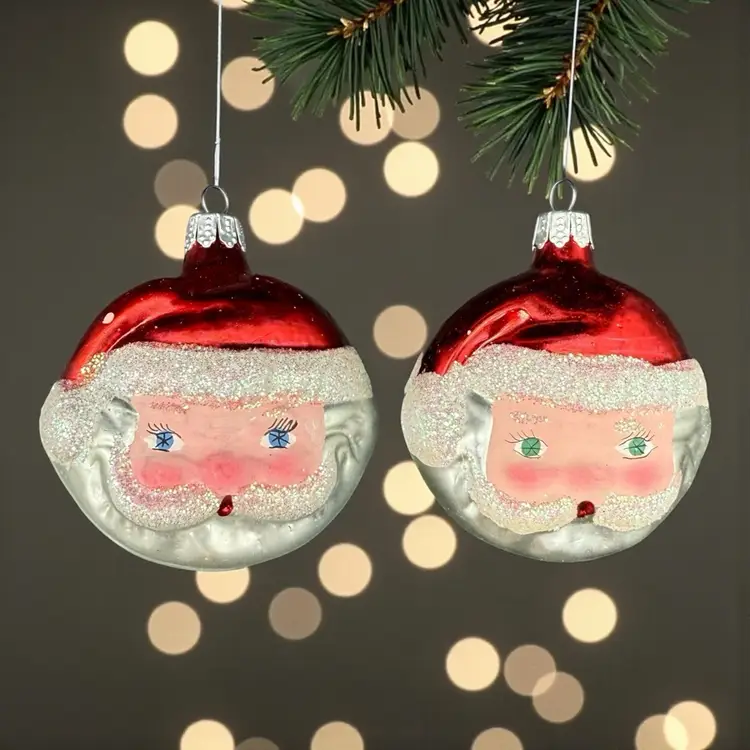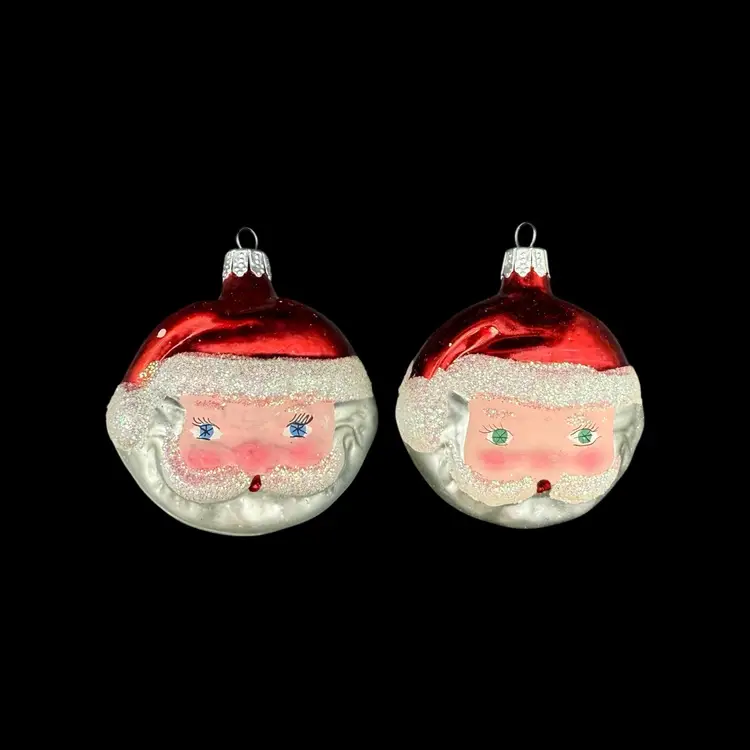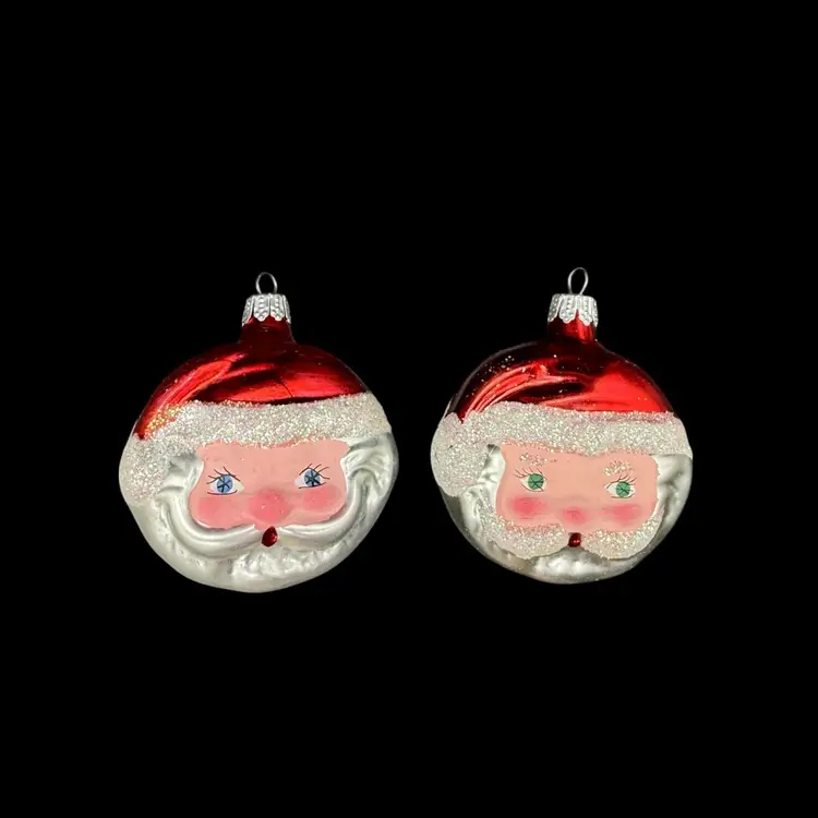 These Vintage Mercury Glass Santa Claus Double Sided Painted Face Christmas Ornaments are a charming addition to any holiday decor collection. Hand-blown glass and featuring a multicolor paint job, (one with blue eyes; one with green) these ornaments from the 1950s showcase a Santa Claus design that are sure to evoke nostalgia and festive cheer. The double-sided painted faces add a unique touch to these vintage ornaments, making them a standout addition to your Christmas celebrations.