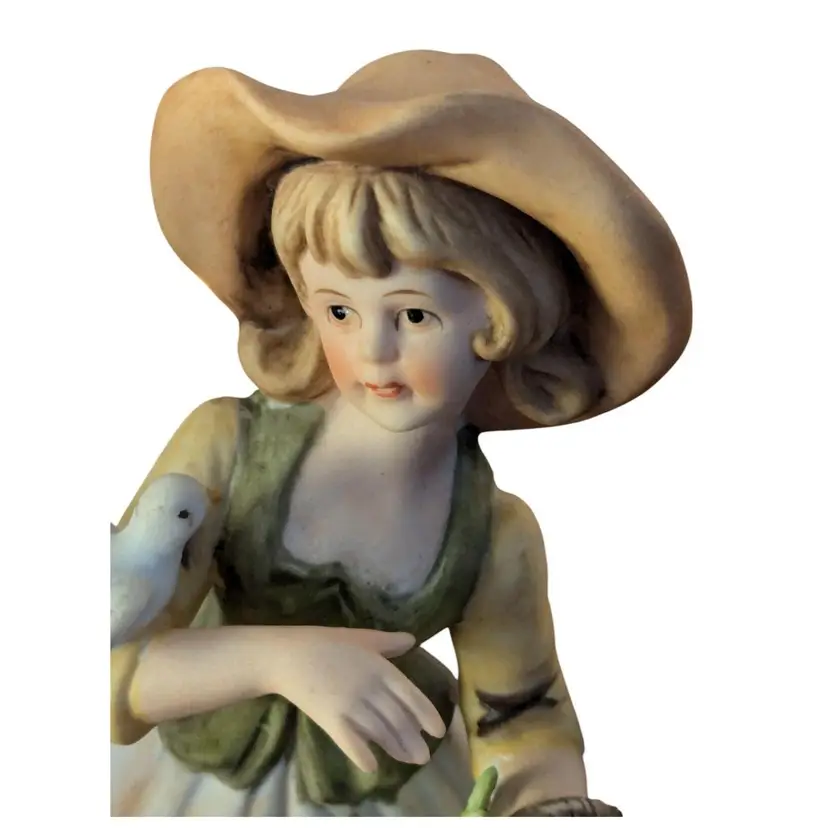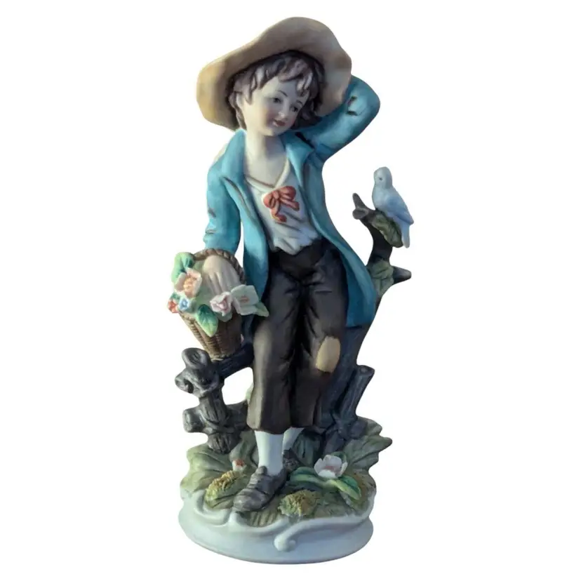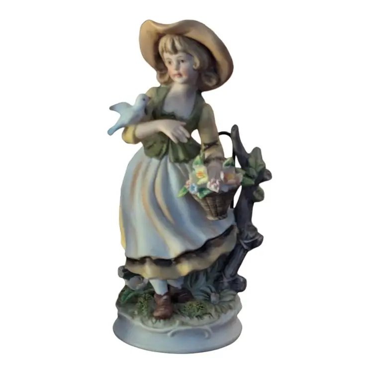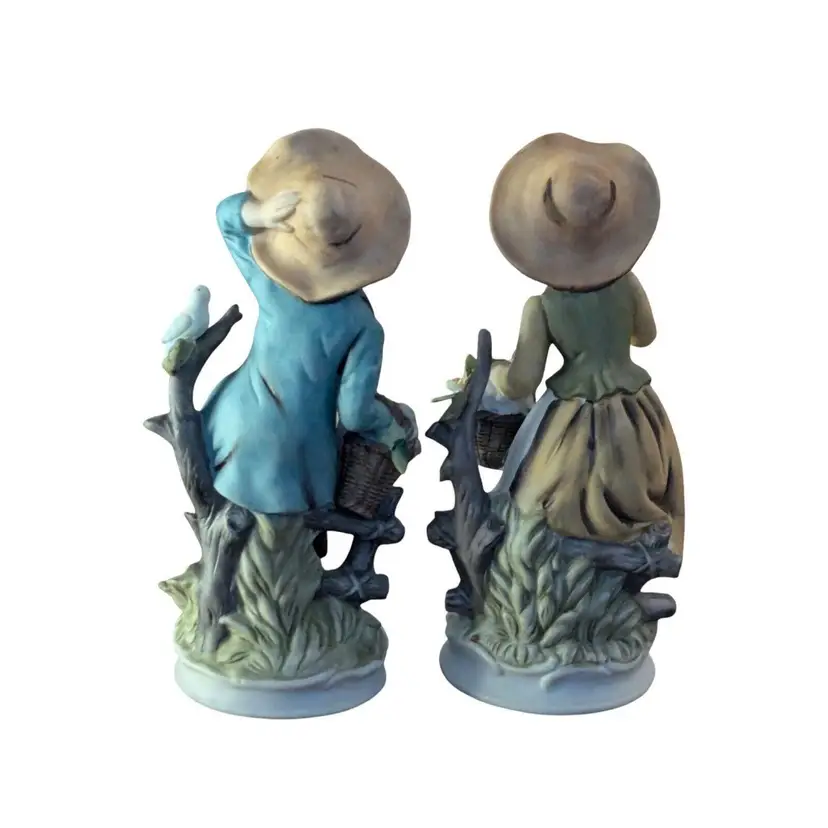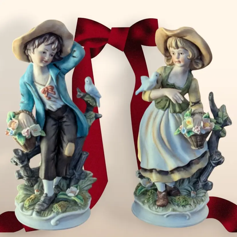 Add a touch of country charm to your decor with this set of two vintage Napcoware porcelain figurines. These 8-inch figurines feature a boy and girl with birds, perfect for any room in your home. The multicolor design and matte finish make these figurines a unique addition to your collection.