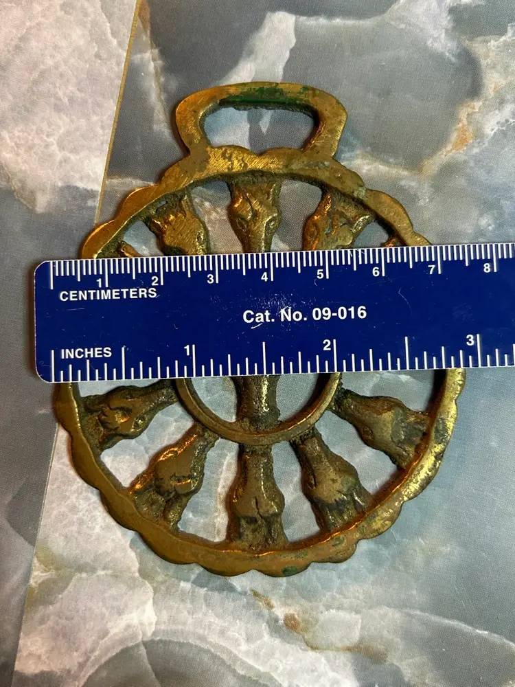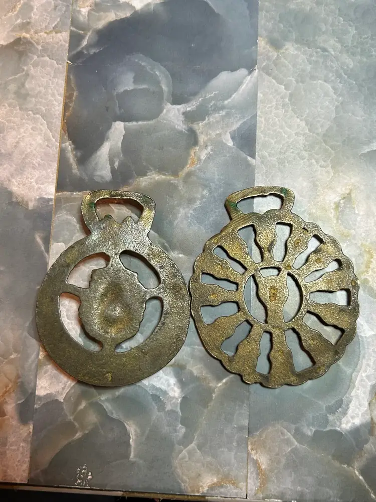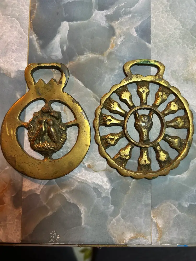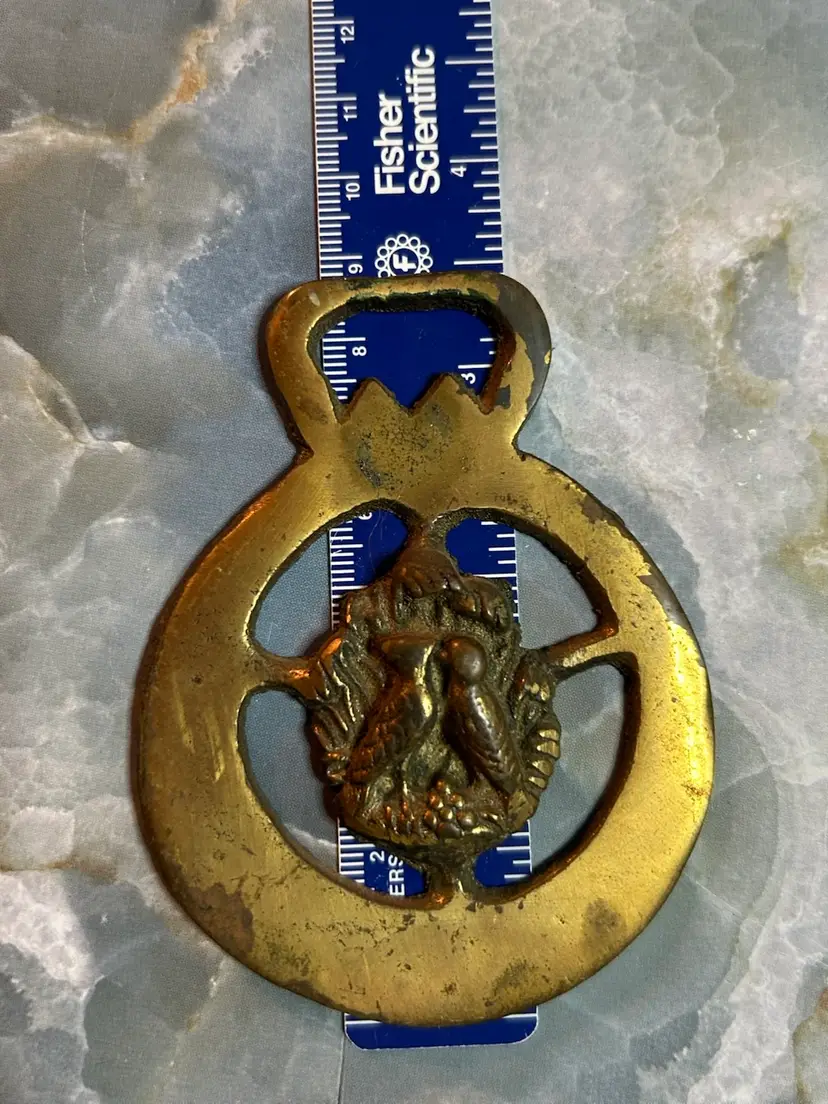 Vintage horse harness brass bridle ornaments featuring two turtle doves, and a circular, sun-like pattern surrounding a central horse head motif. Please see photos as they are part of the description.