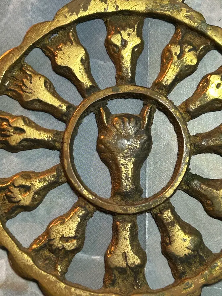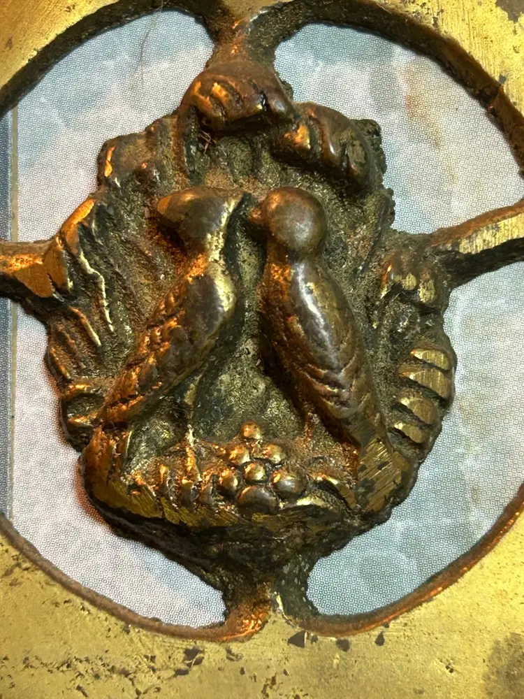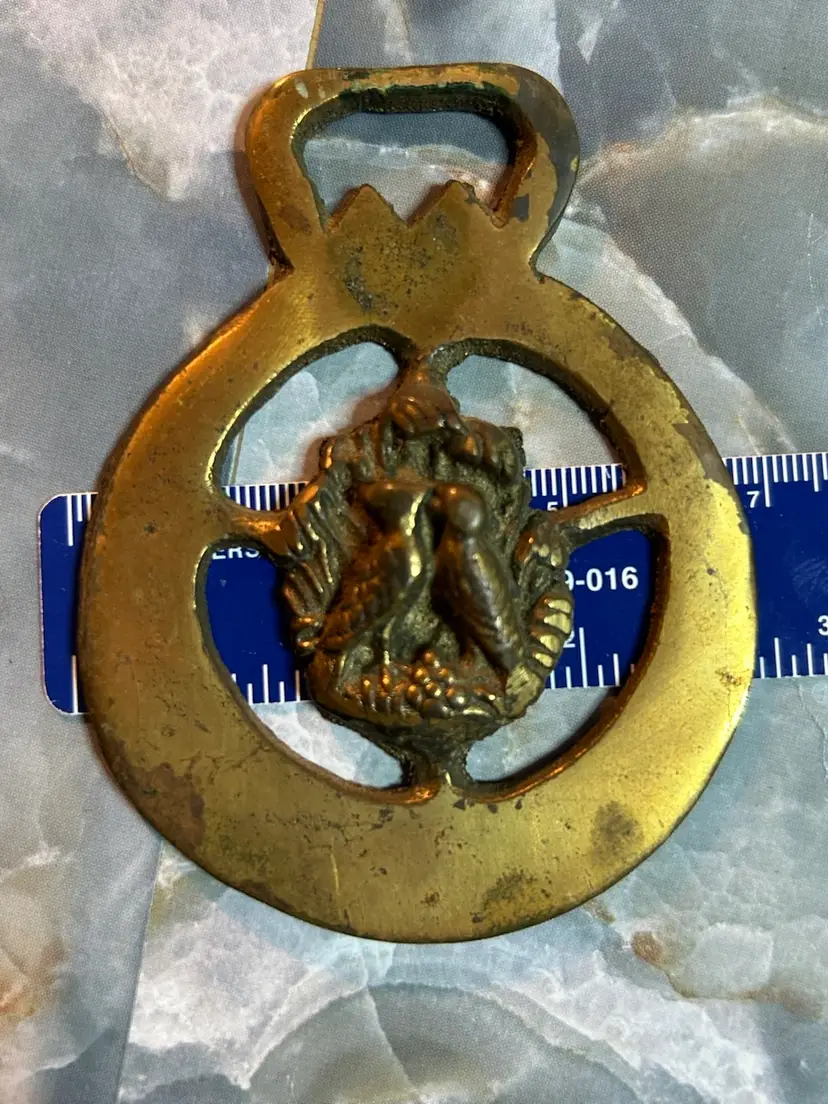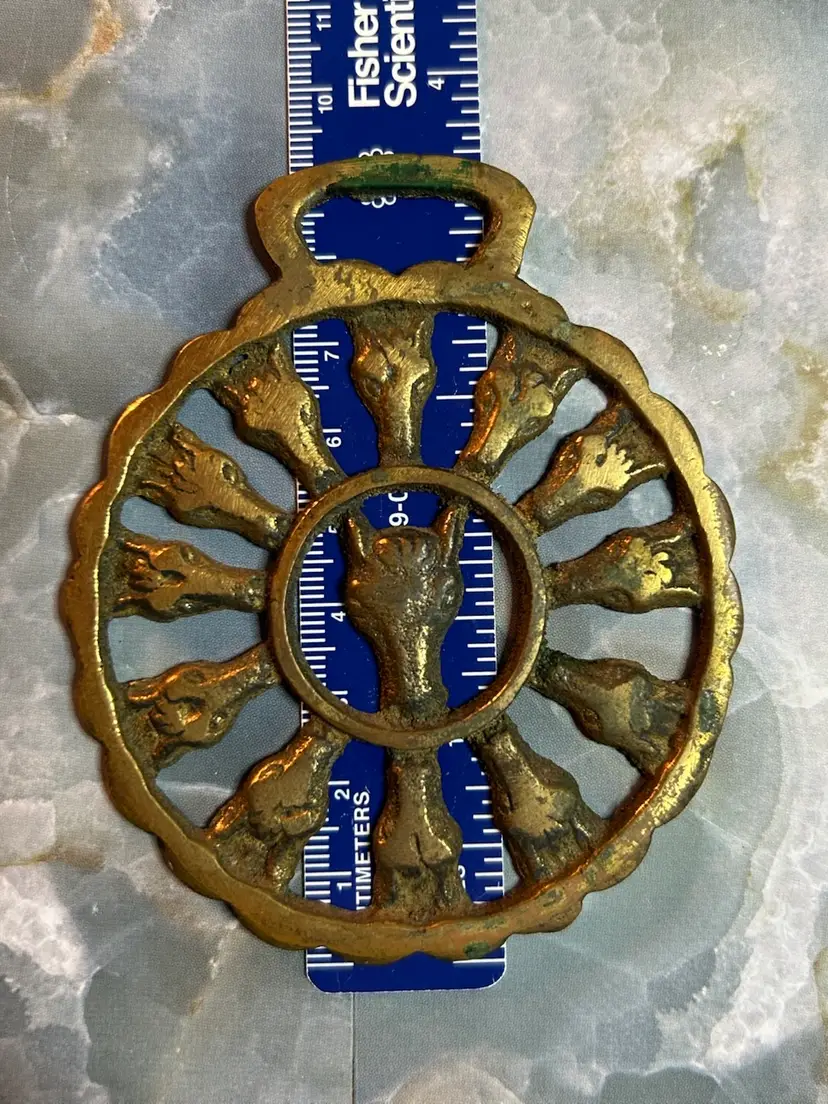 Vintage horse harness brass bridle ornaments featuring two turtle doves, and a circular, sun-like pattern surrounding a central horse head motif. Please see photos as they are part of the description.