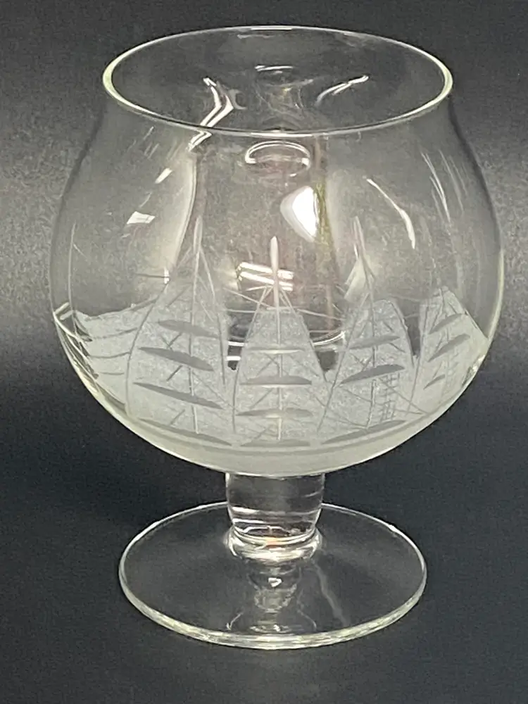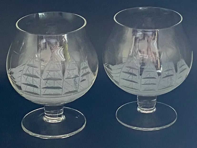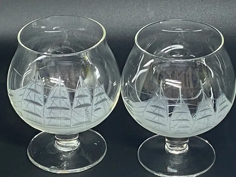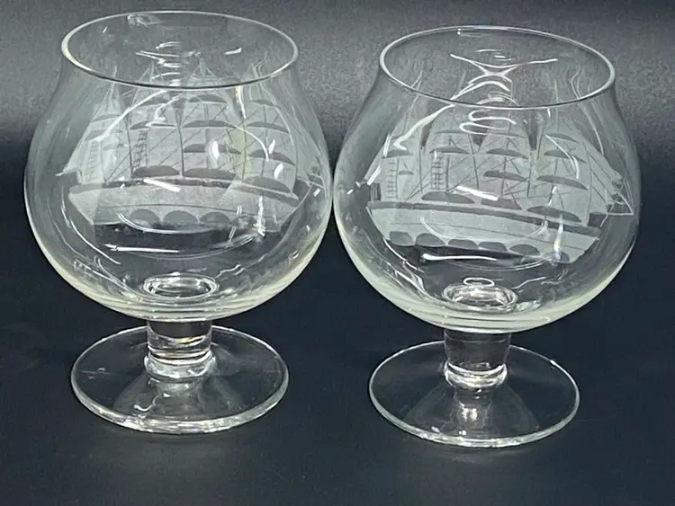 The product is a set of two vintage Toscany etched crystal brandy snifters with a clapper ship design. These nautical-themed glassware pieces are perfect for all occasions and are made of clear crystal. The brandy/cognac snifters are round in shape and stand at 4.25 inches tall, each weighing 4 ounces. The intricate etched design and vintage appeal make them a unique and elegant addition to any glassware collection.
